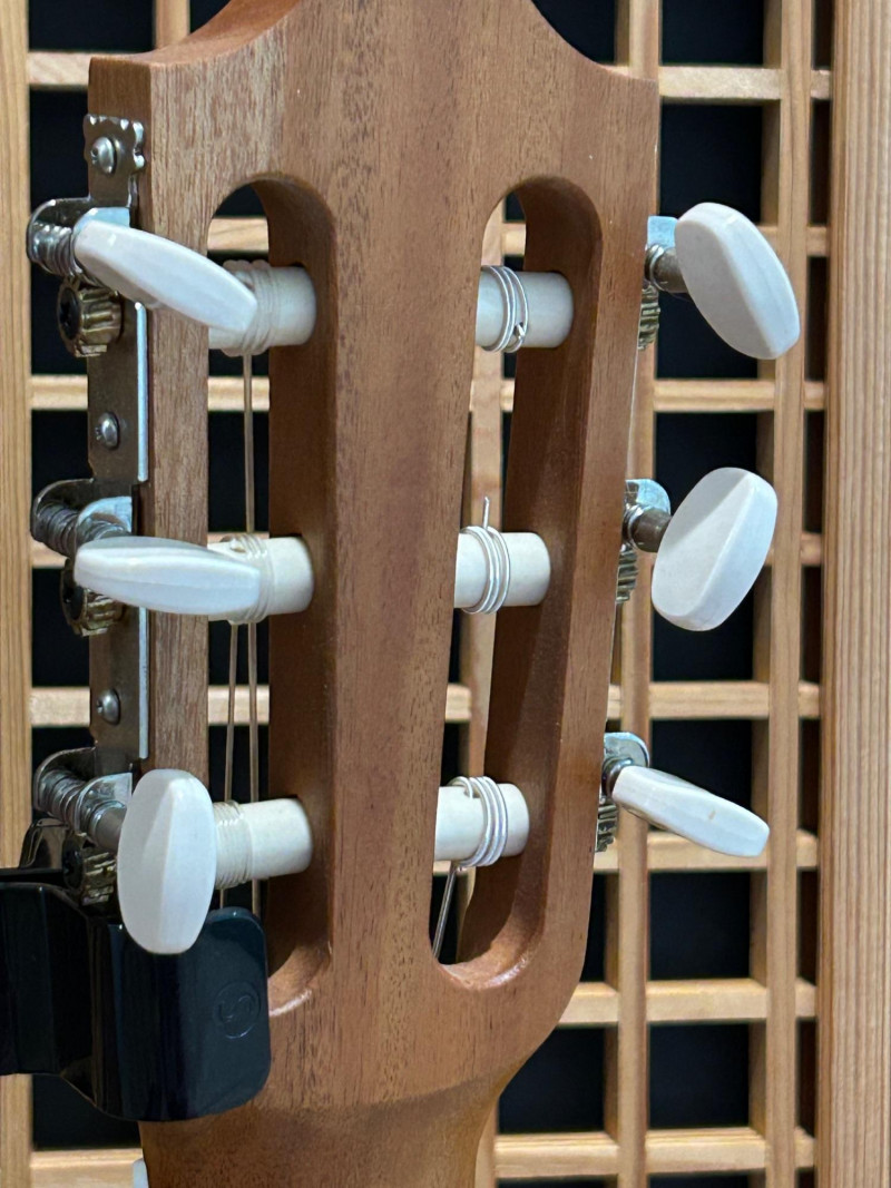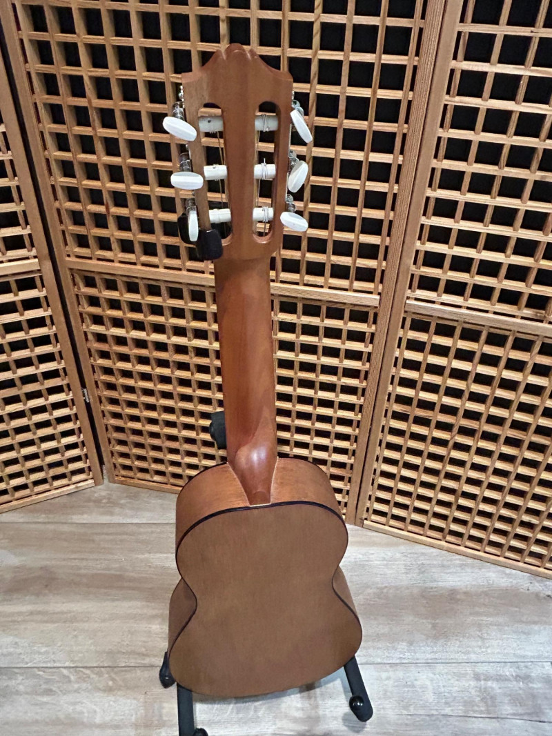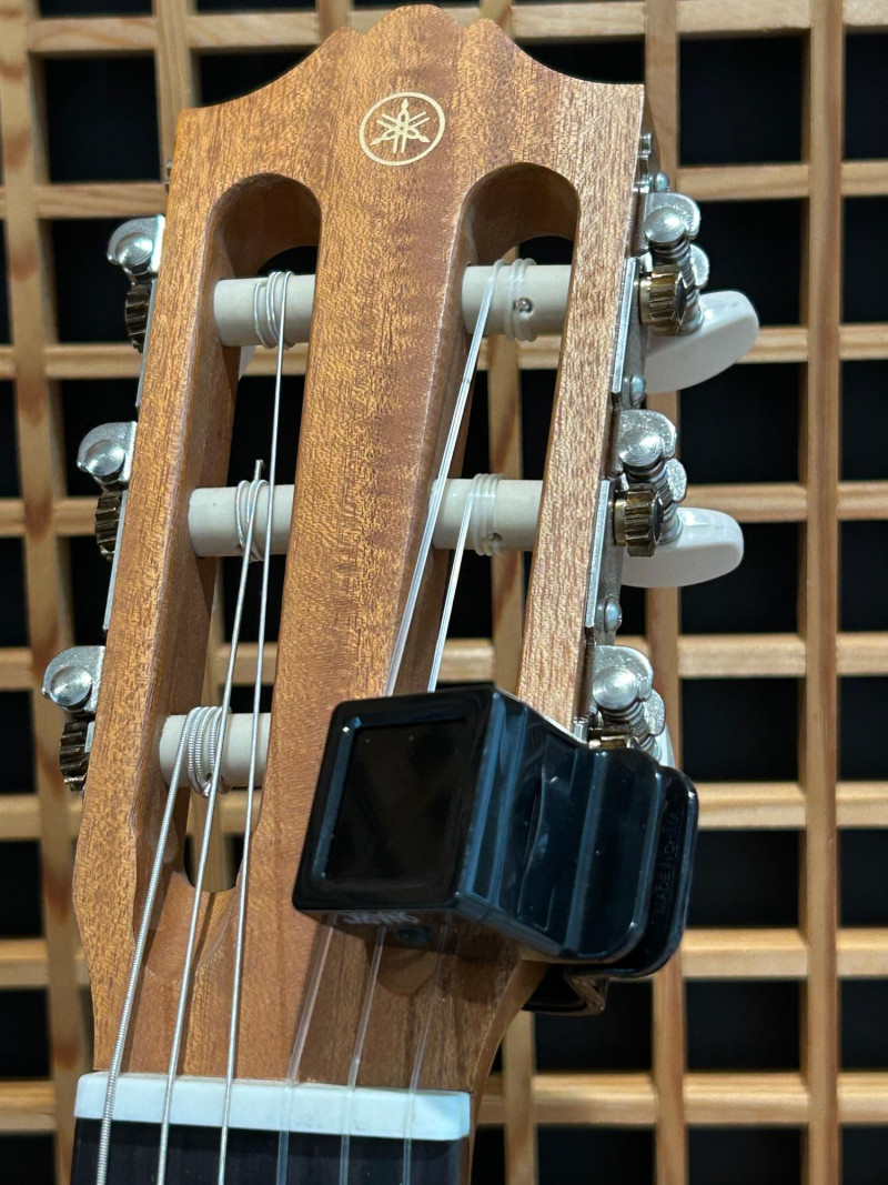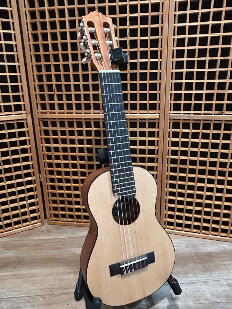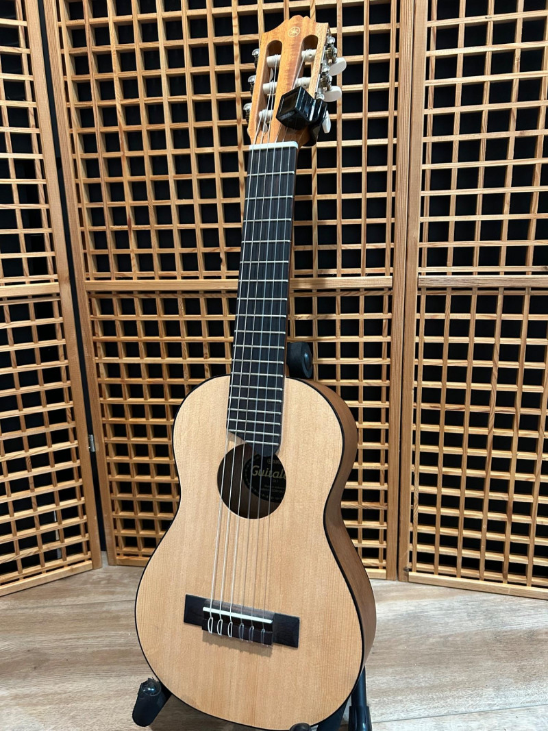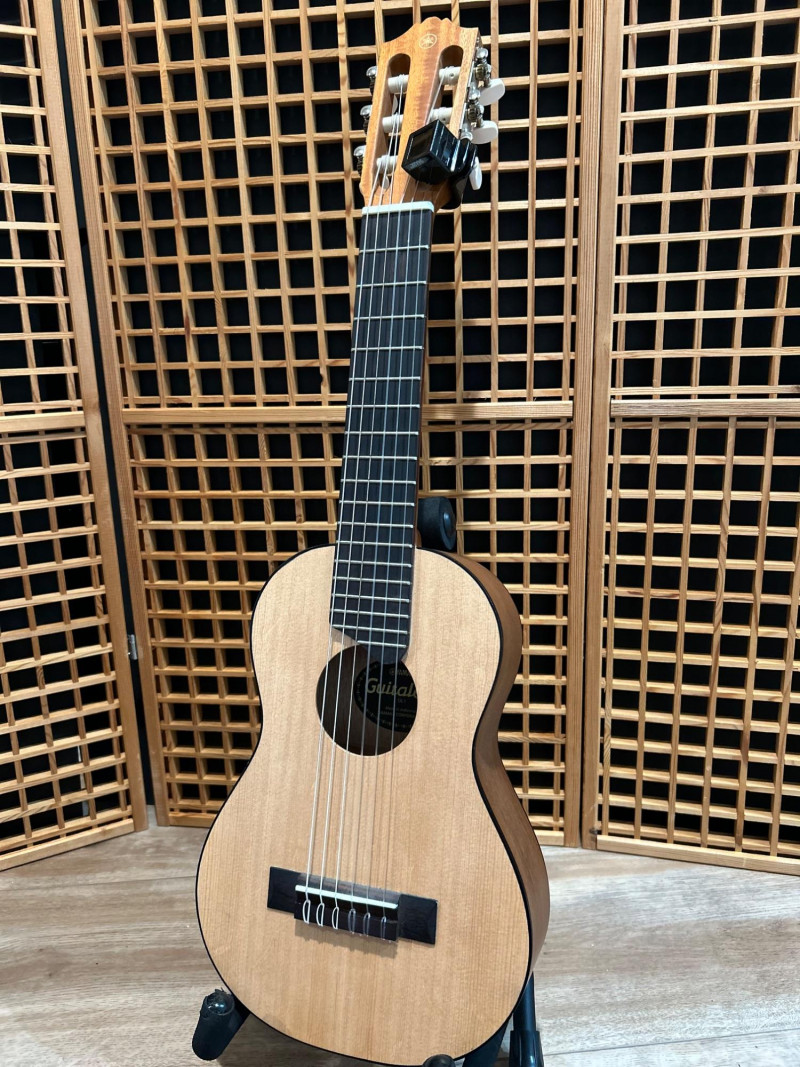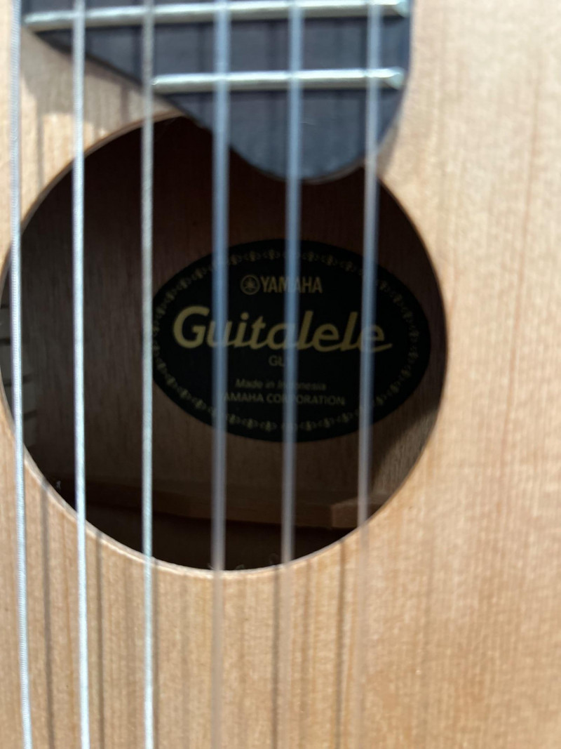 Offered is a Yamaha Guitalele GL1, a compact six-string instrument that blends the portability of a ukulele with the tuning and playability of a classical guitar. This model is well-known as a travel-friendly guitar alternative, ideal for practice, casual playing, or taking on the go. The natural wood finish, slotted headstock, and nylon strings give it a traditional classical look, while its smaller body makes it easy to handle and store. The interior label clearly identifies the instrument as a Yamaha Guitalele GL1, manufactured in Indonesia by Yamaha Corporation. A clip-on tuner is attached at the headstock (as shown in photos). Brand: Yamaha Model: Guitalele GL1 Type: 6-string travel / mini classical guitar Strings: Nylon Body Finish: Natural wood Headstock: Slotted classical style Label: “Guitalele GL1 – Made in Indonesia – Yamaha Corporation” (visible inside body) Country of Manufacture: Indonesia Included: Guitar only (clip-on tuner attached)Item Details:
