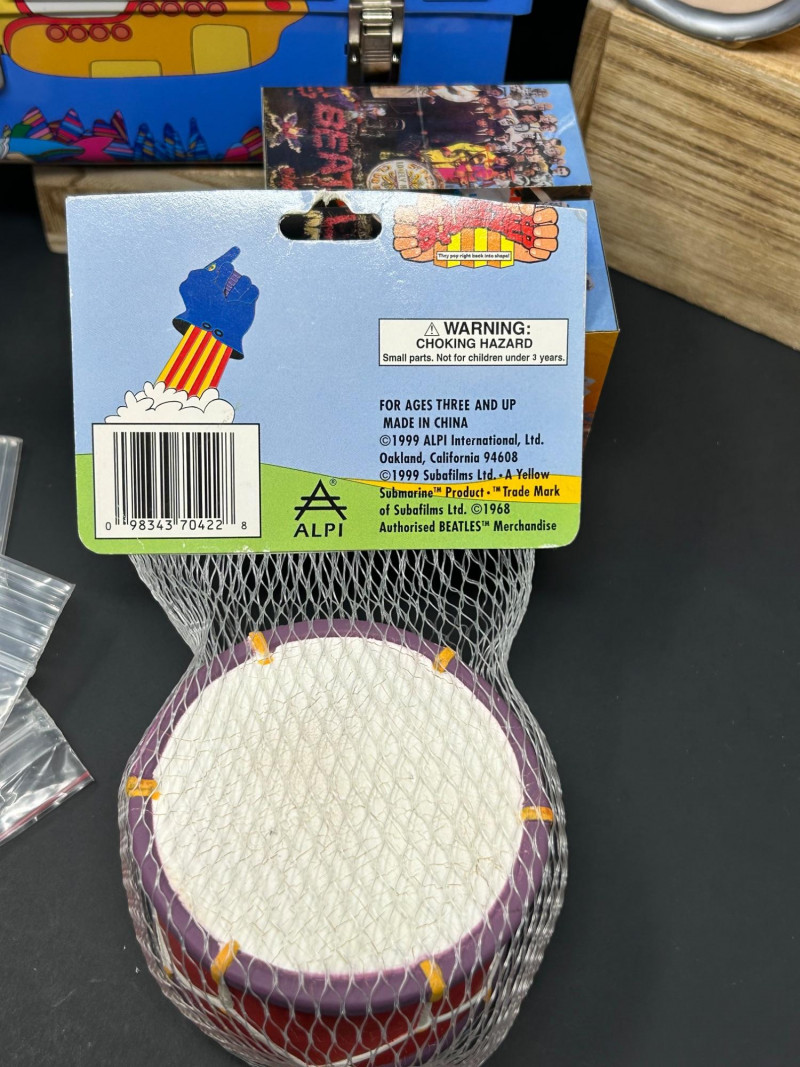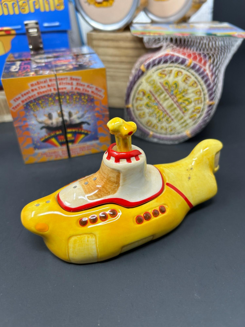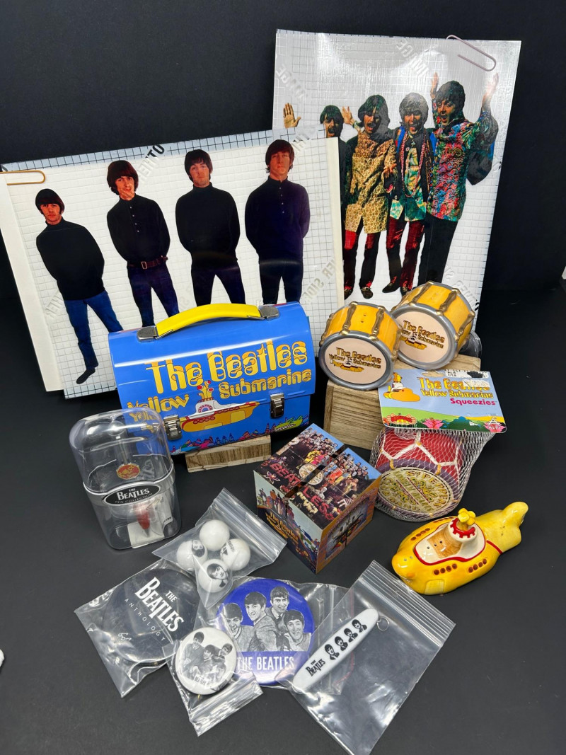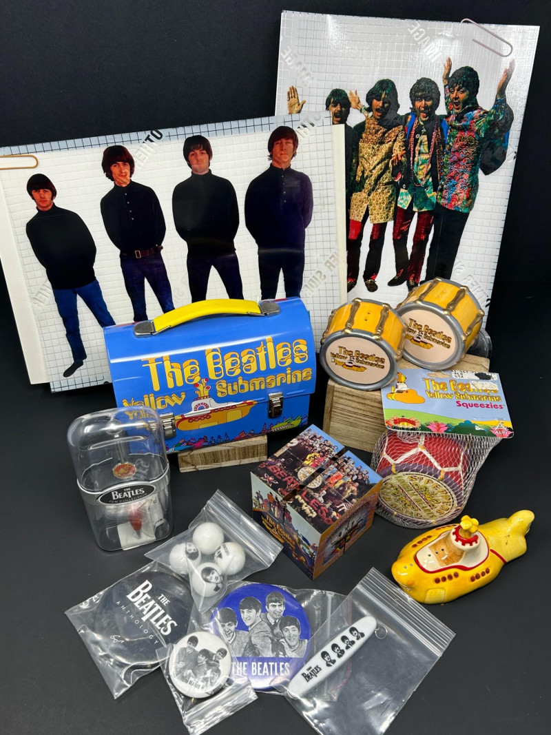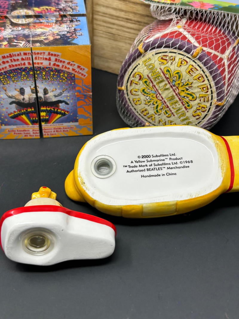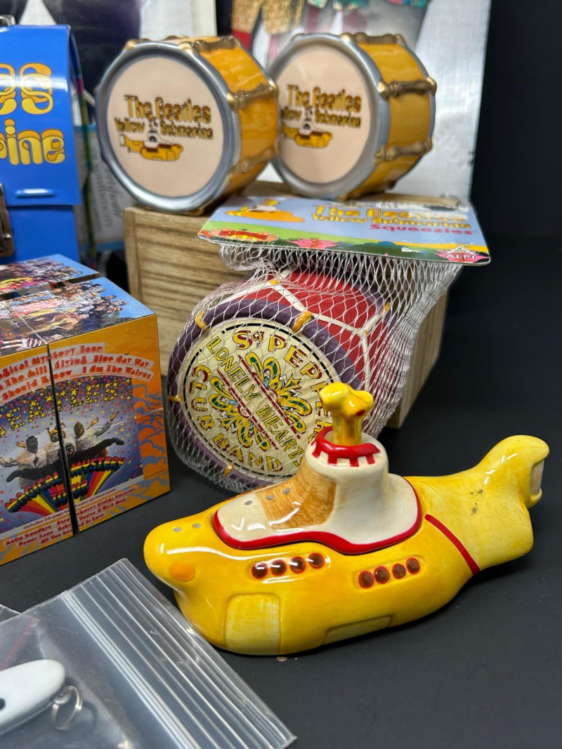 A vibrant, multi-piece collection celebrating the psychedelic world of Yellow Submarine. This curated lot brings together officially licensed Beatles merchandise spanning the late 1990s to early 2000s, featuring playful display pieces, desk collectibles, novelty items, and pop-art ephemera. Highlights include a Hallmark limited-edition lunch box with certificate, Yellow Submarine–themed ceramic and squeeze items, a Beatles pen set, photo window clings, button pins, and more—perfect for collectors seeking a colorful, ready-to-display ensemble. Hallmark Limited Edition “School Days” Lunch Box Yellow Submarine Drum Squeeze Toy Yellow Submarine Ceramic Pieces (2) The Beatles Pen Collection Beatles Vinyl Album Art Cube / Puzzle Beatles Photo Window Clings (2 sheets) Beatles Button Pins & Small Accessories Licensing: Official Beatles merchandise; Subafilms / ALPI / Hallmark branding visible on packaging and item bases Era: Predominantly late 1990s–early 2000s (dates visible include ©1999–2000 Subafilms Ltd.) Materials: Metal (lunch box), ceramic (submarine figures), plastic/rubber (novelties), paper/card (clings, packaging) Condition: Overall very good collectible condition; light handling wear consistent with age. Original packaging present for several items (see photos). Display Appeal: Bold Yellow Submarine colors and graphics—ideal for shelving, music rooms, or pop-art displays.What’s Included:
