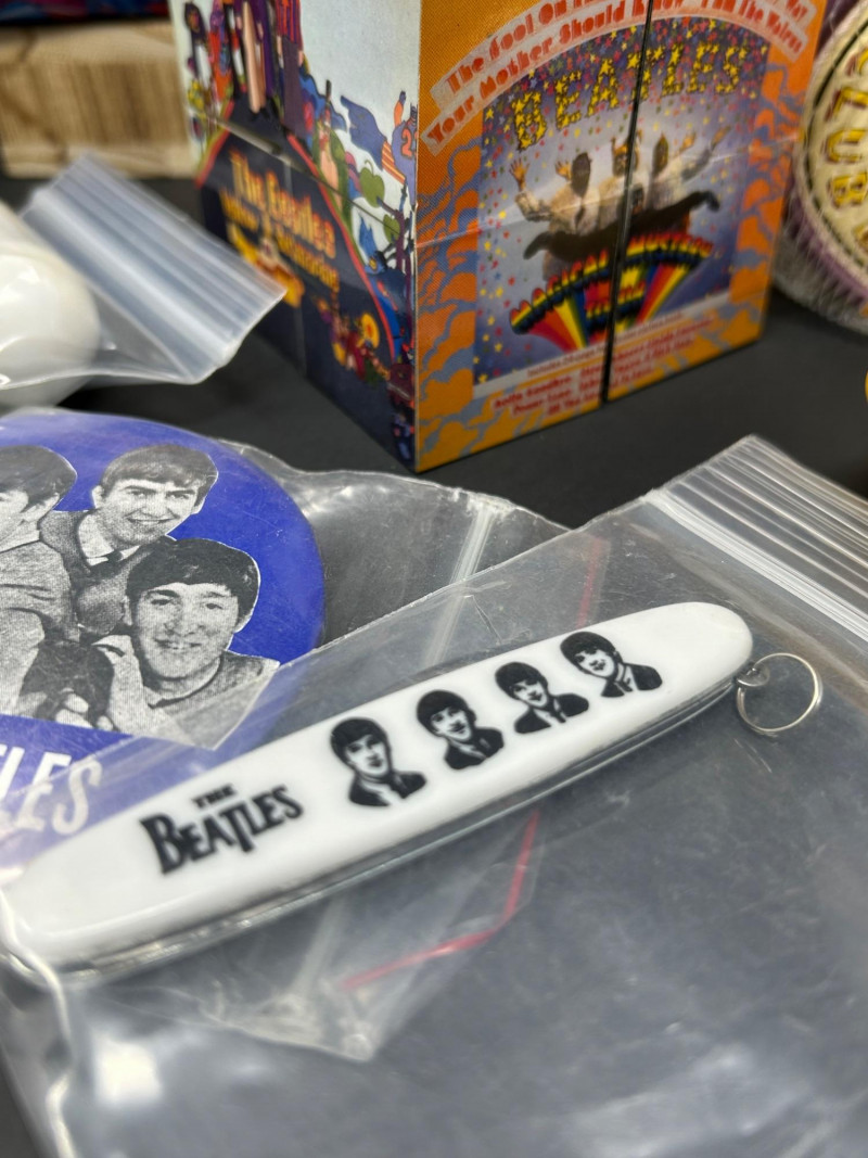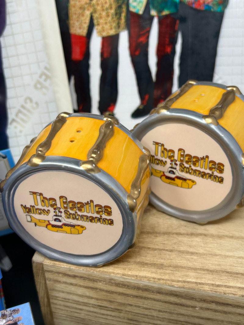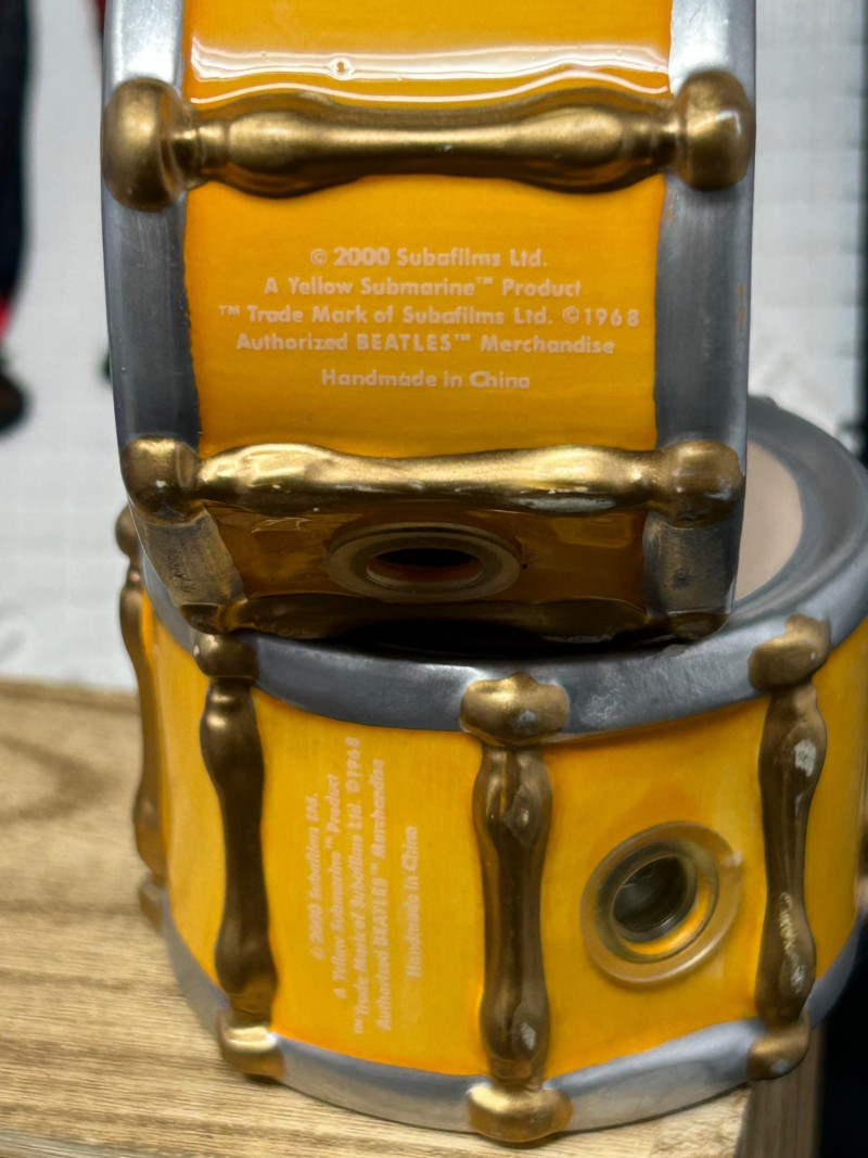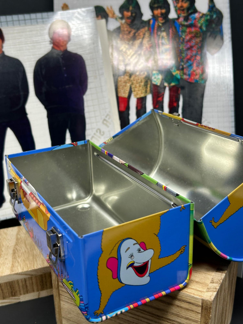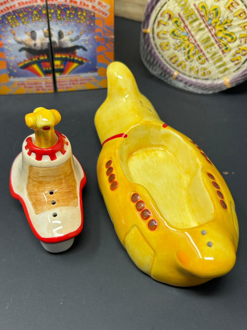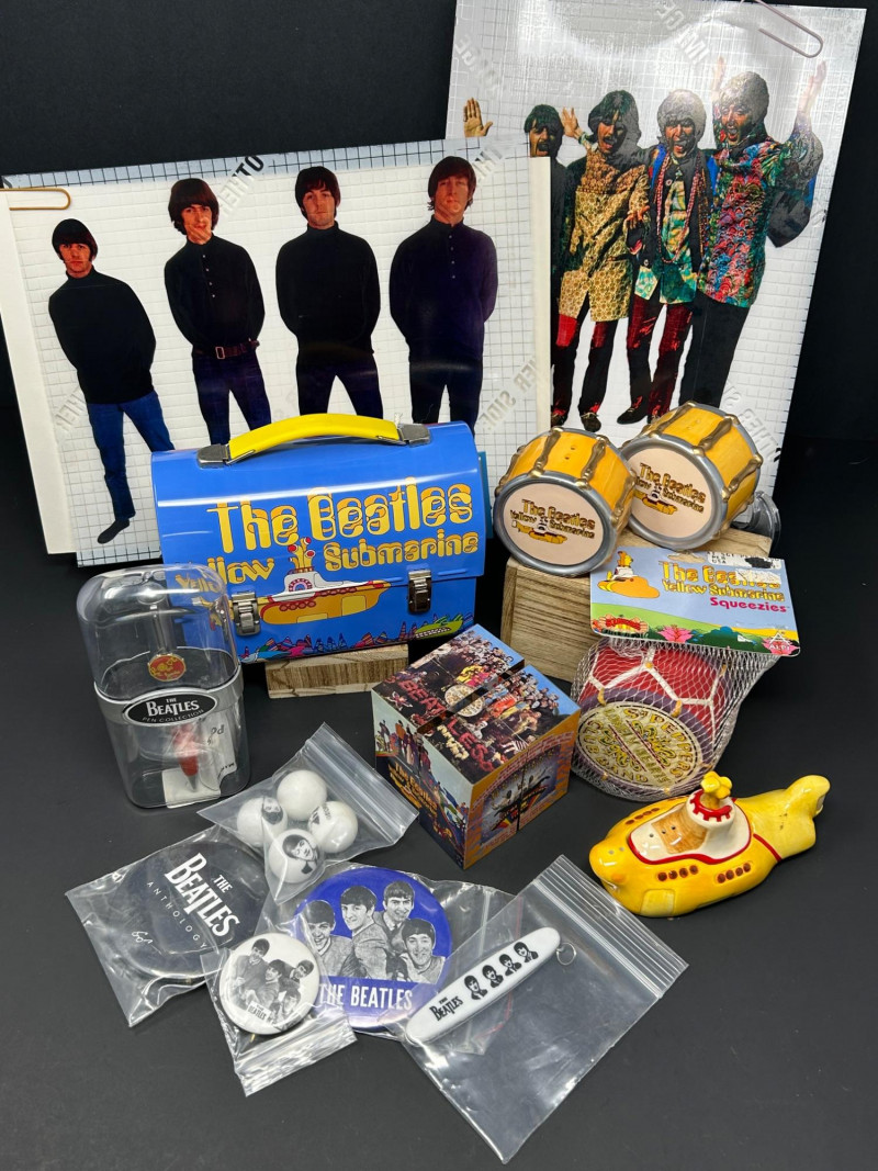 A vibrant, multi-piece collection celebrating the psychedelic world of Yellow Submarine. This curated lot brings together officially licensed Beatles merchandise spanning the late 1990s to early 2000s, featuring playful display pieces, desk collectibles, novelty items, and pop-art ephemera. Highlights include a Hallmark limited-edition lunch box with certificate, Yellow Submarine–themed ceramic and squeeze items, a Beatles pen set, photo window clings, button pins, and more—perfect for collectors seeking a colorful, ready-to-display ensemble. Hallmark Limited Edition “School Days” Lunch Box Yellow Submarine Drum Squeeze Toy Yellow Submarine Ceramic Pieces (2) The Beatles Pen Collection Beatles Vinyl Album Art Cube / Puzzle Beatles Photo Window Clings (2 sheets) Beatles Button Pins & Small Accessories Licensing: Official Beatles merchandise; Subafilms / ALPI / Hallmark branding visible on packaging and item bases Era: Predominantly late 1990s–early 2000s (dates visible include ©1999–2000 Subafilms Ltd.) Materials: Metal (lunch box), ceramic (submarine figures), plastic/rubber (novelties), paper/card (clings, packaging) Condition: Overall very good collectible condition; light handling wear consistent with age. Original packaging present for several items (see photos). Display Appeal: Bold Yellow Submarine colors and graphics—ideal for shelving, music rooms, or pop-art displays.What’s Included: