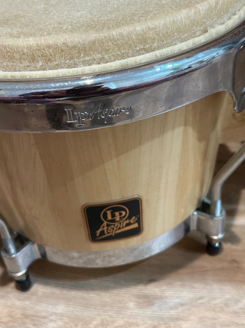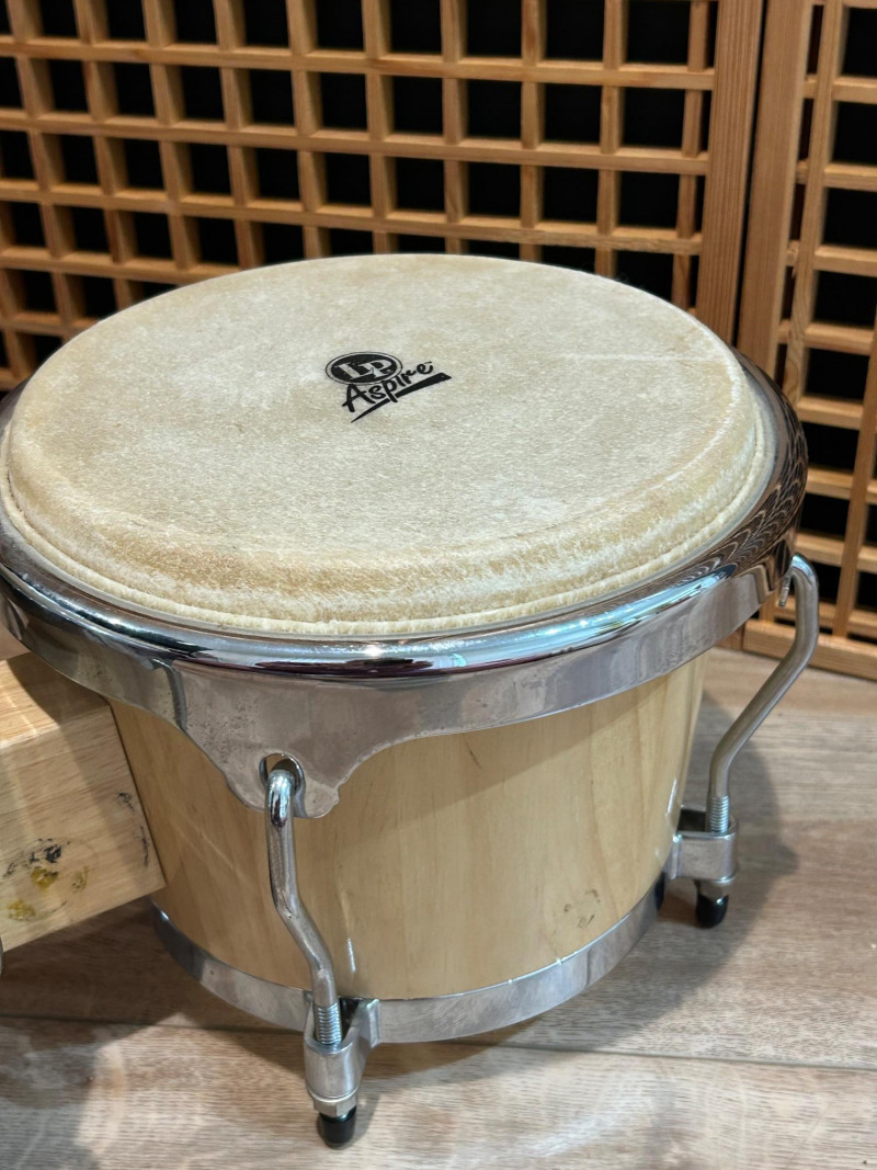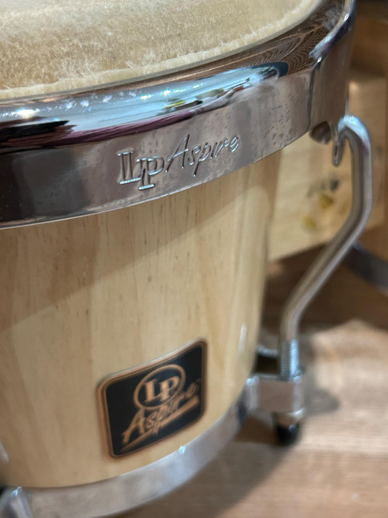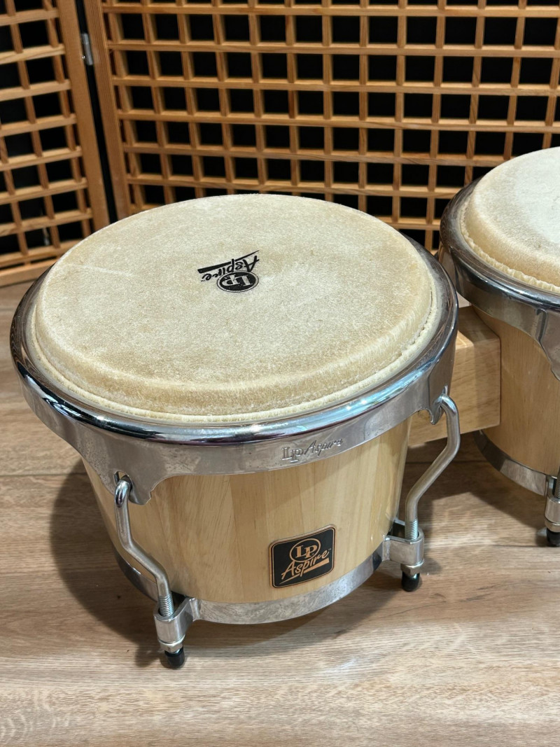 Offered is a pair of LP Aspire series bongos by Latin Percussion, crafted with natural wood shells and chrome-plated hardware. This set features the classic bongo configuration with responsive tone and durable construction, making it ideal for practice, live playing, or studio use. The bongos retain their original LP Aspire heads and hardware and show normal signs of use consistent with regular playing. A solid, great-sounding set from one of the most trusted names in percussion. Brand: Latin Percussion (LP) Series: Aspire Instrument: Bongos (Machos & Hembra) Shell Material: Natural wood Finish: Natural / light wood tone Hardware: Chrome-plated rims, tuning lugs, and mounting hardware Drum Heads: Original LP Aspire natural heads Logos & Markings: LP Aspire badge on shells “LP Aspire” stamped on chrome rims LP logo printed on drum heads Head Sizes: Large drum: 8.5″ diameter Small drum: 6″ diameter Height: Approximately 8″ tallItem Details: