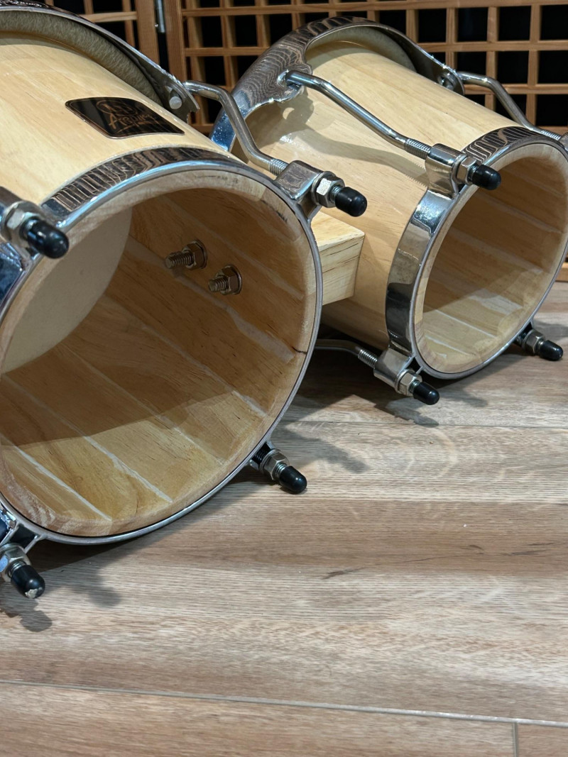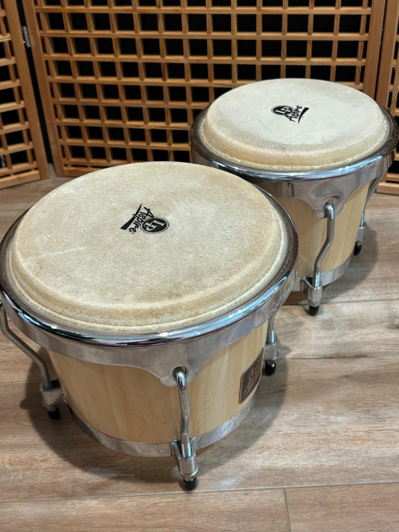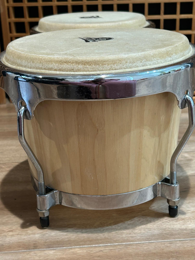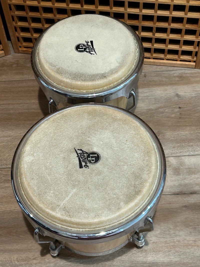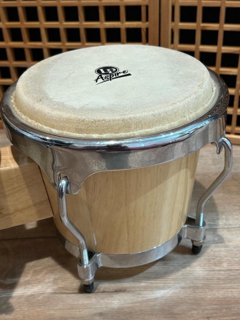Offered is a pair of LP Aspire series bongos by Latin Percussion, crafted with natural wood shells and chrome-plated hardware. This set features the classic bongo configuration with responsive tone and durable construction, making it ideal for practice, live playing, or studio use. The bongos retain their original LP Aspire heads and hardware and show normal signs of use consistent with regular playing. A solid, great-sounding set from one of the most trusted names in percussion. Brand: Latin Percussion (LP) Series: Aspire Instrument: Bongos (Machos & Hembra) Shell Material: Natural wood Finish: Natural / light wood tone Hardware: Chrome-plated rims, tuning lugs, and mounting hardware Drum Heads: Original LP Aspire natural heads Logos & Markings: LP Aspire badge on shells “LP Aspire” stamped on chrome rims LP logo printed on drum heads Head Sizes: Large drum: 8.5″ diameter Small drum: 6″ diameter Height: Approximately 8″ tallItem Details: