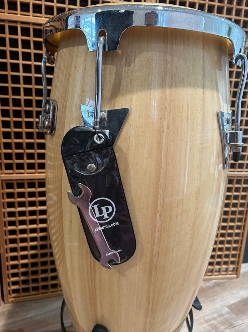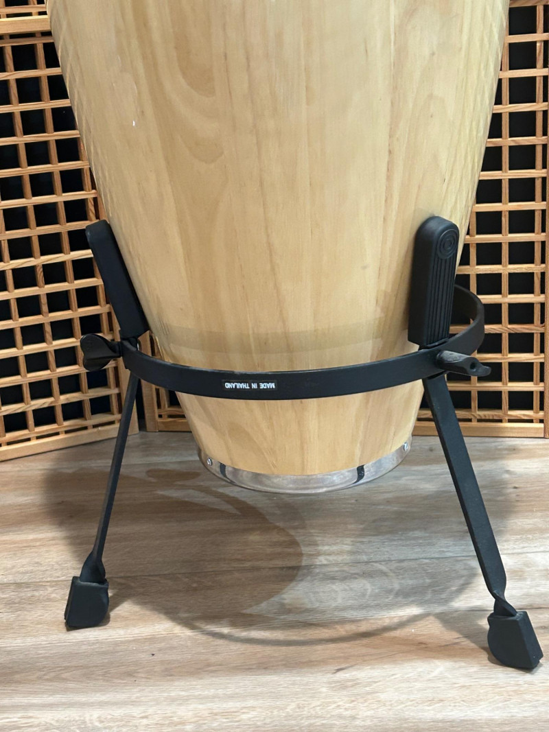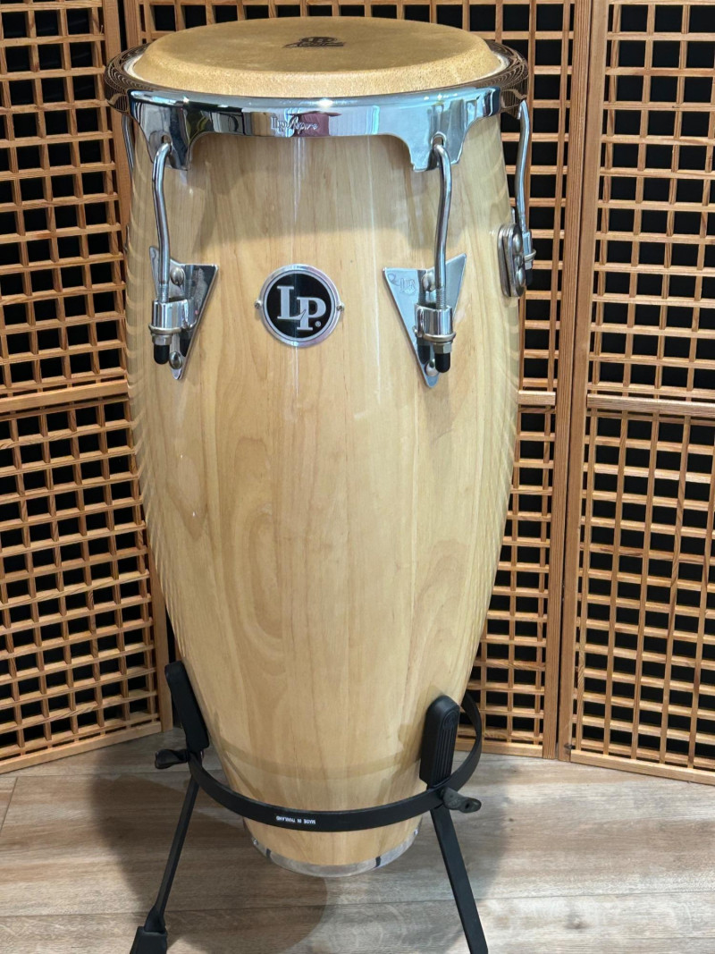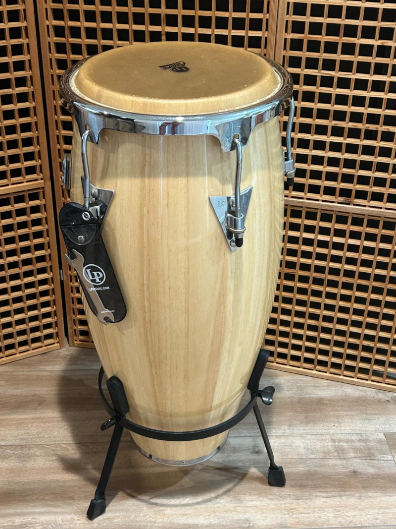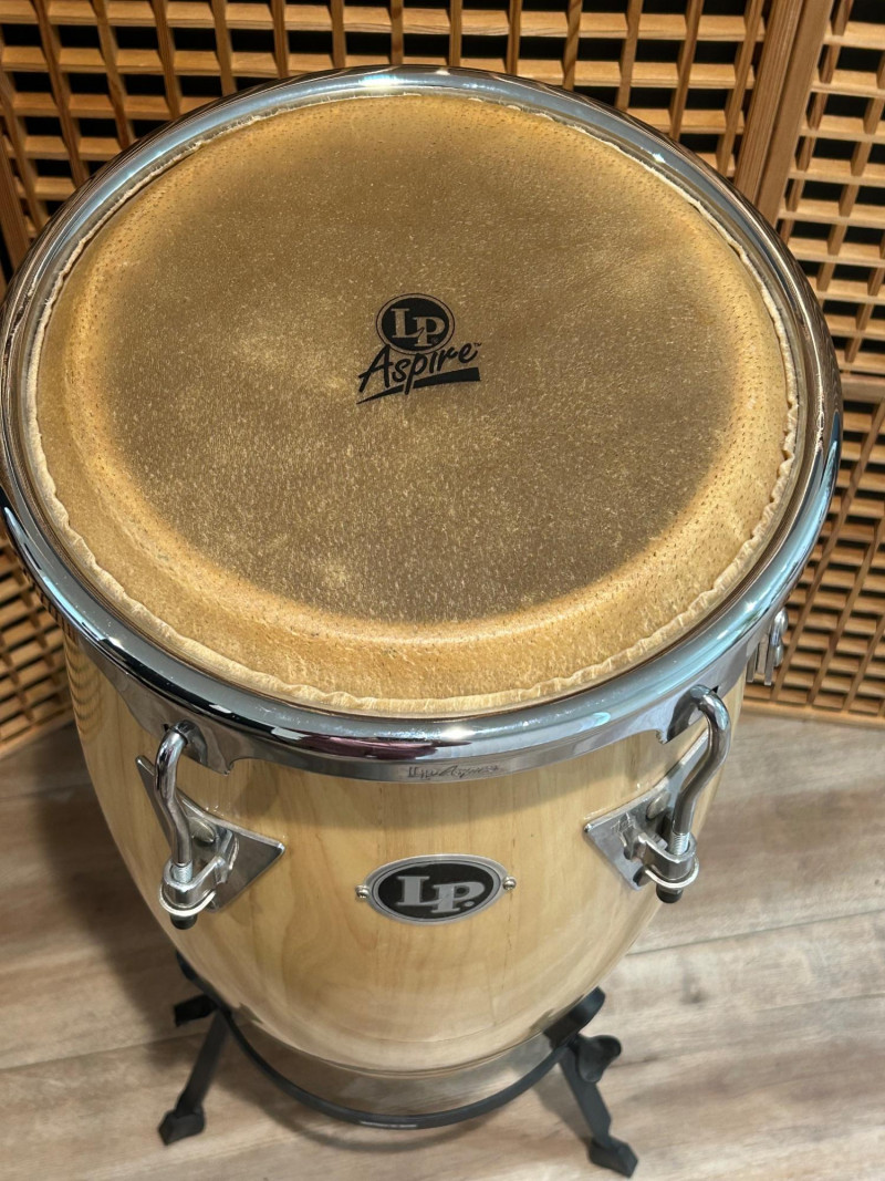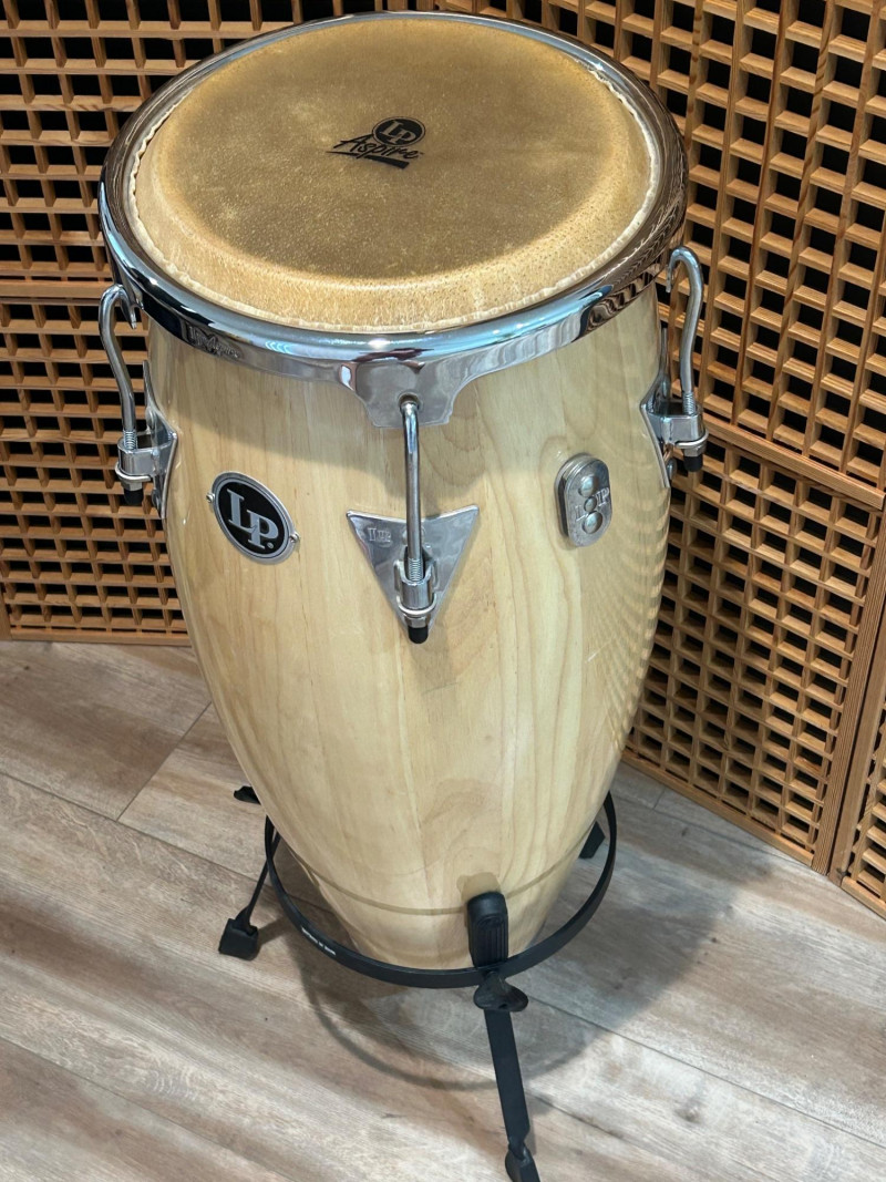 Offered here is an LP Aspire series conga drum in a natural wood finish, a well-regarded model from Latin Percussiondesigned for players who want authentic conga tone with reliable, gig-ready hardware. The drum features a stave-constructed wooden shell, chrome-plated tuning hardware, and a natural hide head bearing the LP Aspire logo. This conga includes a matching black metal stand, making it ready to play straight out of the box—ideal for practice rooms, studios, schools, or live performance setups. Overall condition appears very good, with light cosmetic wear consistent with normal use. Brand: LP (Latin Percussion) Series: Aspire Instrument: Conga Drum Shell: Natural wood stave construction Head: Natural hide (LP Aspire branded) Hardware: Chrome-plated lugs and rims Logo: LP badge on shell, Aspire branding on head and rim Stand: Included (black metal conga stand) Height: approx. 28 inches Head Diameter: approx. 11 inchesItem Details: