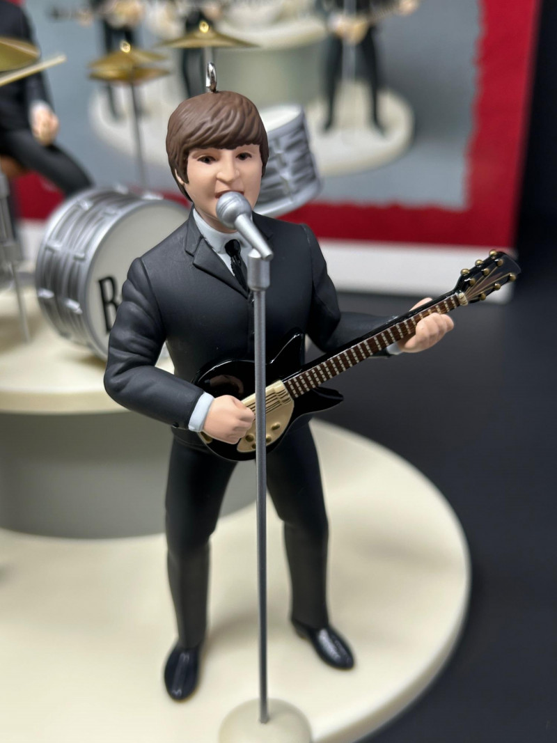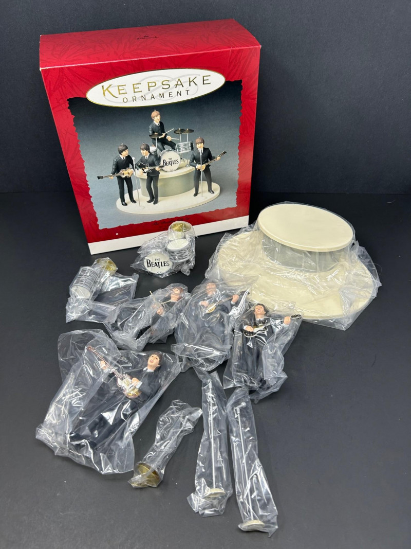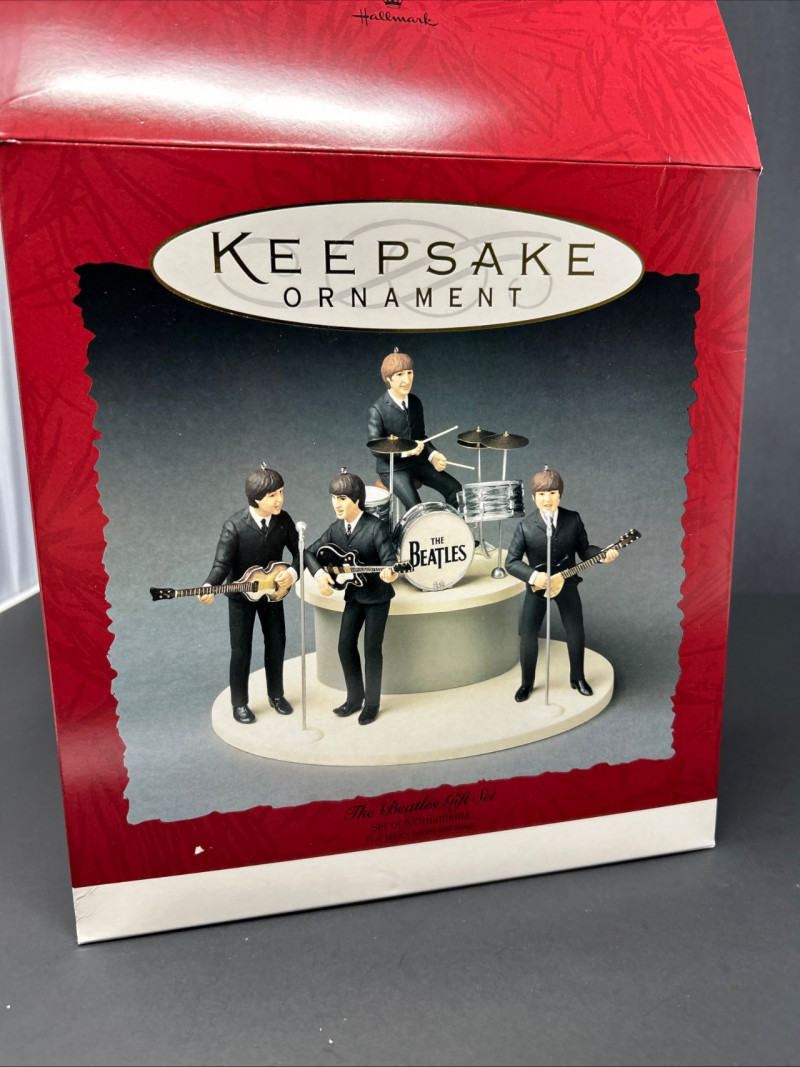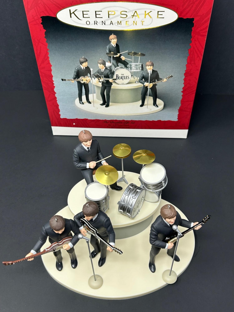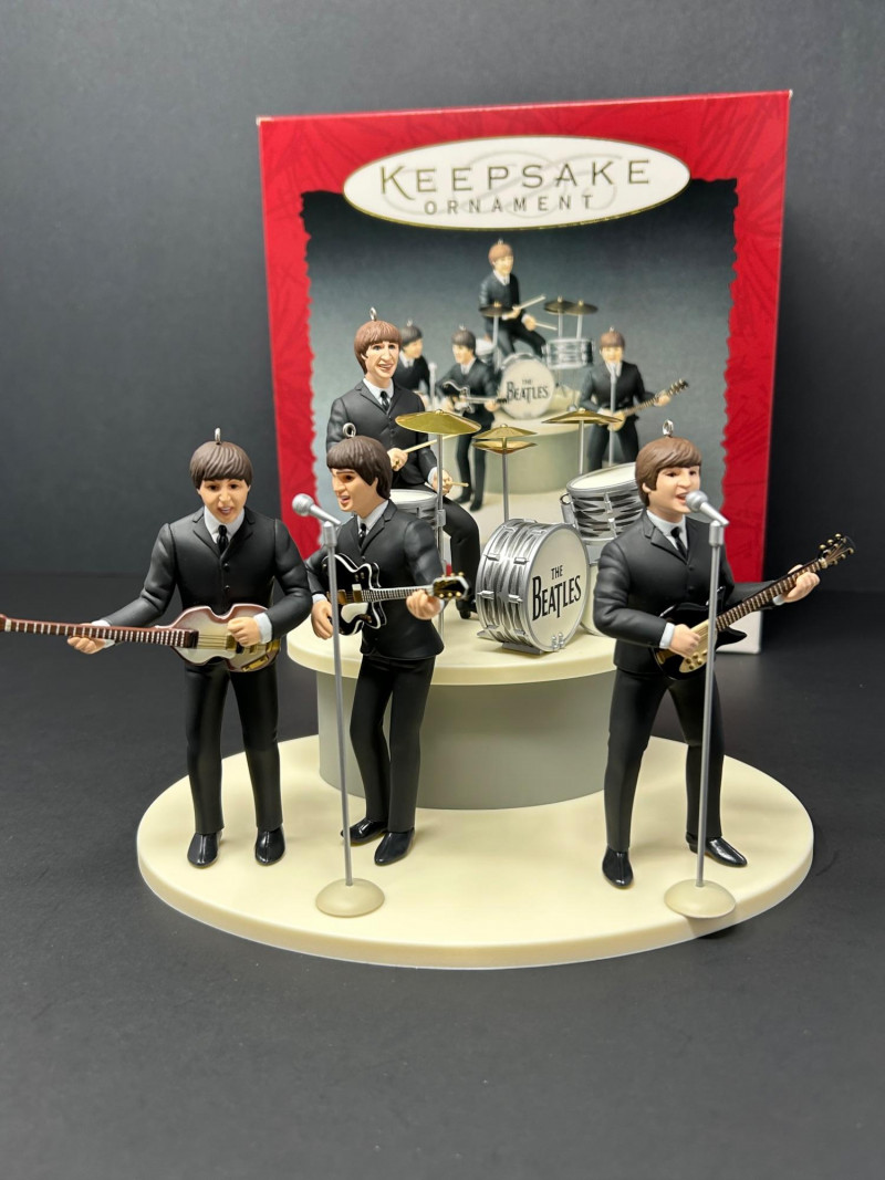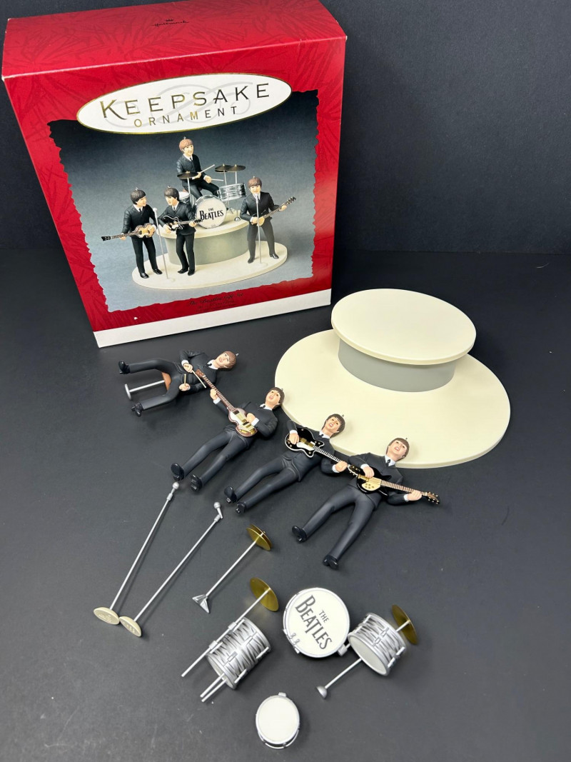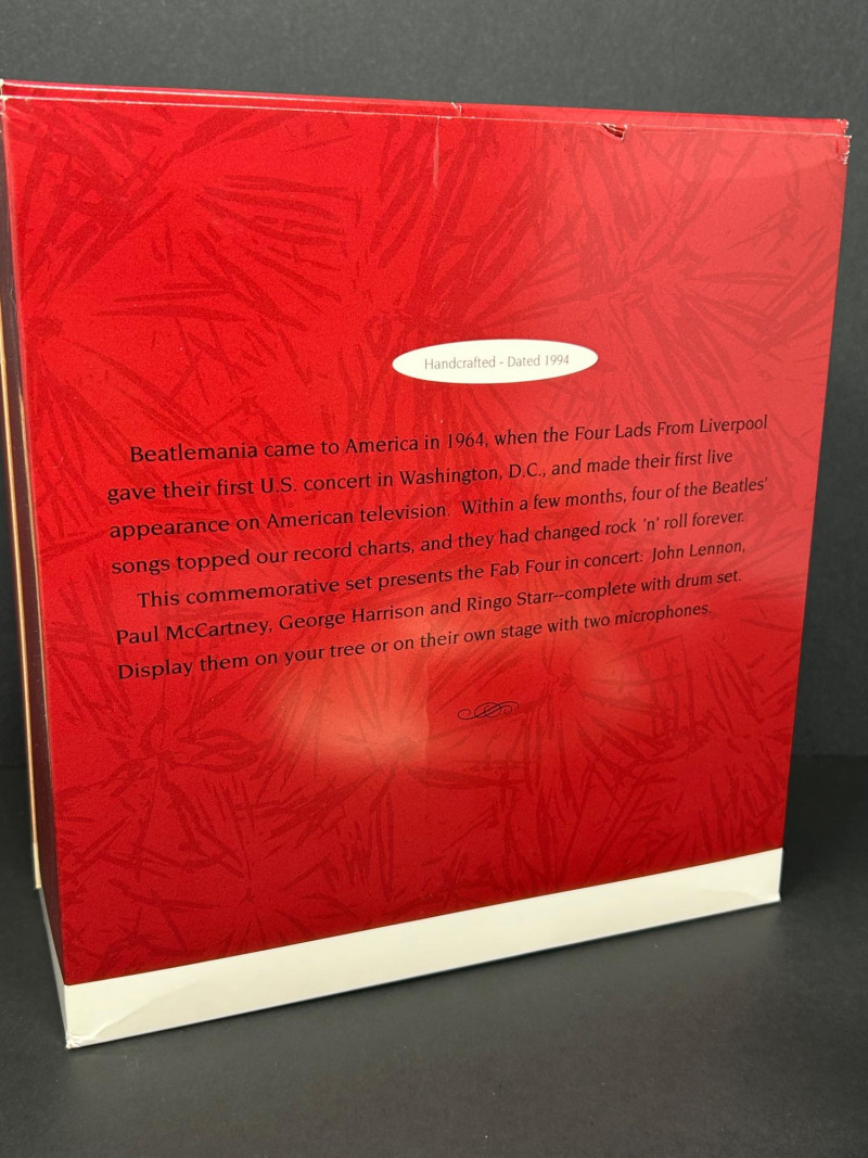 This collectible Hallmark Keepsake Ornament gift set commemorates the 30th Anniversary of The Beatles’ debut in America (1964–1994). The set features finely detailed figurines of the Fab Four performing live on stage, complete with instruments, microphones, and a multi-level display base. Produced in 1994 by Hallmark Cards, Inc. under license from Apple Corps Limited, this is a standout display piece for Beatles fans and music memorabilia collectors alike. The figures showcase classic early-era styling, with individual band members posed mid-performance. The underside markings and copyright stamps confirm authenticity and date. Original Hallmark Keepsake box is included, making this a highly desirable anniversary set. Brand: Hallmark Keepsake Ornament Year: 1994 Theme: The Beatles – 30th Anniversary of U.S. Debut Commemoration: 1964–1994 Set Includes: Four Beatles figurines (Paul McCartney, John Lennon, George Harrison, Ringo Starr) Instruments and microphones Drum kit with “The Beatles” logo Multi-level stage display base Material: Molded resin / plastic Marks & Stamps: “© Apple Corps Limited” “Hallmark Cards, Inc.” “1994 Hallmark” Packaging: Original Hallmark Keepsake box includedItem Details: