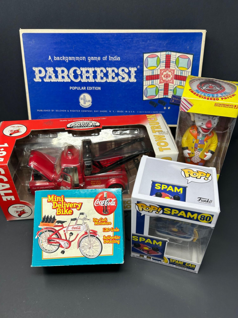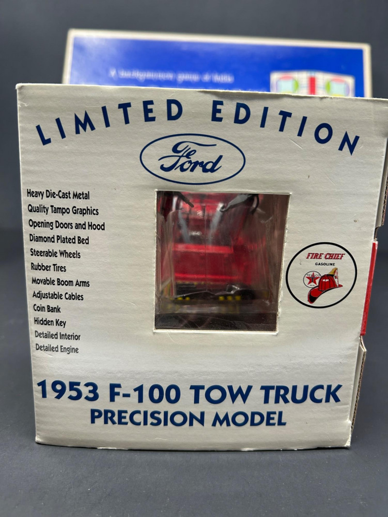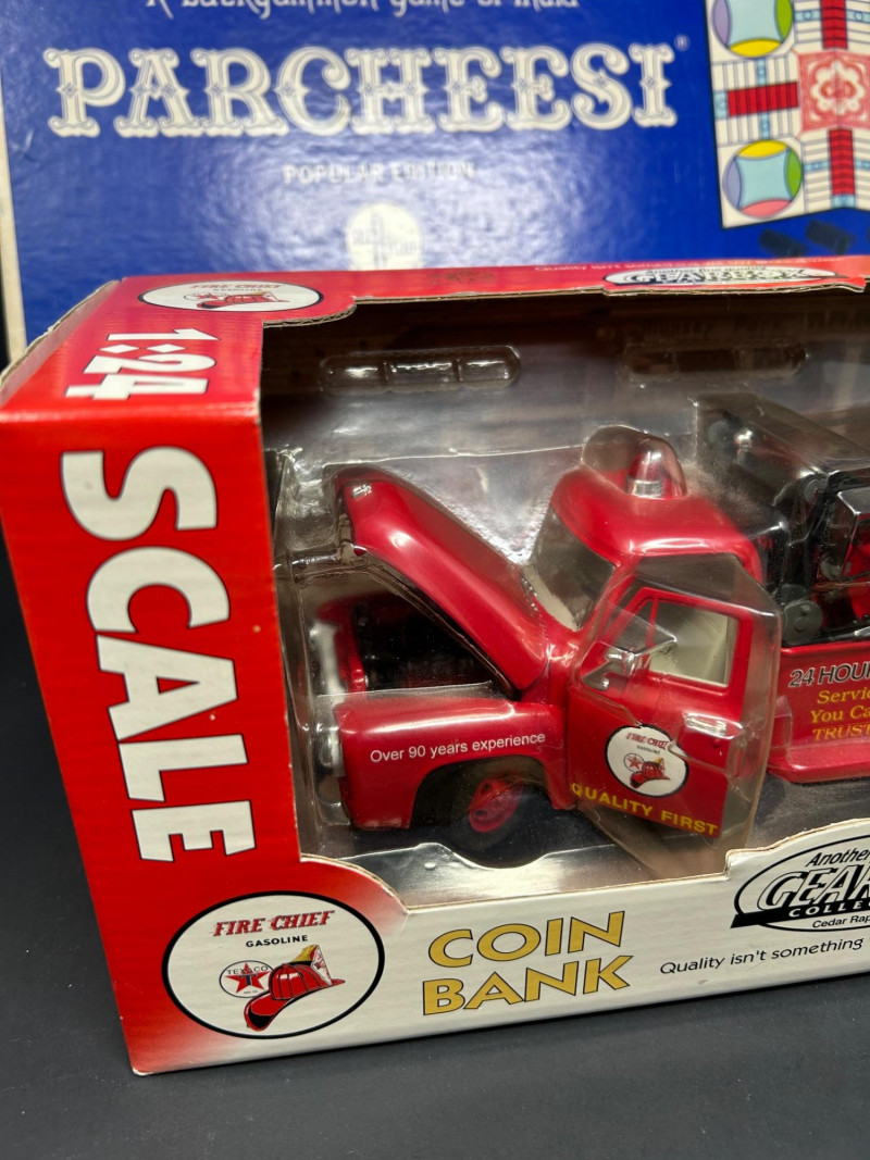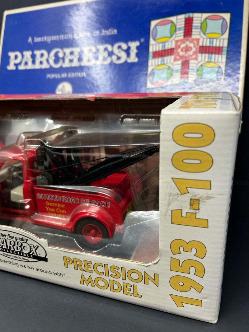 A well-presented five-piece vintage collectibles lot combining classic American board-game nostalgia with a highly detailed die-cast automotive model. This grouping appeals to collectors of vintage games, mid-century toys, and display-grade die-cast vehicles. The lot features a Parcheesi® Popular Edition board game by Selchow & Righter and a boxed 1953 Ford F-100 Tow Truck Precision Model with licensed Ford branding and Fire Chief Gasoline graphics. Original Parcheesi outer box Classic blue Selchow & Righter design Made in USA Original Parcheesi game board Traditional multicolor layout Folds correctly and displays well Parcheesi playing components Original playing pieces as shown Stored inside the box Die-cast 1953 Ford F-100 Tow Truck Heavy die-cast metal construction Coin bank feature Opening doors and hood Rubber tires with steerable wheels Movable boom arms with adjustable cables Detailed interior and engine Fire Chief Gasoline / Road Service graphics Original Tow Truck box “Limited Edition” Precision Model packaging Lists full feature set on box panelSet Includes: