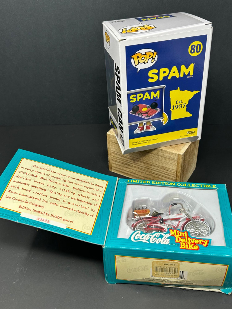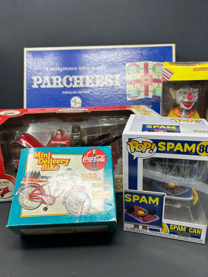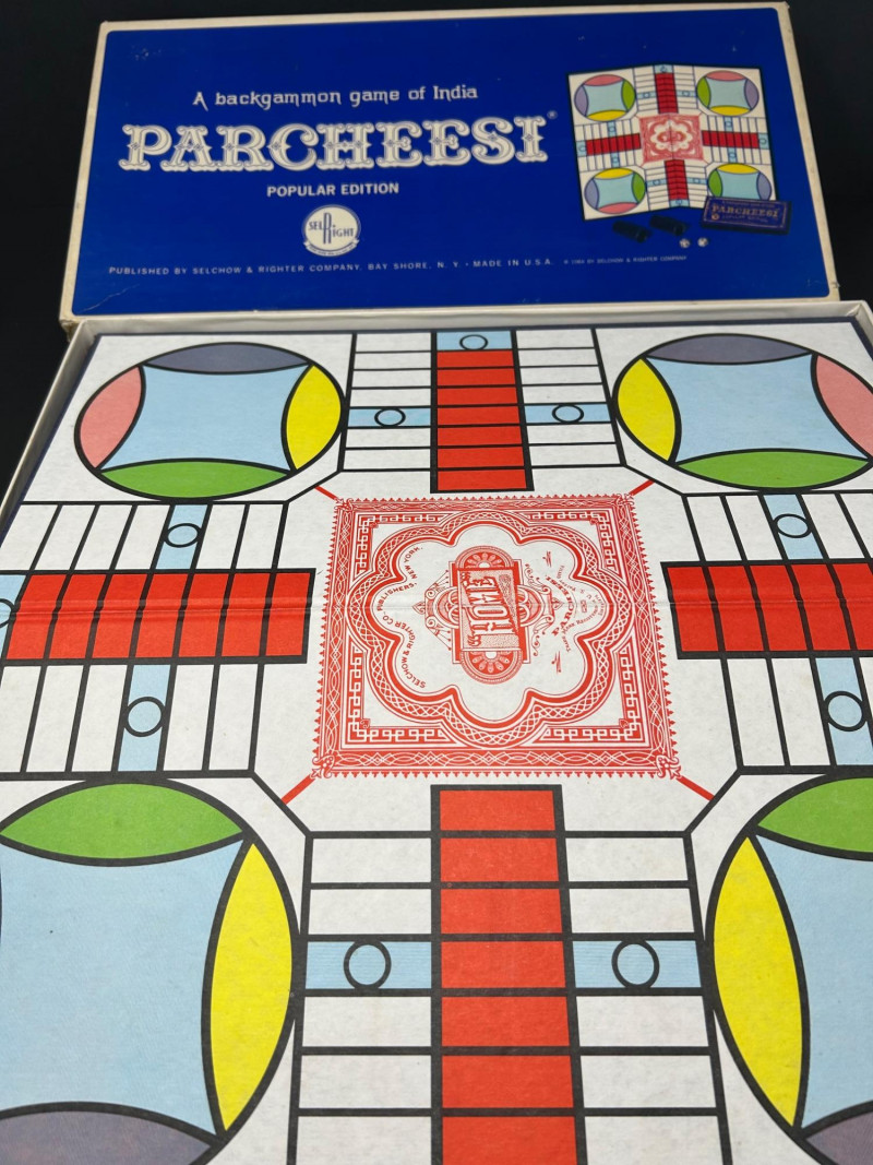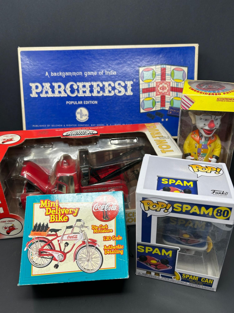 A well-presented five-piece vintage collectibles lot combining classic American board-game nostalgia with a highly detailed die-cast automotive model. This grouping appeals to collectors of vintage games, mid-century toys, and display-grade die-cast vehicles. The lot features a Parcheesi® Popular Edition board game by Selchow & Righter and a boxed 1953 Ford F-100 Tow Truck Precision Model with licensed Ford branding and Fire Chief Gasoline graphics. Original Parcheesi outer box Classic blue Selchow & Righter design Made in USA Original Parcheesi game board Traditional multicolor layout Folds correctly and displays well Parcheesi playing components Original playing pieces as shown Stored inside the box Die-cast 1953 Ford F-100 Tow Truck Heavy die-cast metal construction Coin bank feature Opening doors and hood Rubber tires with steerable wheels Movable boom arms with adjustable cables Detailed interior and engine Fire Chief Gasoline / Road Service graphics Original Tow Truck box “Limited Edition” Precision Model packaging Lists full feature set on box panelSet Includes: