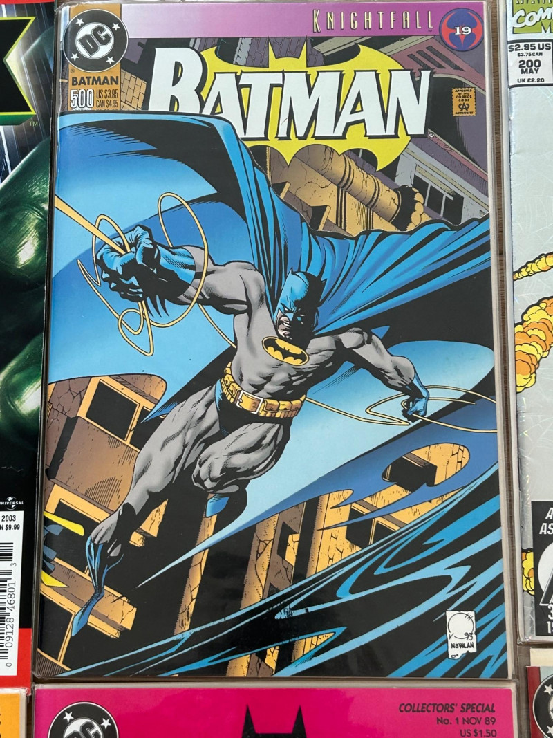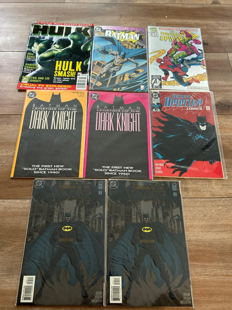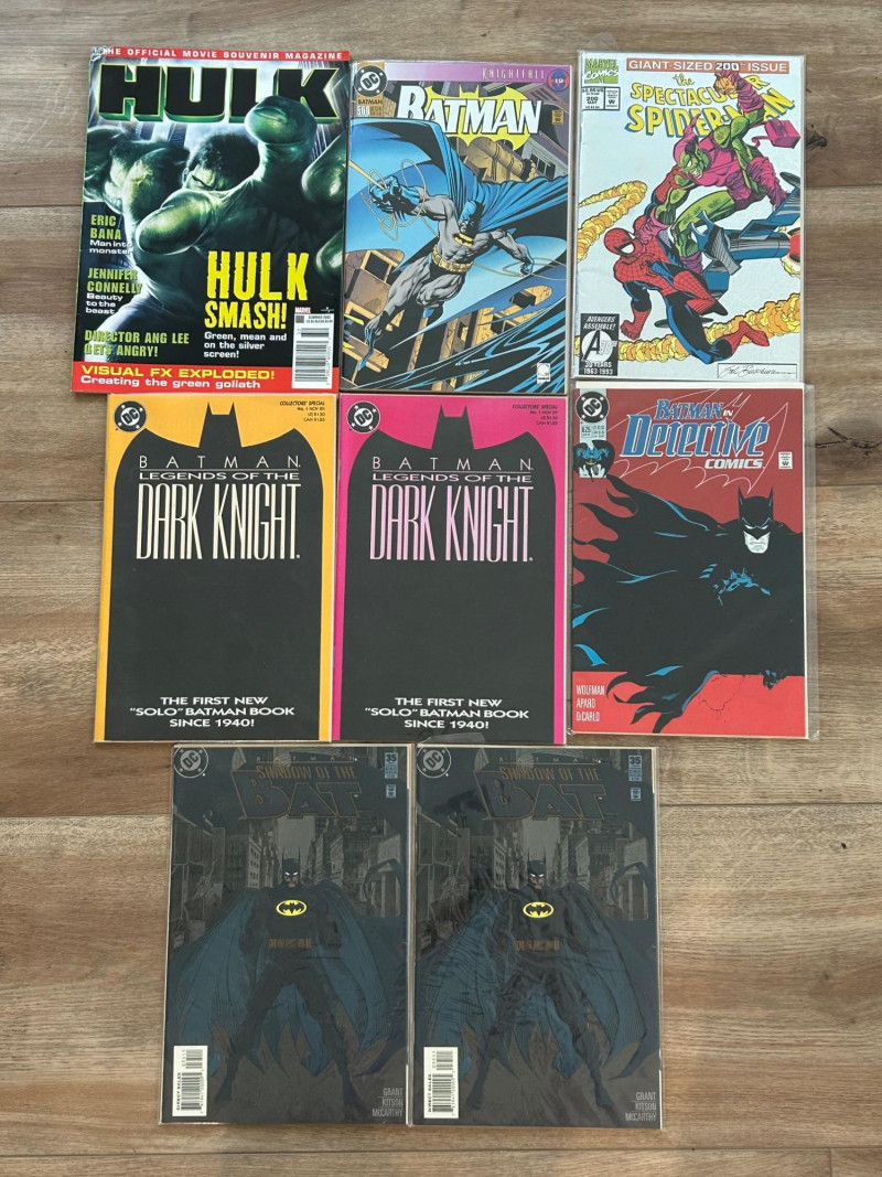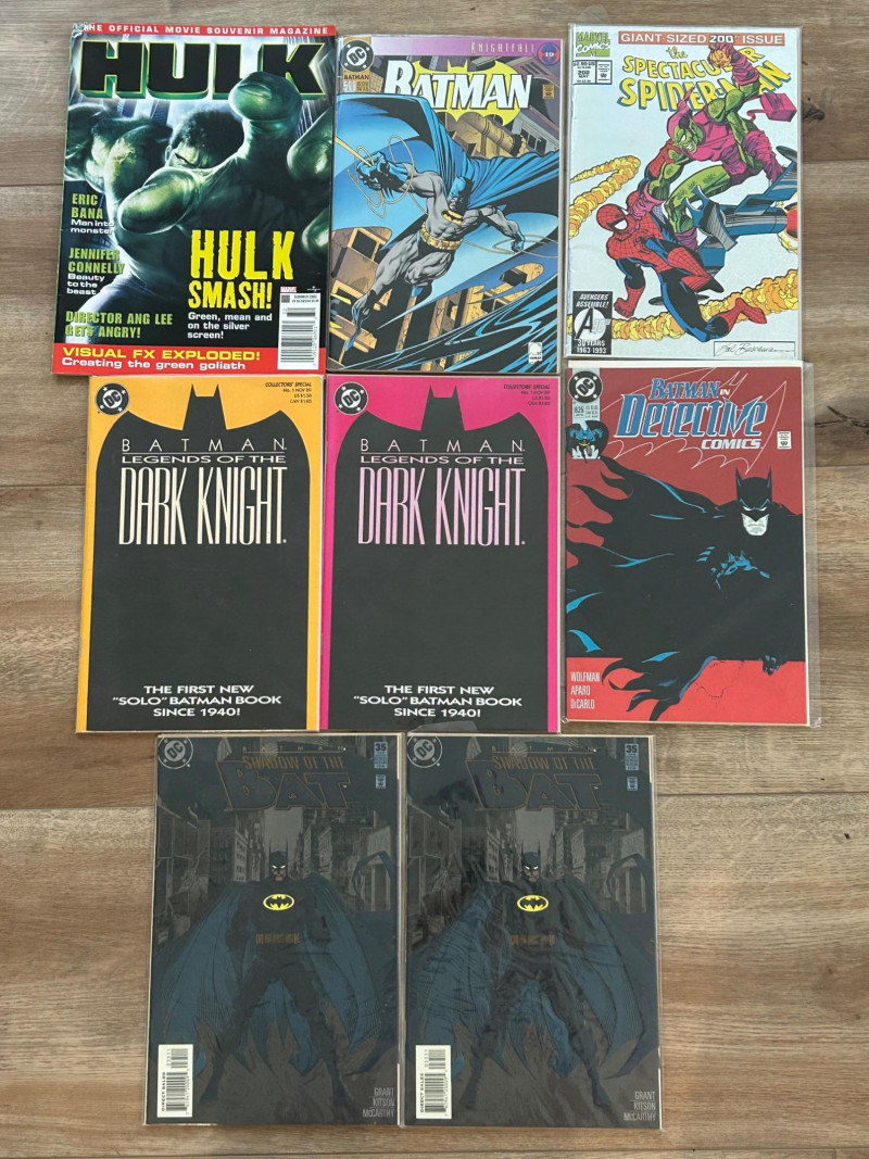 A striking mixed lot of DC and Marvel collectibles featuring iconic Batman storylines, a giant-size Spider-Man issue, and a Hulk movie souvenir magazine. This group highlights visually bold covers and key eras—from the gritty Knightfall period to anniversary and collectors’ specials—making it an excellent addition for comic collectors, Batman fans, or pop-culture enthusiasts. The lot includes multiple Batman titles such as Batman: Legends of the Dark Knight (Collectors’ Specials), Batman(notably issue #500 from Knightfall), Detective Comics, and Batman: Shadow of the Bat. Marvel highlights include The Spectacular Spider-Man (Giant-Size #200 anniversary issue) and an official Hulk magazine tied to the Ang Lee film era. Batman: Legends of the Dark Knight – Collectors’ Special editions (multiple color variants shown) Batman #500 – Knightfall era landmark issue Batman: Detective Comics – Classic 1990s cover artwork Batman: Shadow of the Bat – Dark, atmospheric Gotham styling The Spectacular Spider-Man – Giant-Size #200 (30th Anniversary era) Hulk – Official Movie Souvenir Magazine (2003) Publishers: DC Comics & Marvel Comics Era: Primarily 1990s with early-2000s material Format: Standard comics + one magazineSet Includes: