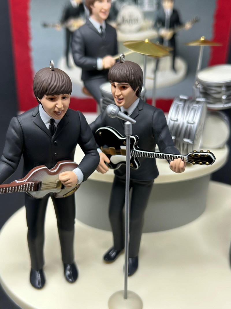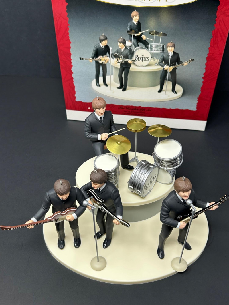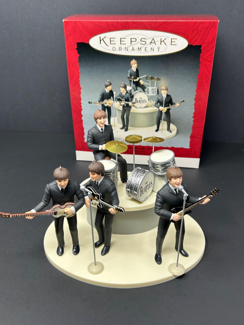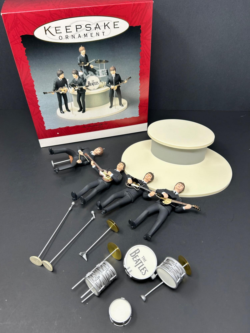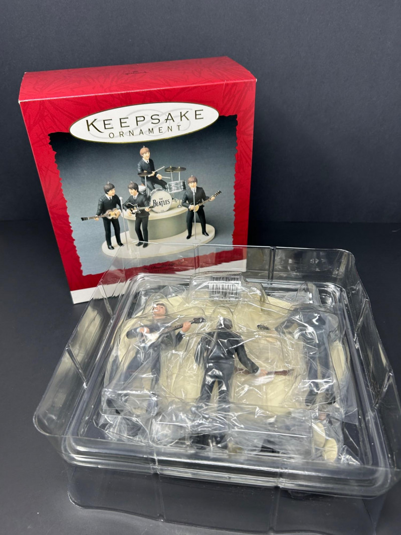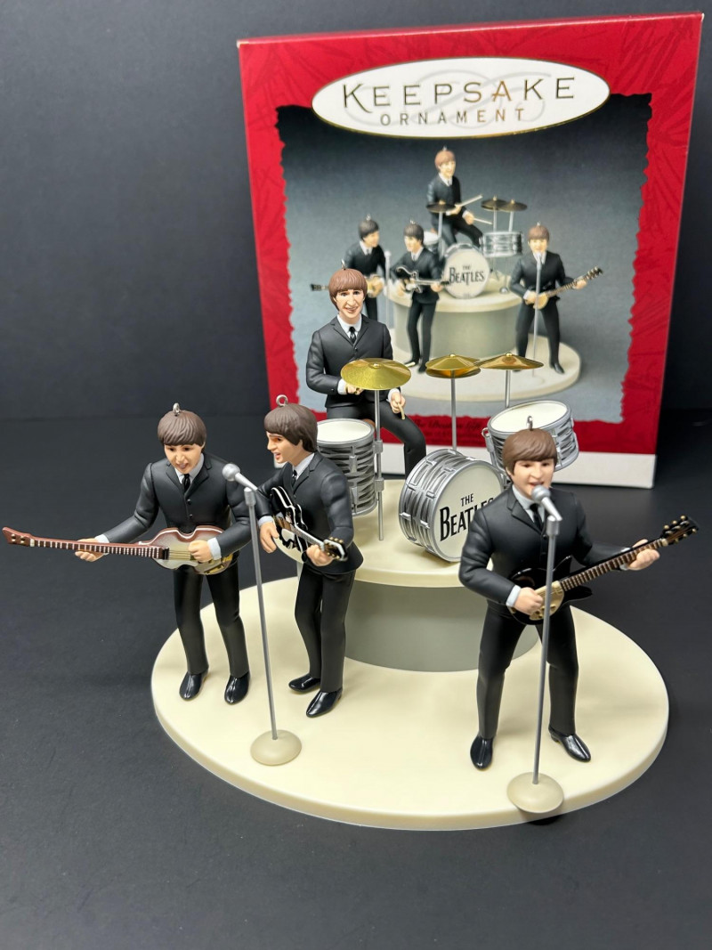 This is a beautifully detailed Hallmark Keepsake Ornament commemorating the 30th Anniversary of The Beatles’ U.S. debut (1964–1994). The set captures the Fab Four performing live in their iconic early concert configuration—complete with guitars, microphones, and a full drum kit—celebrating the moment Beatlemania took America by storm. Dated 1994 and marked Handcrafted, this piece was produced under license from Apple Corps Ltd. and showcases Hallmark’s renowned sculptural detail and finish. The ornament can be displayed as a complete stage scene and was originally designed for holiday display, though it also works beautifully as a year-round collectible. Includes the original Hallmark Keepsake box, featuring printed historical text on the back describing The Beatles’ first U.S. concert and television appearance in Washington, D.C. Brand: Hallmark Keepsake Ornament Year: 1994 Theme: The Beatles – Live Concert Scene Commemoration: 30th Anniversary of The Beatles’ Debut in America (1964–1994) Figures: John Lennon, Paul McCartney, George Harrison, Ringo Starr Design Features: Tiered stage display Drum set with The Beatles logo Two microphone stands Individually sculpted band members with instruments Marks & Copyright: Hallmark Cards, Inc. Apple Corps Limited “Handcrafted • Dated 1994” Packaging: Original red Hallmark Keepsake box includedDetails: