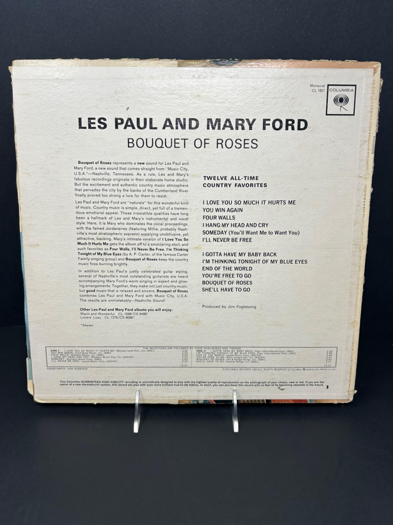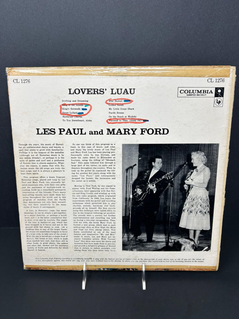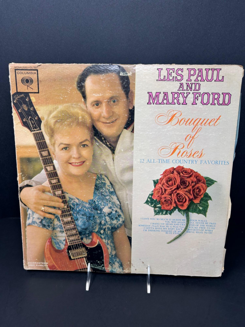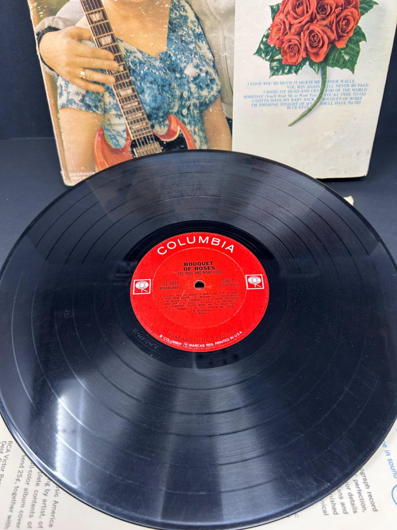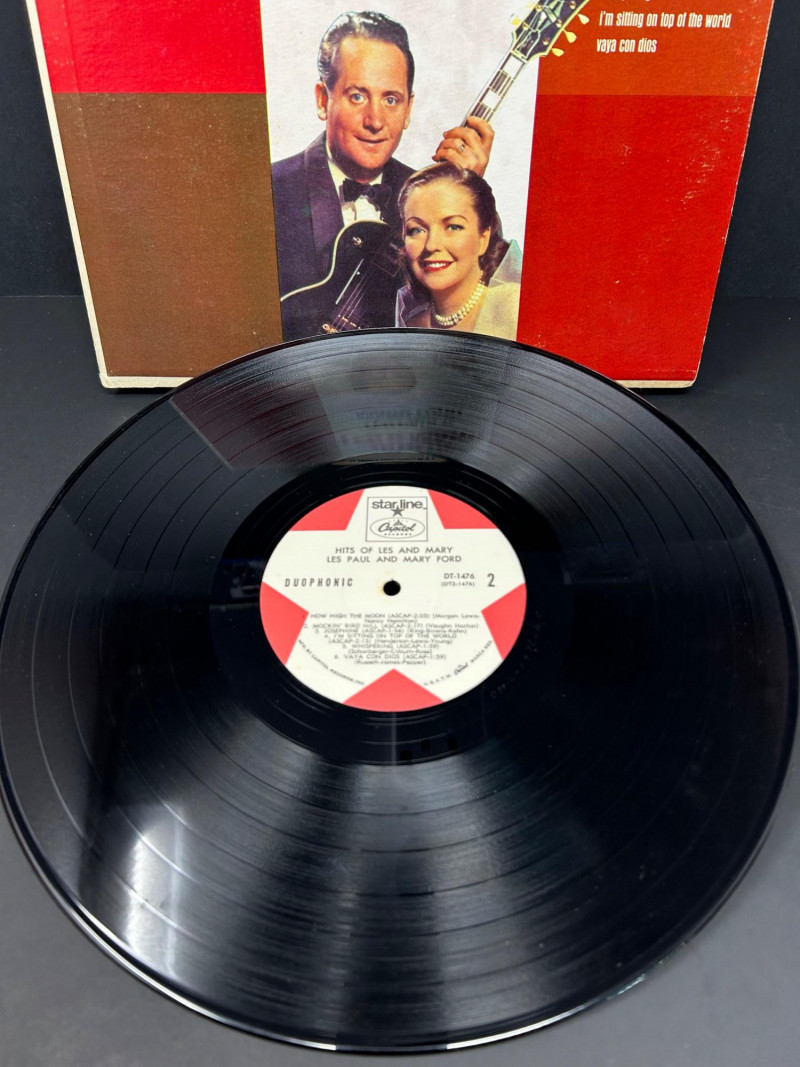 A complete set of four vintage vinyl albums featuring the legendary duo Les Paul and Mary Ford, innovators of multi-track recording and beloved for their timeless blend of guitar artistry and vocal harmony. Each album includes both Side 1 and Side 2 recordings, offering collectors a full listening experience across country, jazz, pop, and Hawaiian-inspired themes. Original pressings from Columbia Records, Capitol Records, and Harmony are included, with striking mid-century cover art. Format: Mono, High Fidelity Features: Side 1 and Side 2 recordings Visuals: Les Paul with guitar, Mary Ford, and bouquet of roses Condition: Jacket and vinyl included Format: Mono, High Fidelity Features: Side 1 and Side 2 recordings Visuals: Hawaiian luau scene with Les Paul & Mary Ford among dancers Condition: Jacket and vinyl included Format: Duophonic Stereo (Star Line series) Features: Side 1 and Side 2 recordings Visuals: Les Paul with guitar, Mary Ford smiling, bold Capitol design Condition: Jacket and vinyl included Format: Stereo pressings Features: Side 1 and Side 2 recordings Visuals: Black cover with bold lettering and photo of the duo Condition: Jacket and vinyl included Artists: Les Paul & Mary Ford Labels: Columbia Records, Capitol Records, Harmony (subsidiary of Columbia) Catalog Numbers: CL 1821, CL 1276, DT-1476, HS 11133 / HS 11139 Era: 1950s–1960s Genre: Pop, Country, Jazz, Hawaiian Sides: Each album includes Side 1 and Side 2 recordingsIncluded Albums: