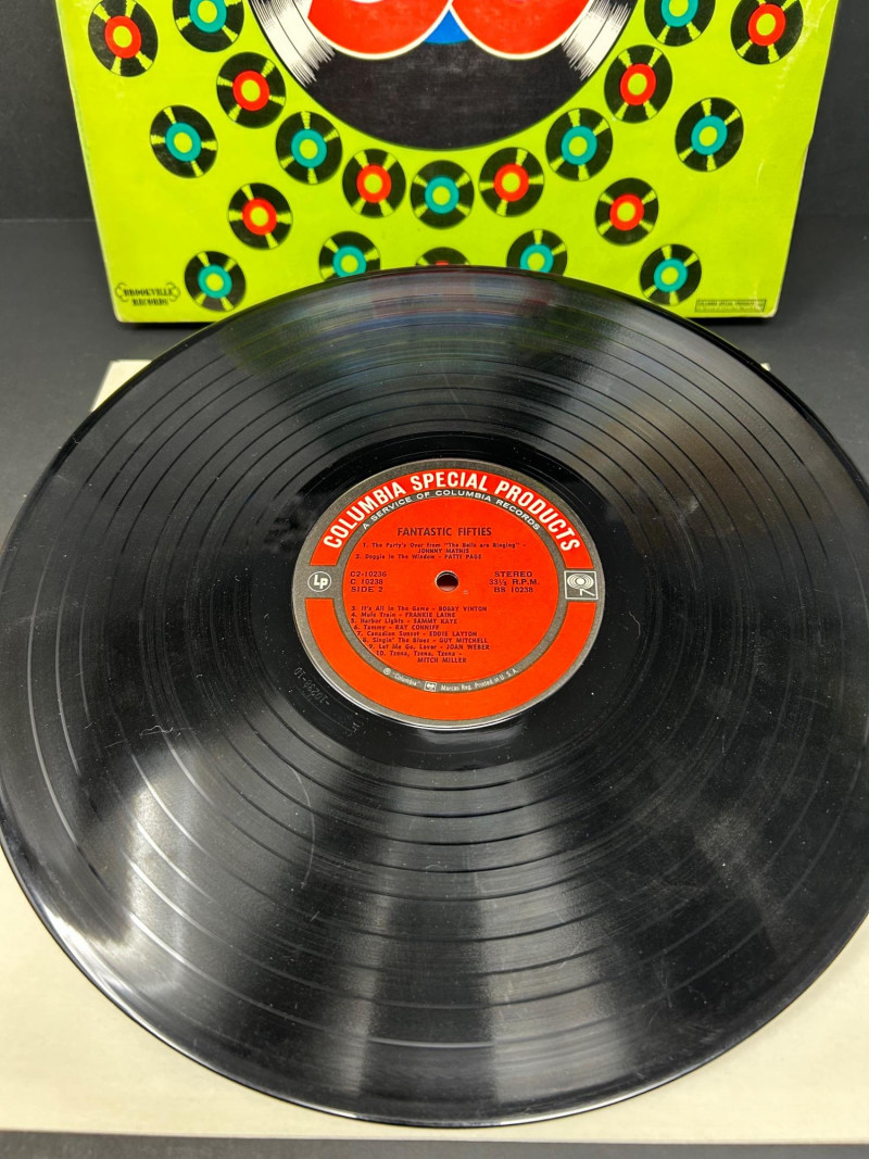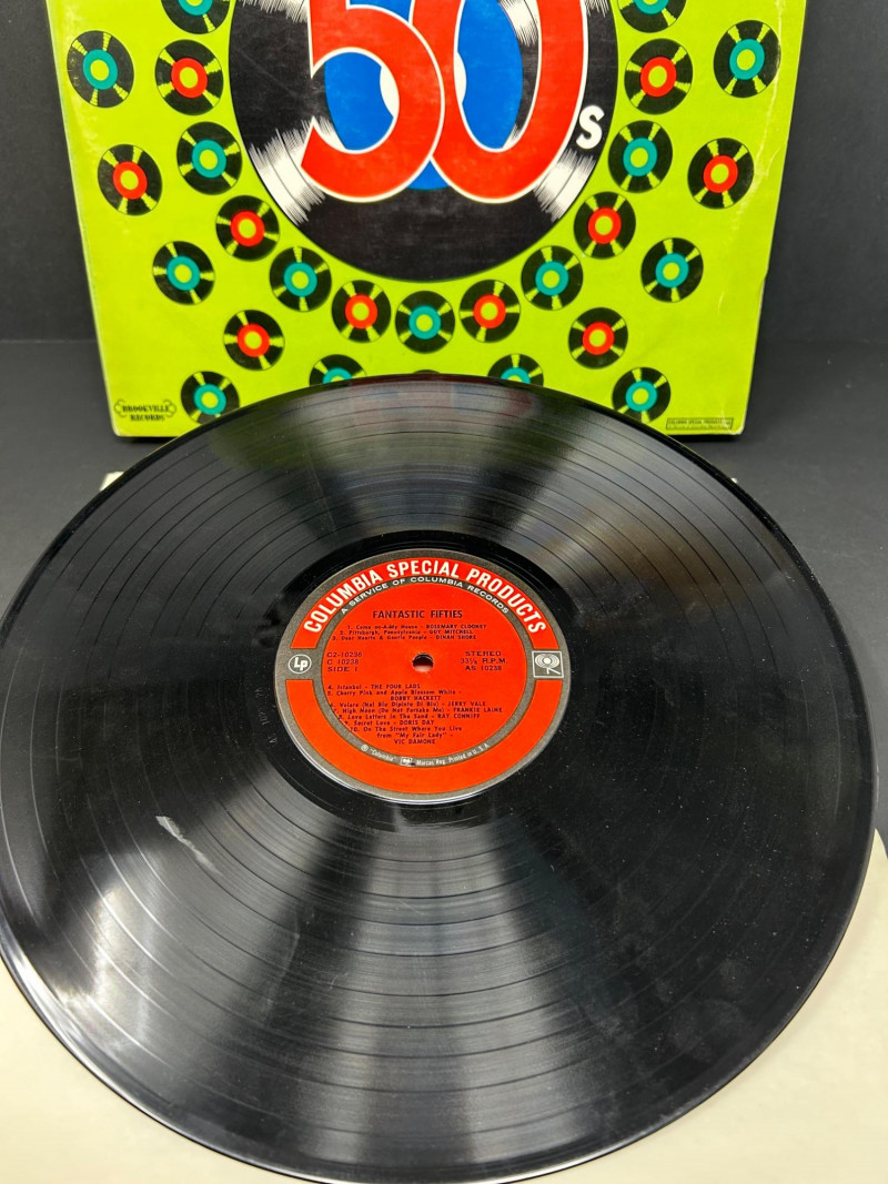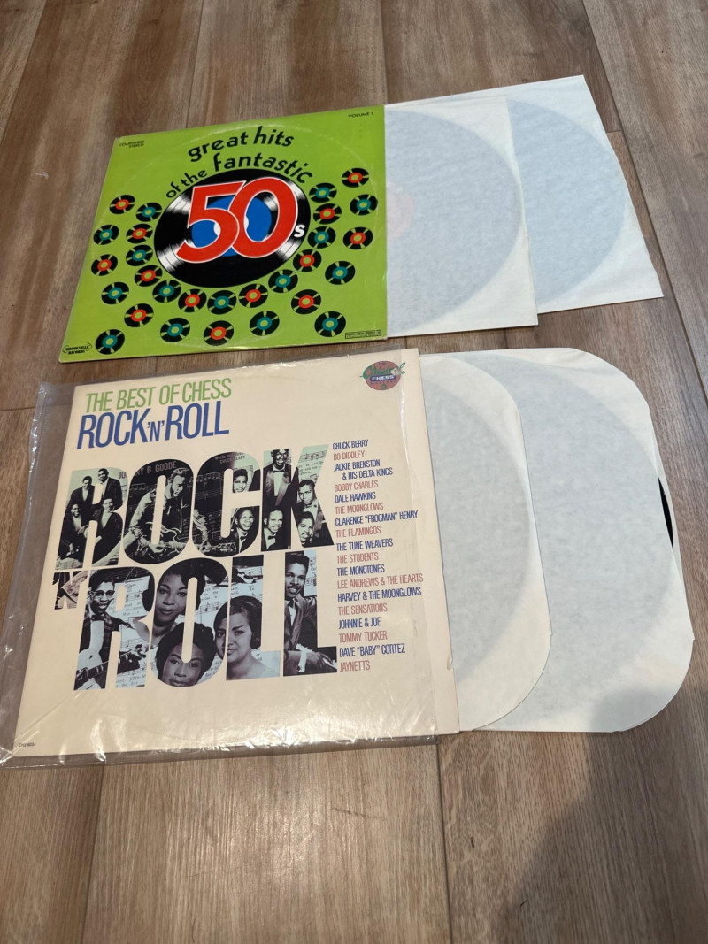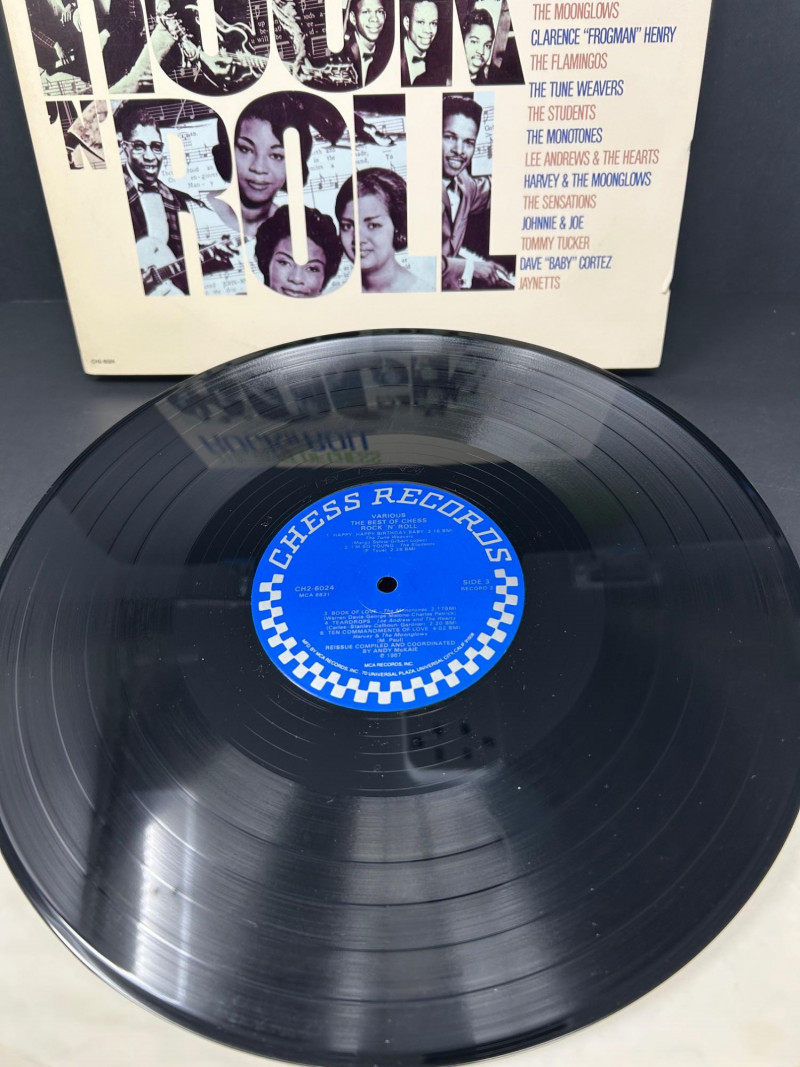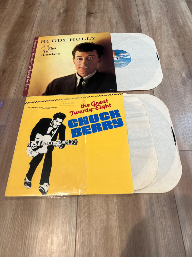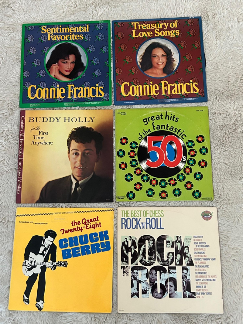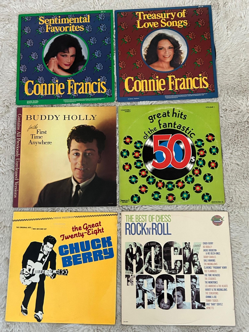 A curated set of six vintage vinyl records featuring legendary artists and timeless compilations from the golden age of rock ’n’ roll and love songs. This lot is ideal for collectors, music historians, and fans of mid‑century sound. Each album includes both sides and showcases iconic cover art that reflects the era’s cultural and musical aesthetics. Connie Francis – Sentimental Favorites NO SLEEVE Vinyl LP Side A & Side B Elegant purple rose cover design Connie Francis – Treasury of Love Songs NO SLEEVE Vinyl LP Side A & Side B Red rose motif with blue border Buddy Holly – For the First Time Anywhere Vinyl LP Side 1 & Side 2 Rare unreleased versions, rainbow sky label Great Hits of the Fantastic 50s – Volume I Vinyl LP Side 1 & Side 2 Nostalgic compilation with vibrant green cover Chuck Berry – The Great Twenty-Eight Double LP set Sides A, B, C & D Definitive collection of Berry’s greatest hits The Best of Chess Rock ’N’ Roll Double LP set Sides 1 & 2 Compilation of Chess Records legends with collage-style cover Format: Vinyl LPs (single and double sets) Era: 1950s–1980s Condition: Covers and labels in visually presentable shape; vinyl condition not play-tested Genre: Rock ’n’ Roll, Pop, Love Songs Labels: Chess Records, MCA, Suffolk Marketing Inc., Columbia Special ProductsHighlights:
