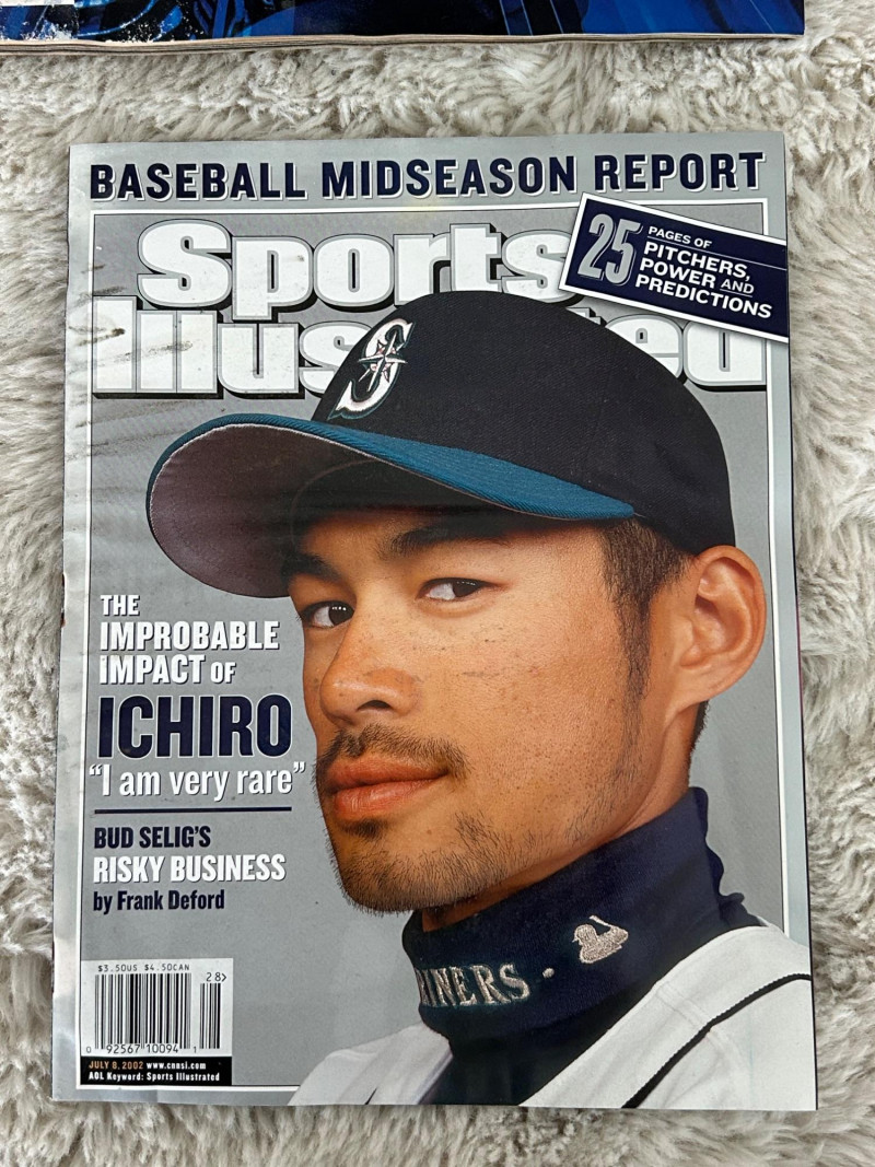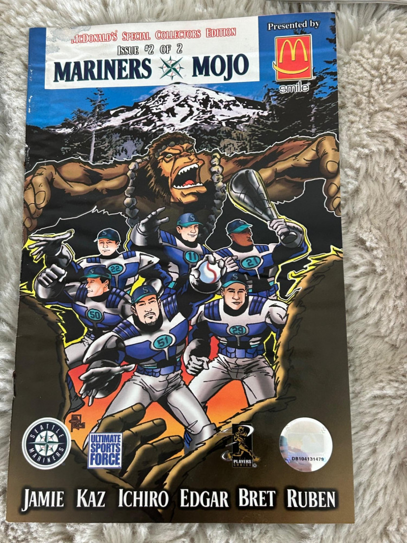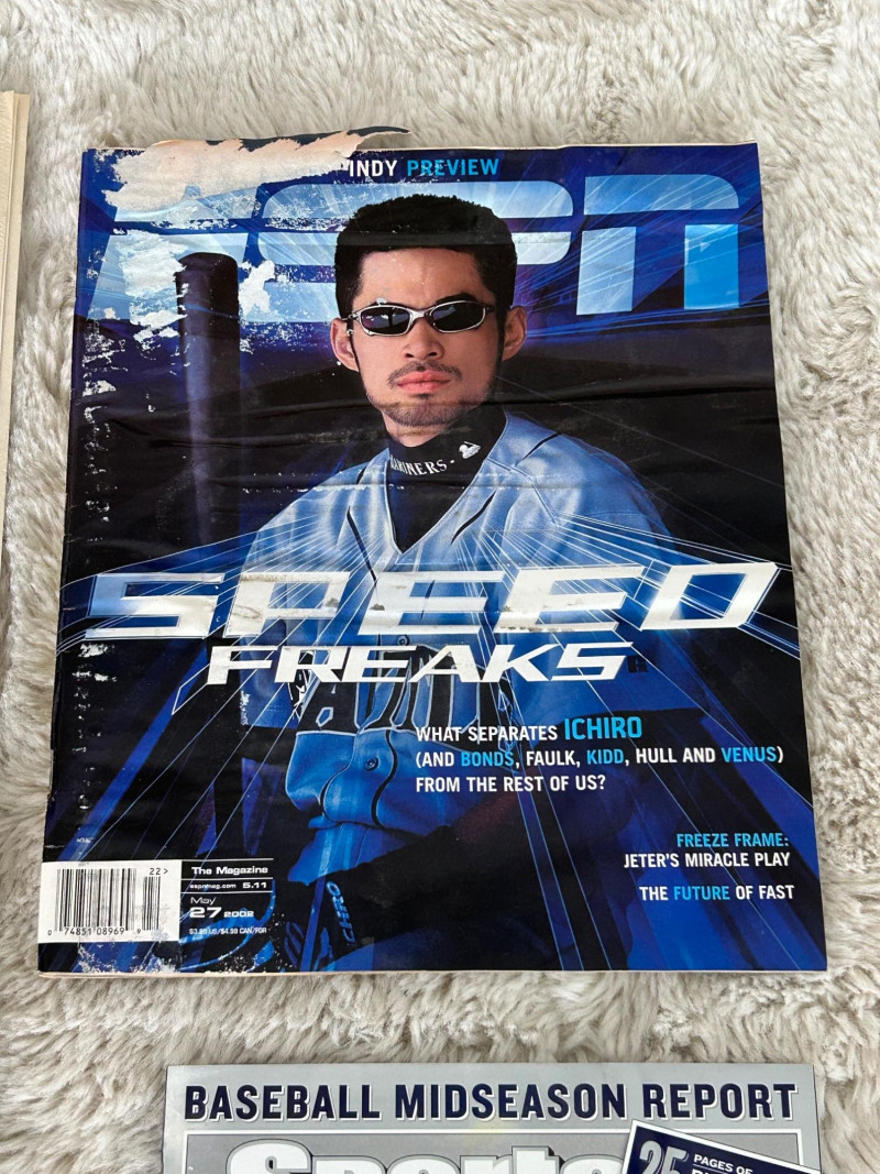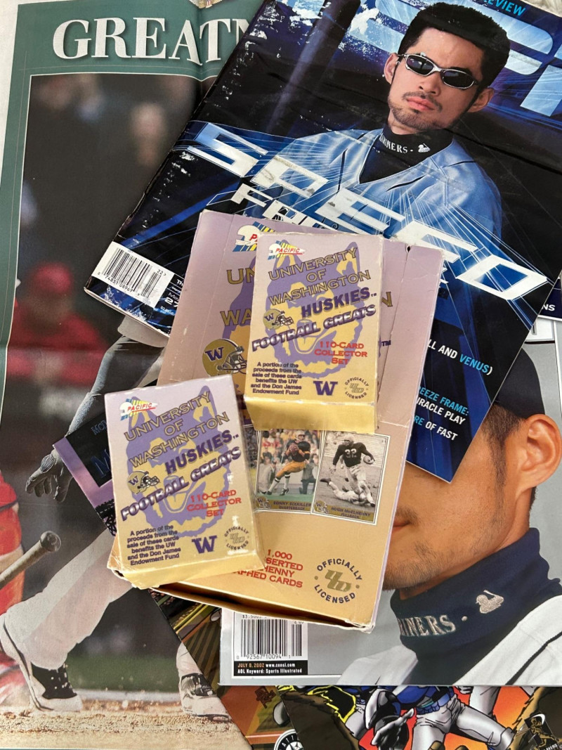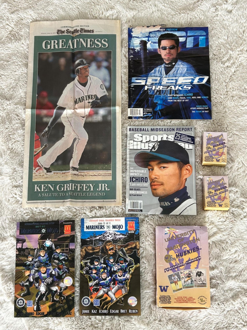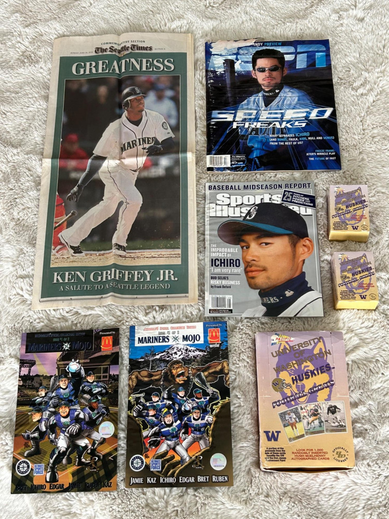 A standout Seattle-themed sports memorabilia collection celebrating two of the city’s most iconic baseball figures—Ichiro Suzuki and Ken Griffey Jr.—alongside official publications, promotional issues, and sealed collegiate trading cards. This lot blends early-2000s baseball media with unique promotional collectibles, making it ideal for Seattle Mariners fans, Ichiro collectors, Griffey enthusiasts, and regional sports historians. Highlights include nationally distributed magazines, a commemorative Seattle newspaper section, McDonald’s-issued Mariners artwork publications, and University of Washington Huskies football trading cards. The Seattle Times – Commemorative Section ESPN The Magazine Sports Illustrated Seattle Mariners “Mojo” Special Collector Editions (2 issues) University of Washington Huskies Football Trading Cards Multi-pack box (Pacific brand) Additional opened box with visible cards shown in photos Officially licensed UW Huskies football set Teams Featured: Seattle Mariners, Washington Huskies Era: Late 1990s – Early 2000s Authenticity: All items appear to be original, officially released publications and licensed productsLot Includes: