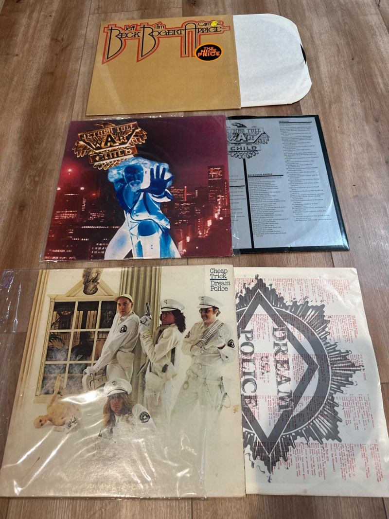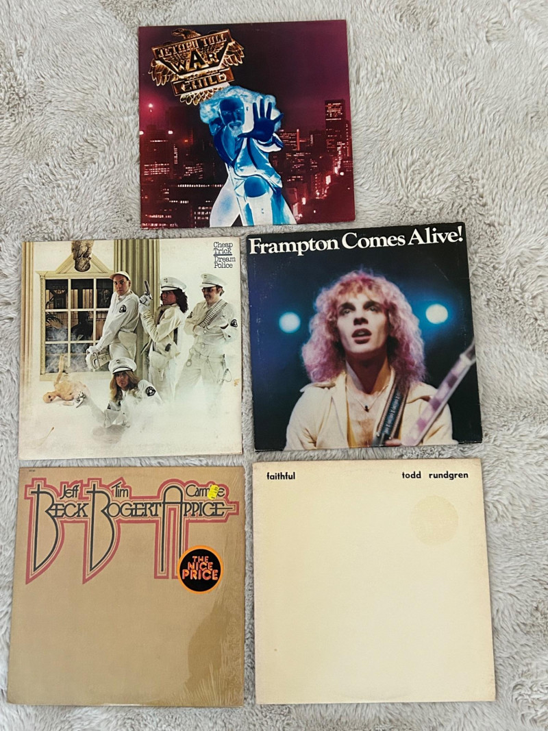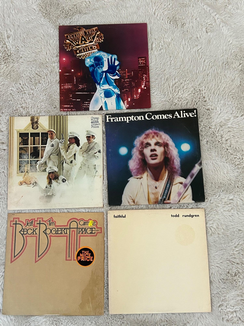 A solid classic rock vinyl collection featuring five well-known albums from the 1970s, covering progressive rock, power pop, blues-rock, and arena rock. This lot includes a double-LP live album with Sides 1–4, making it an excellent addition for collectors or anyone building a vintage rock library. Jethro Tull – War Child (Chrysalis) Cheap Trick – Dream Police (Epic) Todd Rundgren – Faithful (Bearsville) Beck, Bogert & Appice – Beck Bogert & Appice (Epic) Peter Frampton – Frampton Comes Alive! (A&M, Double LP) Format: 12-inch LPs Total: 5 albums Stereo pressings as indicated on labels Original record labels visible in photosSet Includes (5 Albums):
