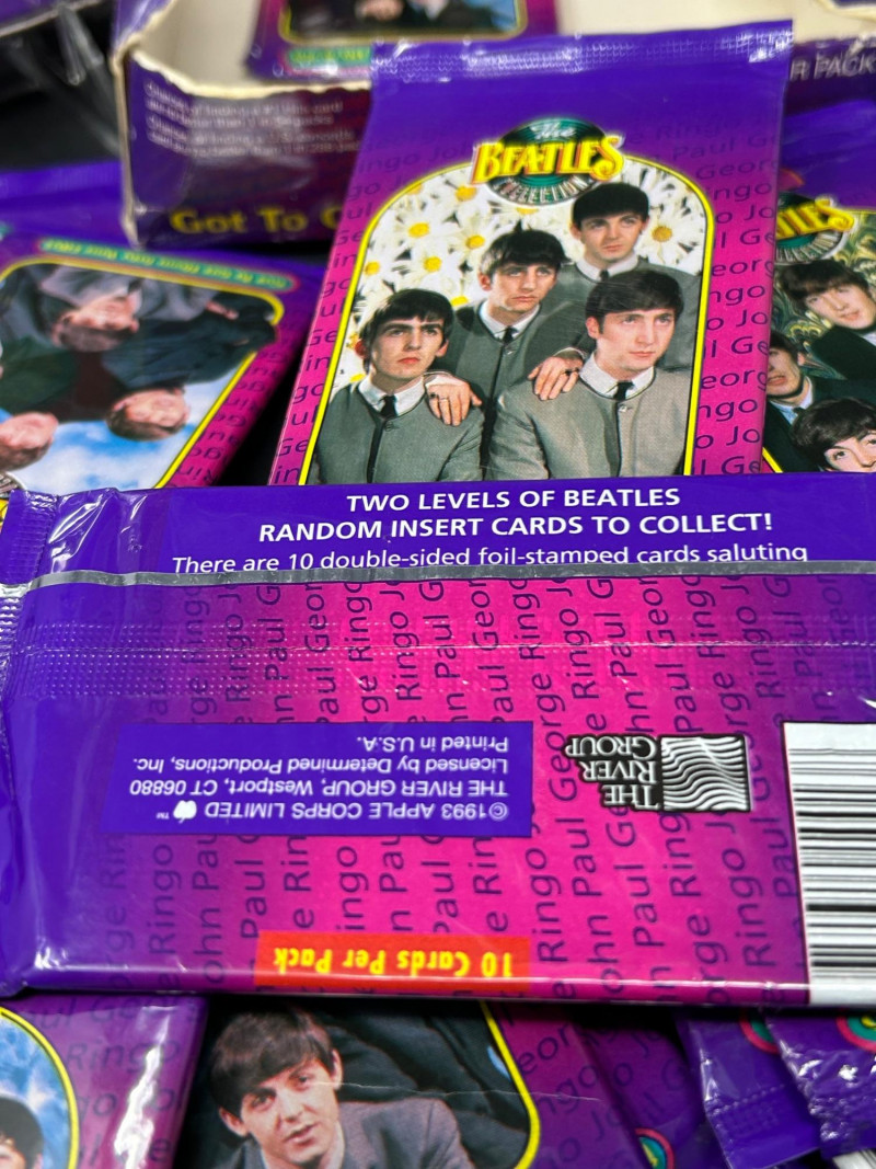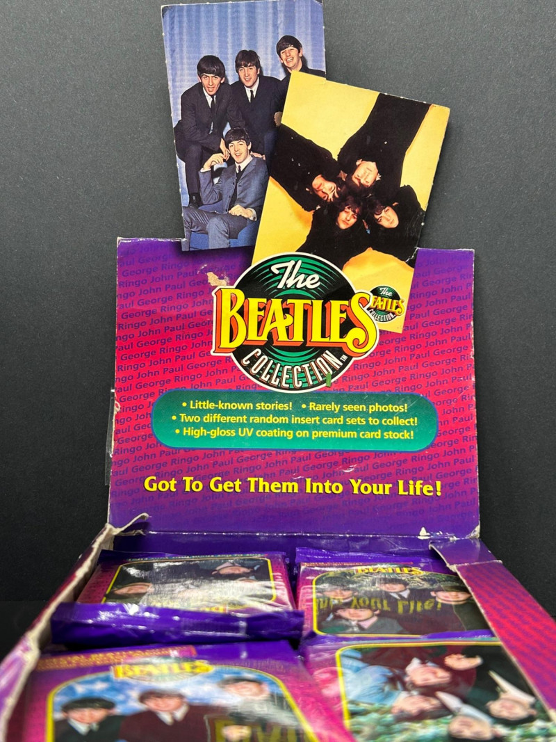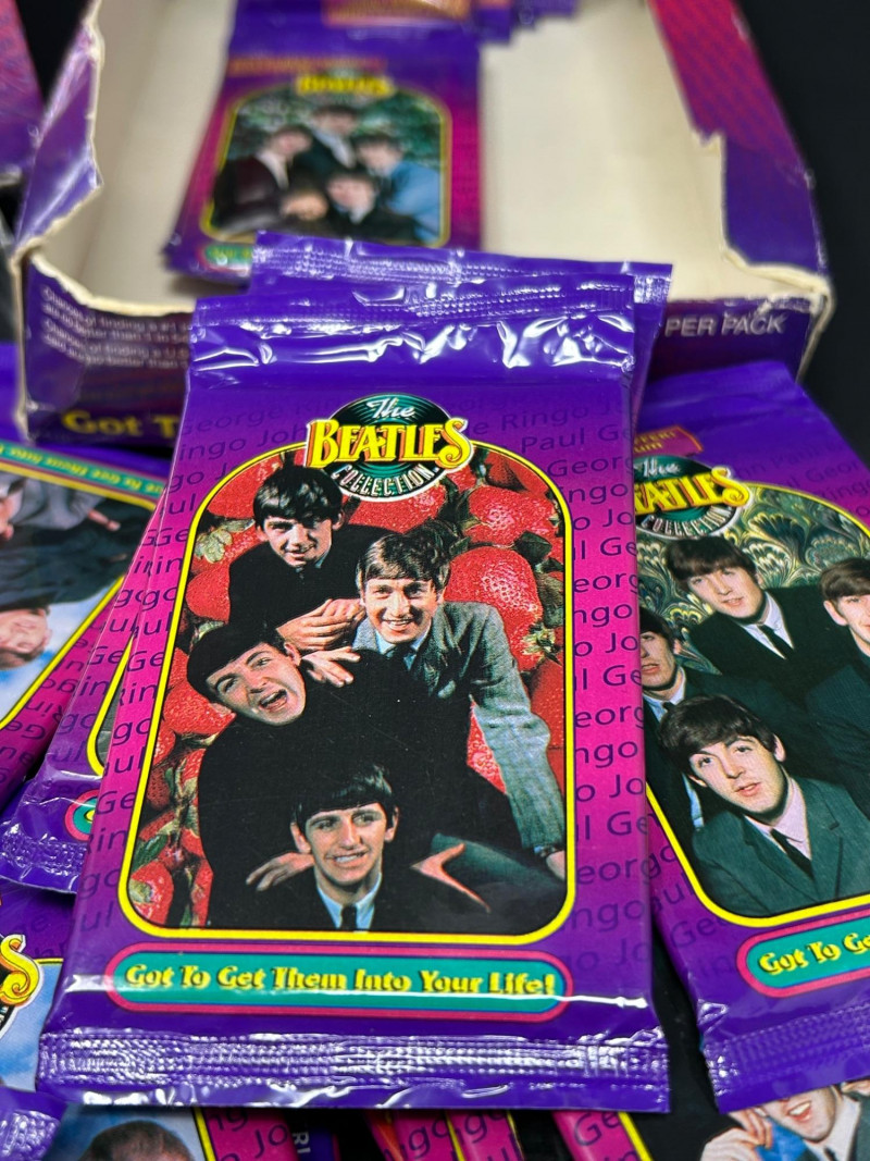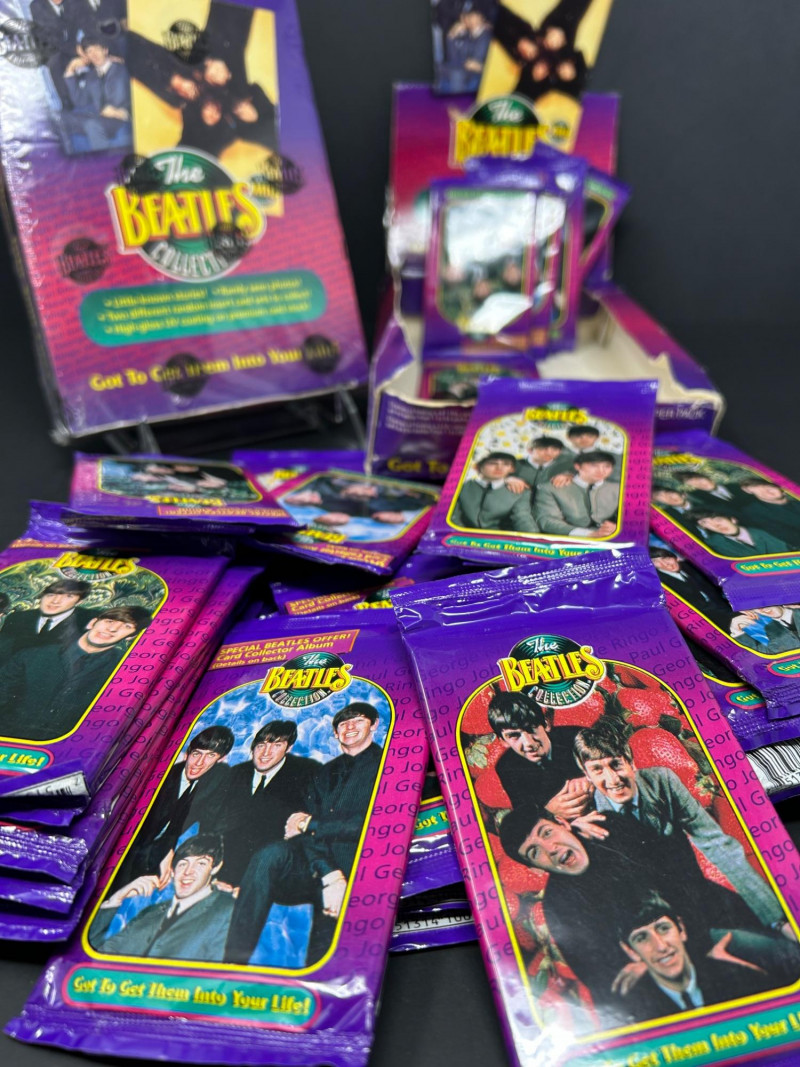 A vibrant and nostalgic The Beatles Collection trading card lot, featuring original 1990s licensed trading cardspresented in their iconic purple packaging. This lot includes sealed card packs along with display boxes, showcasing classic Beatles imagery, rare photo reproductions, and collectible inserts. Produced by The River Group in the early 1990s, these cards were marketed with the tagline “Got To Get Them Into Your Life!” and are known for their high-gloss UV coating, premium card stock, and randomly inserted special cards. A must-have for Beatles collectors, card enthusiasts, or anyone building a curated music-memorabilia auction. Title: The Beatles Collection Type: Licensed trading card packs & display boxes Era: Circa 1993 Manufacturer: The River Group Contents: Multiple sealed trading card packs Display boxes (one shrink-wrapped, one opened for display) Card Features: Classic and rarely seen Beatles photographs High-gloss UV-coated premium card stock Two levels of random insert cards to collect Condition: Packs: Factory sealed Boxes: One sealed, one open Details: