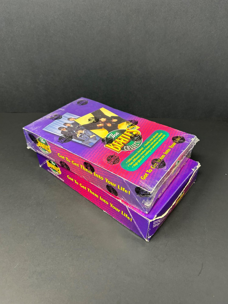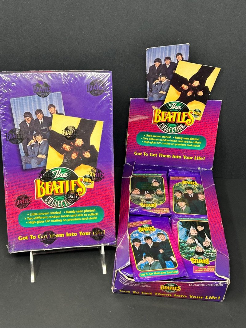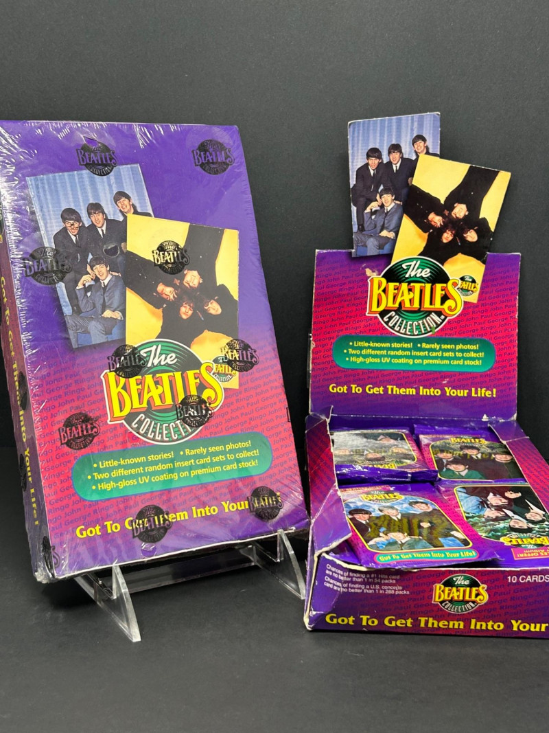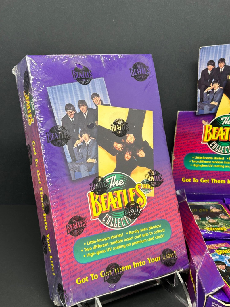 A vibrant and nostalgic The Beatles Collection trading card lot, featuring original 1990s licensed trading cardspresented in their iconic purple packaging. This lot includes sealed card packs along with display boxes, showcasing classic Beatles imagery, rare photo reproductions, and collectible inserts. Produced by The River Group in the early 1990s, these cards were marketed with the tagline “Got To Get Them Into Your Life!” and are known for their high-gloss UV coating, premium card stock, and randomly inserted special cards. A must-have for Beatles collectors, card enthusiasts, or anyone building a curated music-memorabilia auction. Title: The Beatles Collection Type: Licensed trading card packs & display boxes Era: Circa 1993 Manufacturer: The River Group Contents: Multiple sealed trading card packs Display boxes (one shrink-wrapped, one opened for display) Card Features: Classic and rarely seen Beatles photographs High-gloss UV-coated premium card stock Two levels of random insert cards to collect Condition: Packs: Factory sealed Boxes: One sealed, one open Details: