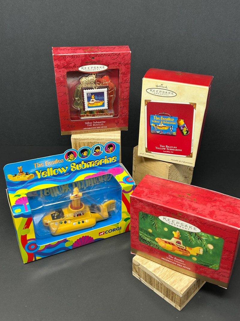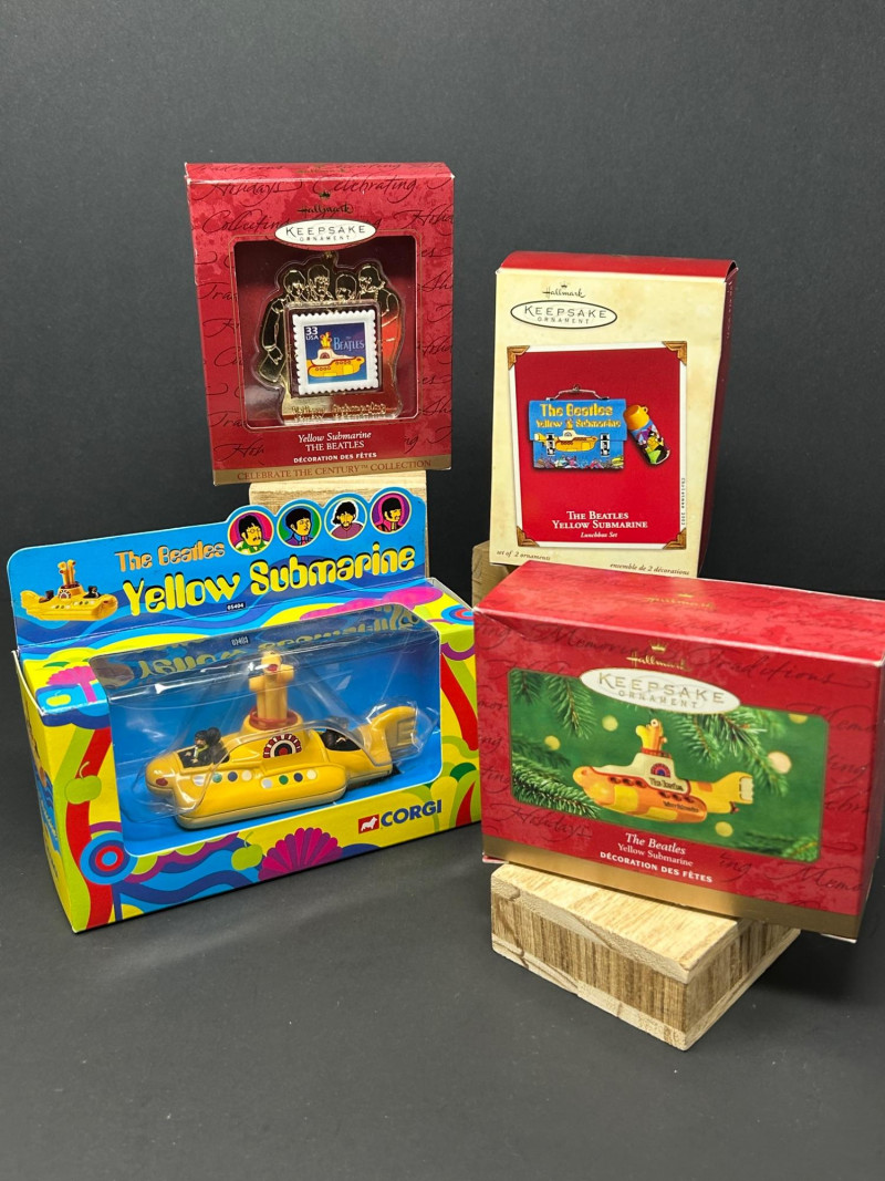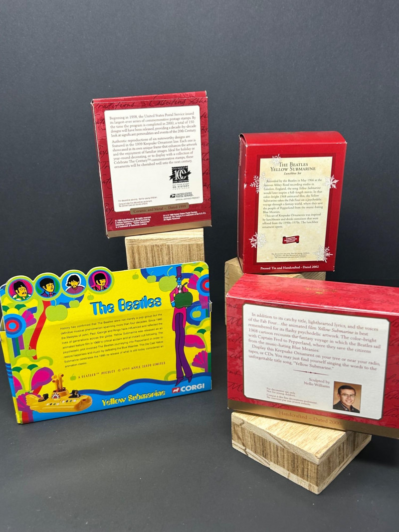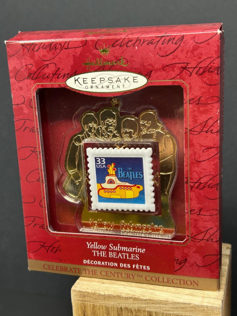 A curated Yellow Submarine collectibles group celebrating the iconic psychedelic world of The Beatles. This assemblage brings together Hallmark Keepsake holiday ornaments from the late 1990s–early 2000s and a licensed Corgi die-cast Yellow Submarine model. United by bold color, nostalgic design, and official licensing, the group reflects the enduring cultural impact of the 1968 animated film Yellow Submarine and its place in music and pop-art history. Type: Holiday ornament set (2 pieces) Date: Dated 2002 Materials: Pressed tin, handcrafted Components: Mini lunchbox ornament (opens) and matching drink container ornament Inspiration: Mid-century lunchboxes and drink containers (1950s–1970s) Packaging: Original Hallmark Keepsake box with Christmas memory card enclosed Use: Decorative only; not intended for play Date: Dated 1999 Materials: Ceramic and metal Design: Framed postage-stamp motif featuring Yellow Submarine artwork Series: Celebrate the Century™ Collection Licensing: Officially licensed U.S. Postal Service product Packaging: Original Hallmark Keepsake box Use: Decorative only Date: Dated 2000 Materials: Handcrafted sculpted ornament Design: Classic Yellow Submarine form inspired by the animated film Packaging: Original Hallmark Keepsake box Use: Decorative only Manufacturer: Corgi Type: Die-cast collectible model Design: Yellow Submarine with character figures and colorful graphic packaging Licensing: Official Beatles merchandise Packaging: Original retail box Intended Use: Display collectible; not a toyItem Details: