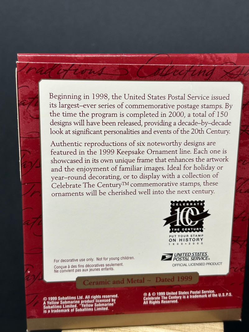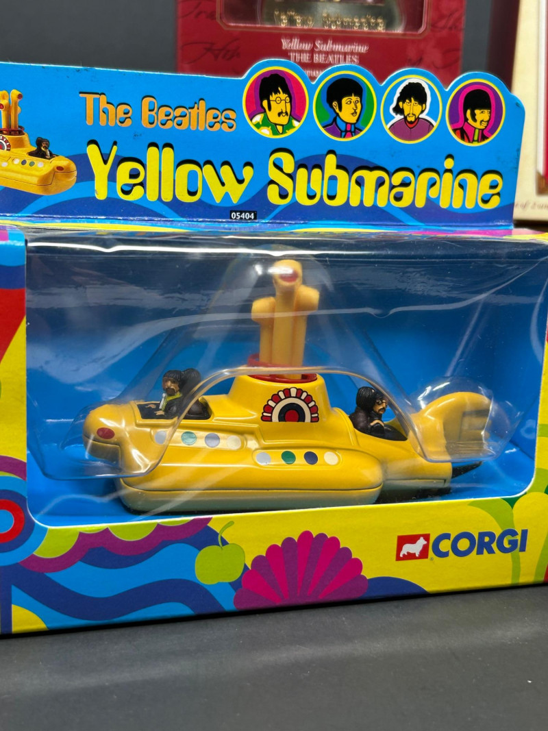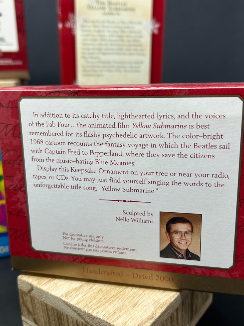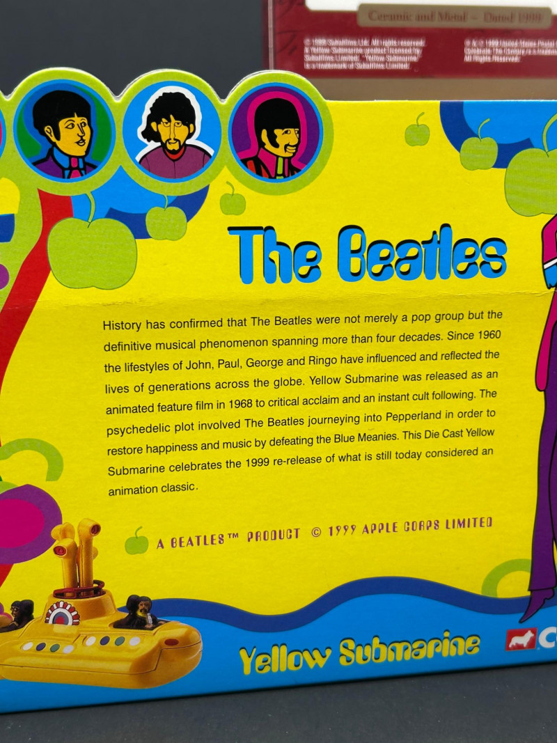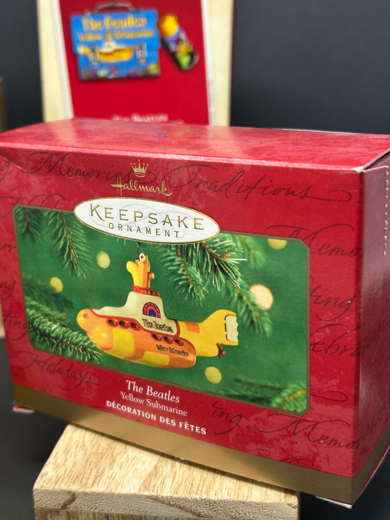 A curated Yellow Submarine collectibles group celebrating the iconic psychedelic world of The Beatles. This assemblage brings together Hallmark Keepsake holiday ornaments from the late 1990s–early 2000s and a licensed Corgi die-cast Yellow Submarine model. United by bold color, nostalgic design, and official licensing, the group reflects the enduring cultural impact of the 1968 animated film Yellow Submarine and its place in music and pop-art history. Type: Holiday ornament set (2 pieces) Date: Dated 2002 Materials: Pressed tin, handcrafted Components: Mini lunchbox ornament (opens) and matching drink container ornament Inspiration: Mid-century lunchboxes and drink containers (1950s–1970s) Packaging: Original Hallmark Keepsake box with Christmas memory card enclosed Use: Decorative only; not intended for play Date: Dated 1999 Materials: Ceramic and metal Design: Framed postage-stamp motif featuring Yellow Submarine artwork Series: Celebrate the Century™ Collection Licensing: Officially licensed U.S. Postal Service product Packaging: Original Hallmark Keepsake box Use: Decorative only Date: Dated 2000 Materials: Handcrafted sculpted ornament Design: Classic Yellow Submarine form inspired by the animated film Packaging: Original Hallmark Keepsake box Use: Decorative only Manufacturer: Corgi Type: Die-cast collectible model Design: Yellow Submarine with character figures and colorful graphic packaging Licensing: Official Beatles merchandise Packaging: Original retail box Intended Use: Display collectible; not a toyItem Details: