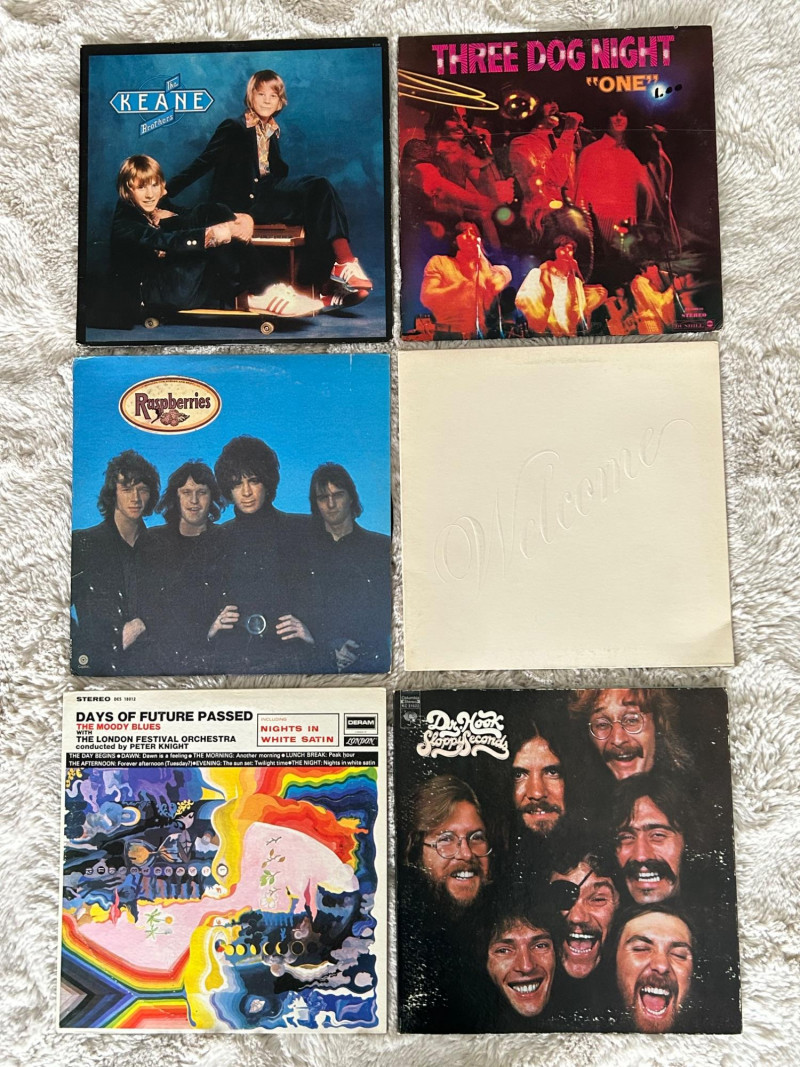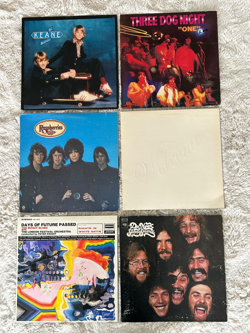 This auction features a curated lot of six classic rock vinyl LPs from the late 1960s–1970s era, including iconic artists such as Three Dog Night, Dr. Hook, Santana, The Moody Blues, The Raspberries, and The Keane Brothers. Three Dog Night – One Dunhill / ABC Records Vinyl: Side 1 & Side 2 Dr. Hook & The Medicine Show – Sloppy Seconds Columbia Records (red label) Gatefold sleeve Vinyl: Side 1 & Side 2 Santana – Welcome Columbia Records Vinyl: Side 1 & Side 2 The Moody Blues – Days of Future Passed Deram Records (stereo) Vinyl: Side One & Side Two Raspberries – Raspberries Capitol Records Vinyl: Side One & Side Two The Keane Brothers – The Keane Brothers 20th Century Records Vinyl: Side I & Side II Format: 12" Vinyl LPs Speed: 33⅓ RPM Total Records: 6 LPs Total Sleeves: 6 (including gatefolds where issued) Genre: Classic Rock / Soft Rock / Pop Rock Era: Late 1960s–1970s