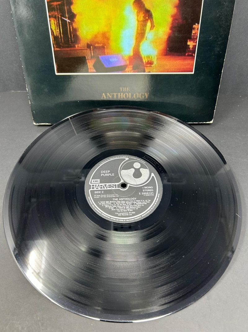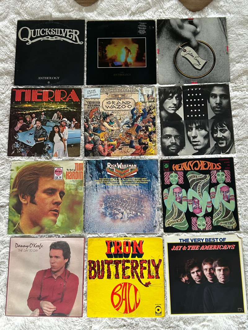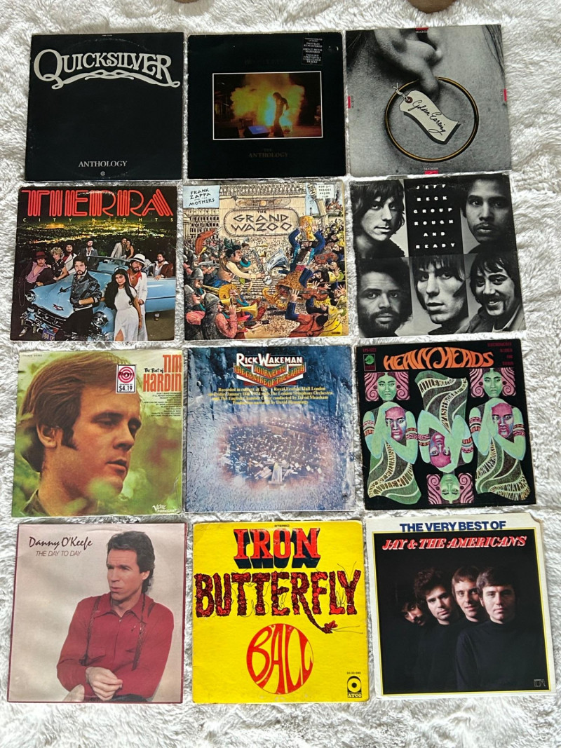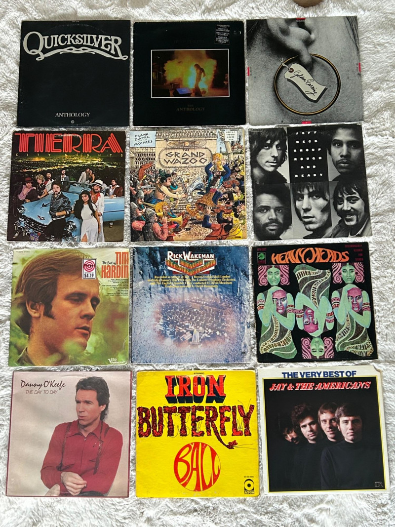A solid mixed lot of 12 classic rock, progressive rock, blues-rock, and pop vinyl LPs, spanning the late 1960s through the early 1980s. This collection features well-known artists and bands including Deep Purple, Frank Zappa, Jeff Beck Group, Talking Heads, Iron Butterfly, and more. Includes studio albums, compilation titles, a double-LP set, and gatefold sleeves. A well-rounded group suitable for collectors of classic rock, prog, and vintage pop vinyl. Anthology – Quicksilver Messenger Service The Anthology – Deep Purple (2× LP) John Barleycorn Must Die – Traffic City Nights – Tierra The Grand Wazoo – Frank Zappa Rough and Ready – Jeff Beck Group The Best of Tim Hardin – Tim Hardin Journey to the Centre of the Earth – Rick Wakeman Remain in Light – Talking Heads The Day to Day – Danny O'Keefe (SEALED, NEVER OPENED) Ball – Iron Butterfly (SLEEVE MISSING) The Very Best of Jay & the Americans – Jay & the AmericansSet Includes & Side Details: