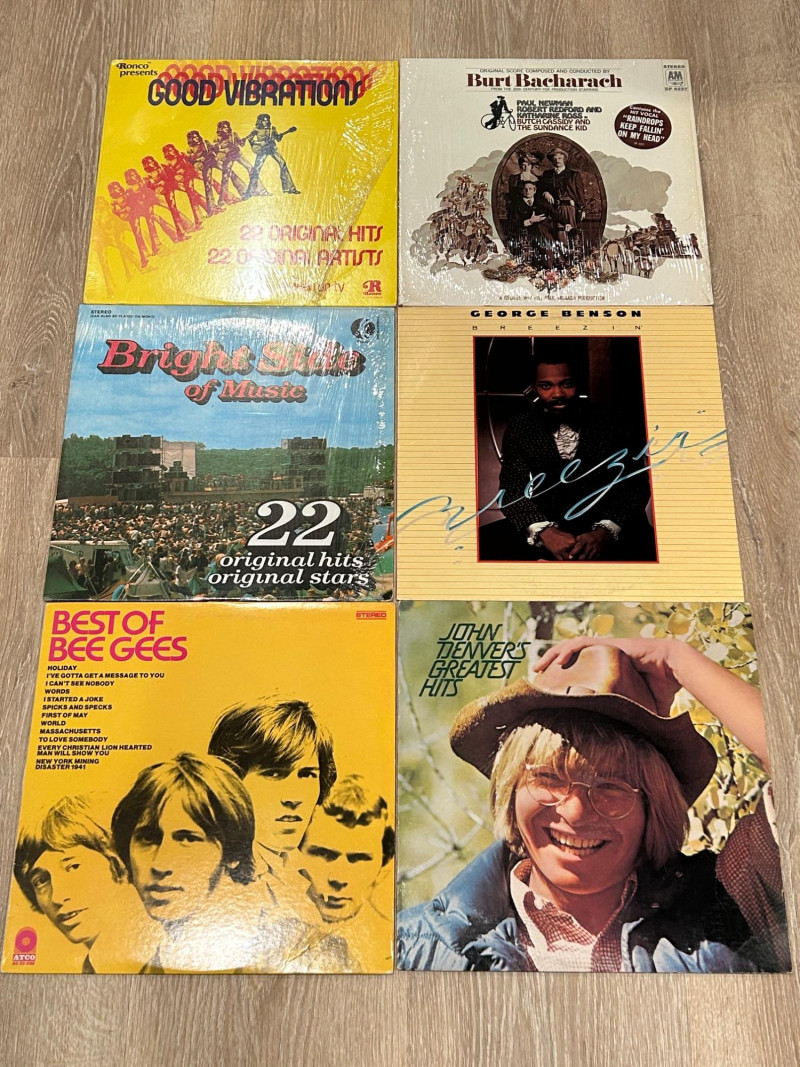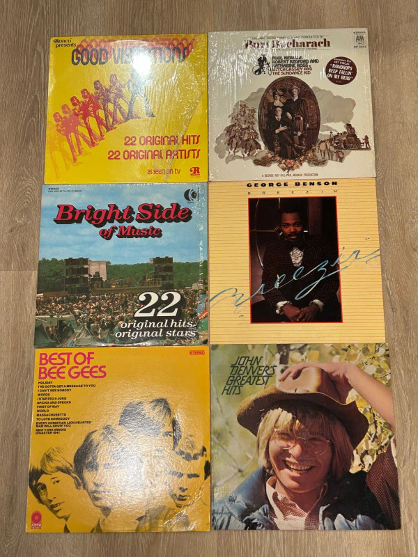 This vintage 6-album vinyl lot features a well-rounded mix of classic pop, folk, soft rock, jazz, and soundtrack music from the late 1960s through the 1970s. Highlights include Breezin’ by George Benson, John Denver’s Greatest Hits, and Best of Bee Gees by the Bee Gees. The collection also includes popular multi-artist compilations (Good Vibrations and Bright Side of Music) and the classic film soundtrack Butch Cassidy and the Sundance Kid (Original Soundtrack), composed by Burt Bacharach. A solid, nostalgic group ideal for collectors, casual listeners, or anyone building a classic vinyl collection. Good Vibrations Bright Side of Music Breezin’ – George Benson Best of Bee Gees – Bee Gees John Denver’s Greatest Hits – John Denver Butch Cassidy and the Sundance Kid (Original Soundtrack) – Burt Bacharach Total: 6 Vinyl LP Albums Format: 12” Vinyl LP records Genres: Pop, Folk, Soft Rock, Jazz, Soundtrack Era: Late 1960s–1970s Labels: ATCO, A&M, RCA Victor, Warner Bros., Ronco, K-TelSet Includes & Side Details:
