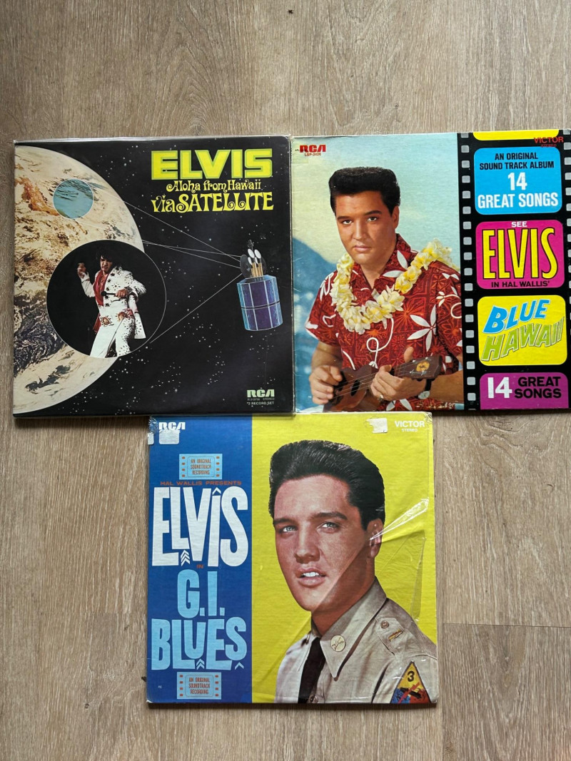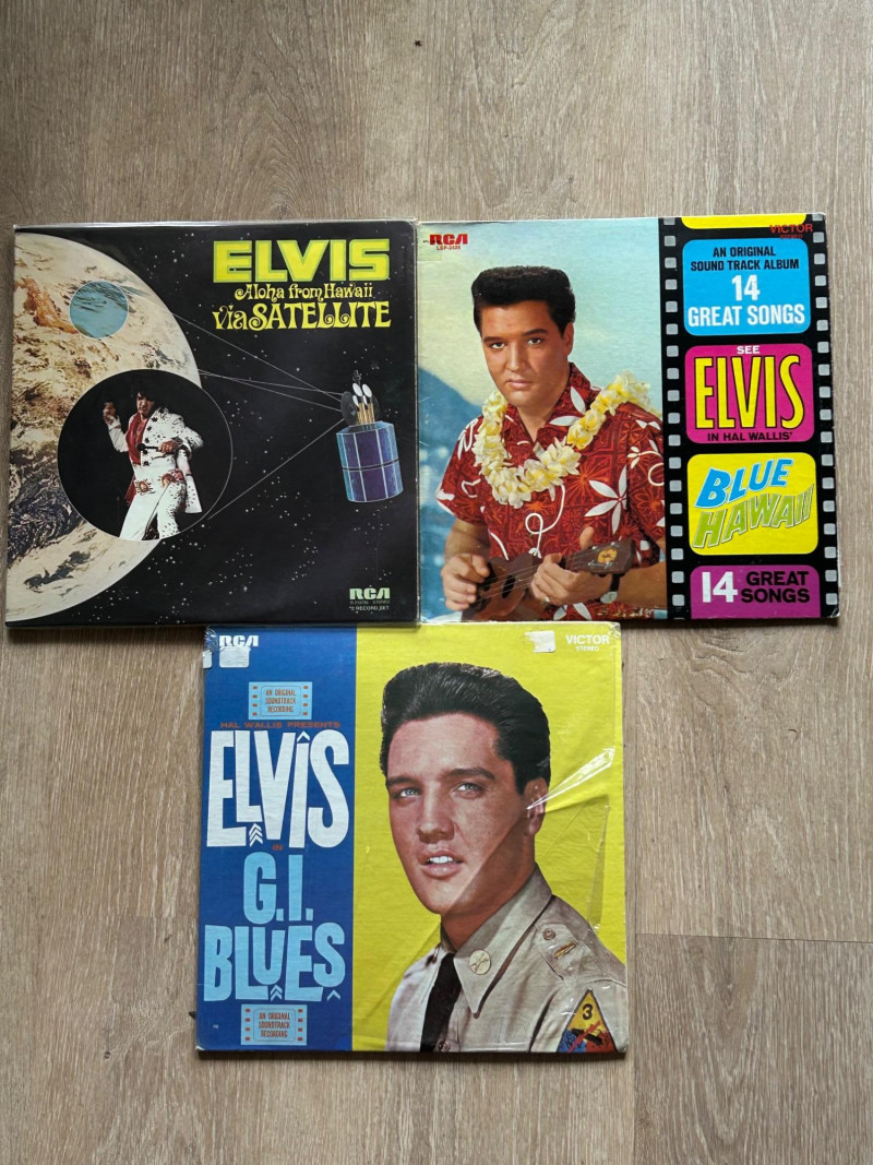 A clean, collector-ready vintage vinyl lot featuring three iconic releases by Elvis Presley. This collection highlights Elvis’s classic Hollywood soundtrack era alongside one of his most famous live concert recordings. The set includes two original soundtrack LPs—G.I. Blues and Blue Hawaii—as well as Aloha from Hawaii via Satellite. All albums feature classic RCA Victor artwork and original labels, making this an attractive and display-worthy grouping for Elvis fans and vintage vinyl collectors. Side A Side B Side A Side B Side A Side B Artist: Elvis Presley Label: RCA Victor Format: 12-inch vinyl LPs Genre: Rock & Roll / Pop / Film Soundtrack / Live Era: 1960s–1970sSet Includes & Side Details
