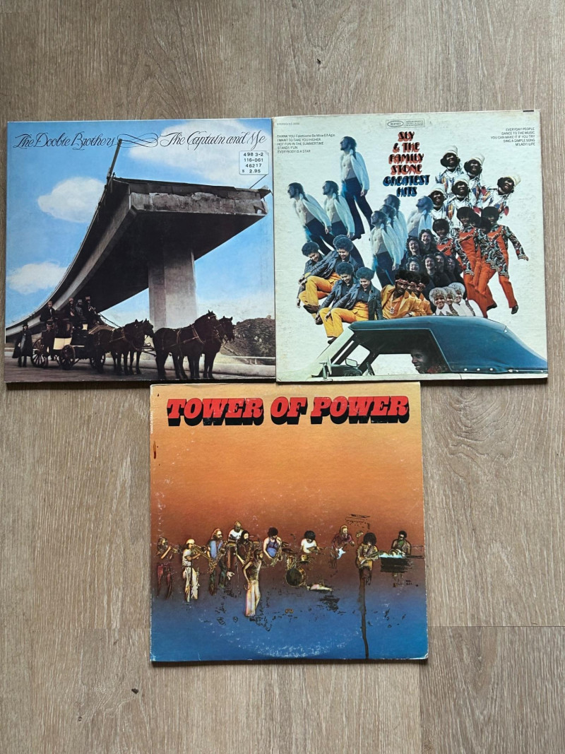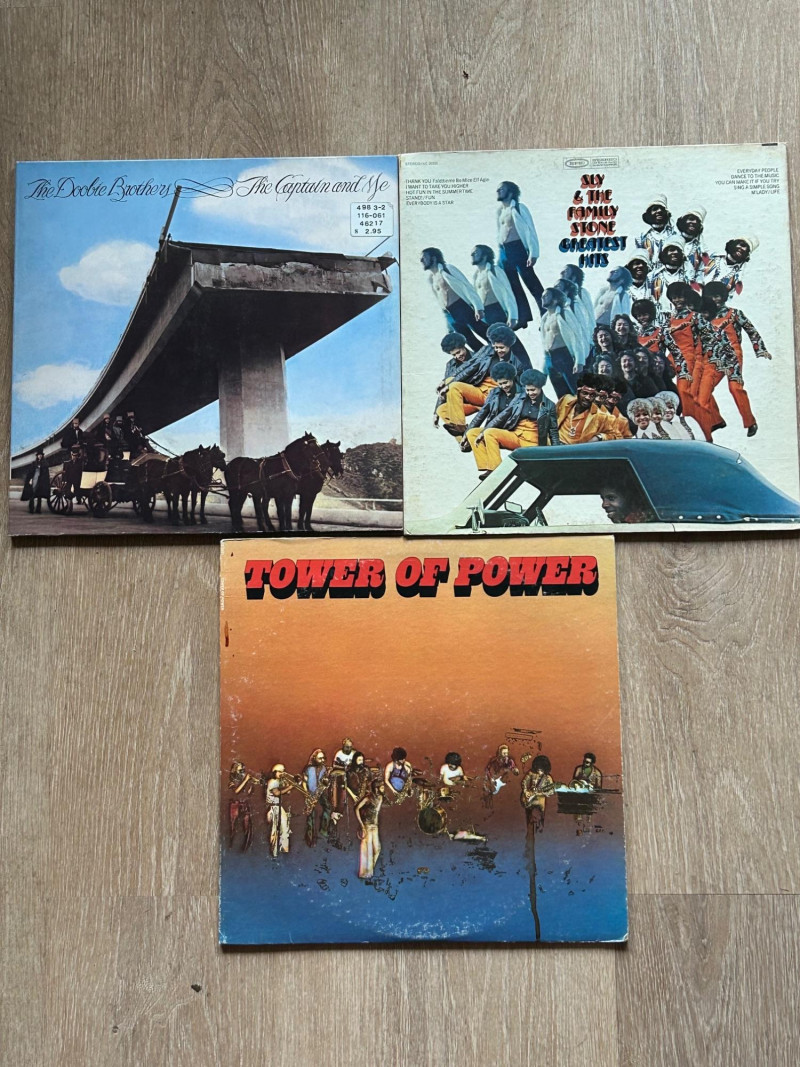 A well-rounded trio of essential 1970s funk, soul, and rock albums from three legendary American acts: Tower of Power, Sly & The Family Stone, and The Doobie Brothers. Known for their influential sound, tight musicianship, and timeless appeal, these records remain staples in classic vinyl collections. All albums come with original sleeves and authentic vintage pressings. Sleeves show noticeable age-related wear, including edge wear, scuffing, and handling marks. Vinyl surfaces appear glossy with light surface marks consistent with normal use. A solid lot for collectors, DJs, or fans of classic funk, soul, and 1970s rock. The Captain and Me – The Doobie Brothers Single LP Side A / Side B Greatest Hits – Sly & The Family Stone Single LP Side A / Side B Tower of Power – Tower of Power Single LP Side A / Side B Total: 3 vinyl LP records Format: 12" Vinyl LP Speed: 33⅓ RPM Genre: Funk / Soul / Rock Era: 1970s Sleeves: Original covers includedSet Includes & Side Details: