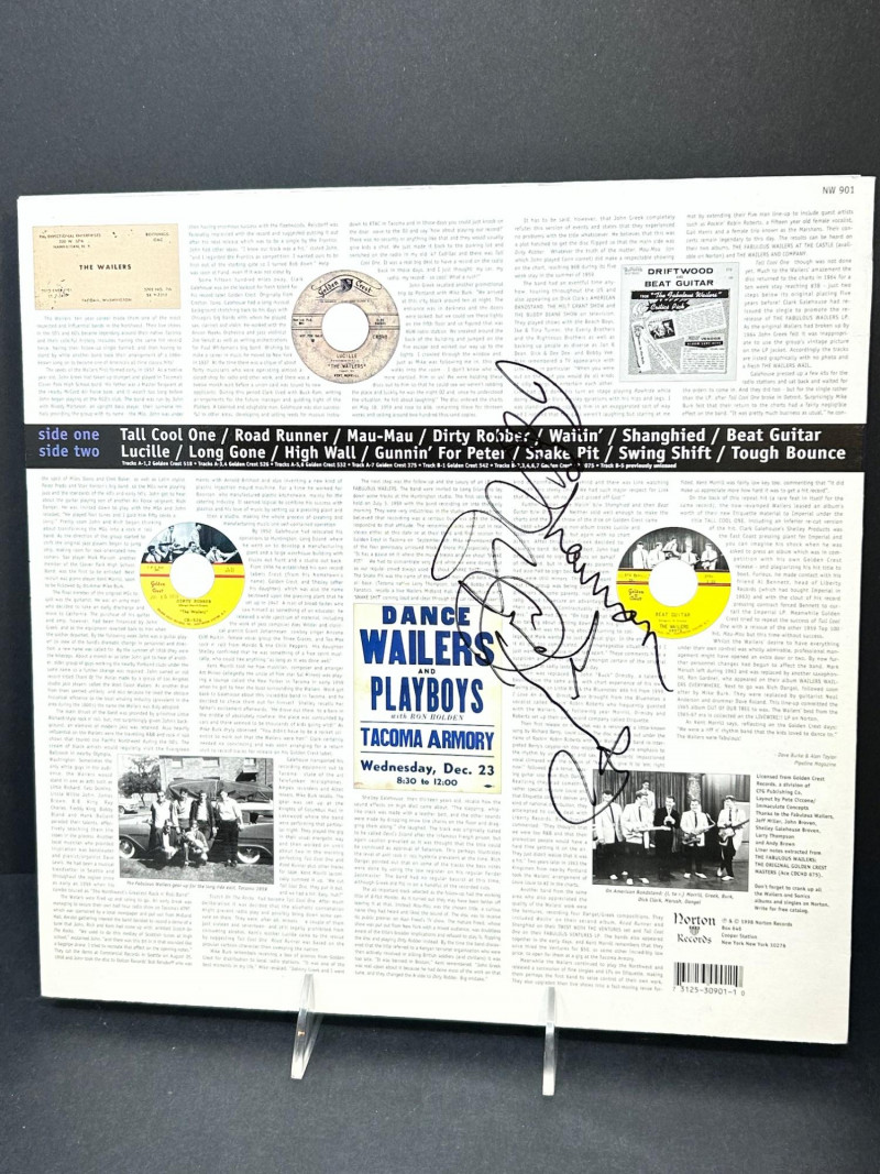 Original pressing of The Fabulous Wailers, the classic Northwest rock & roll album issued on Norton Records (NW 901). This copy features a hand-signed front cover with multiple autographs visible across the band photo, making it a standout piece for collectors of early garage rock and Pacific Northwest music history. The iconic black-and-white sleeve showcases the band in performance, while the record itself retains its original Norton Records center labels and plays at 33⅓ RPM microgroove. Also included is the original inner sleeve, and the back cover displays liner notes, photos, and period advertisements. A desirable vintage LP combining historical significance, striking presentation, and autograph appeal. Artist: The Fabulous Wailers Title: The Fabulous Wailers Label: Norton Records Catalog Number: NW 901 Format: Vinyl LP, 33⅓ RPM Country: USA Cover: Autographed front cover (multiple signatures visible) Sleeve: Original printed sleeve with liner notes and photos Playback Speed: Long Playing 33⅓ MicrogrooveDetails: