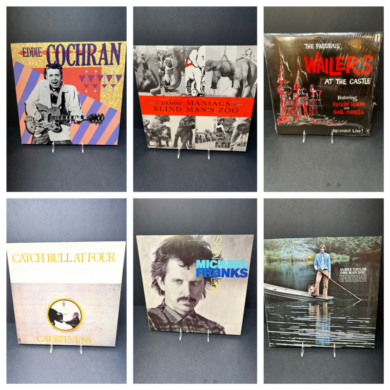 This six-album vintage vinyl lot brings together a diverse mix of classic rock & roll, folk, reggae, alternative, and smooth jazz-pop from the 1960s through the late 1980s. The collection features well-known artists and visually striking original cover artwork, making it appealing both as a listening set and as a display-worthy group for collectors. This is an ideal bundle for anyone looking to expand a classic vinyl collection with recognizable titles, or for resellers seeking a solid multi-genre lot that spans several influential eras in popular music. Great Hits – Eddie Cochran Side A / Side B Blind Man’s Zoo – 10,000 Maniacs Side A / Side B At the Castle – The Wailers Side A / Side B Catch Bull at Four – Cat Stevens Side A / Side B Skin Dive – Michael Franks Side A / Side B One Man Dog – James Taylor Side A / Side BSet Includes (6 LPs)