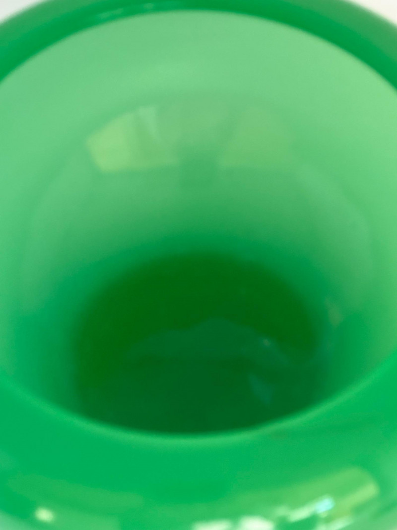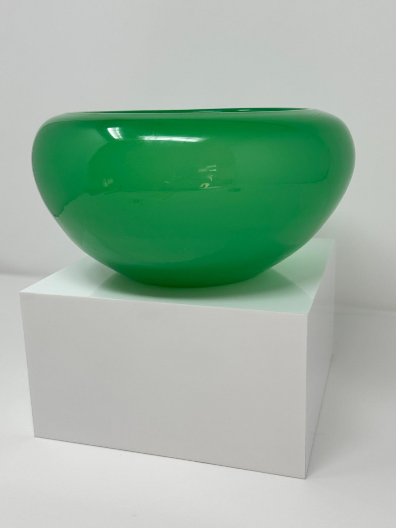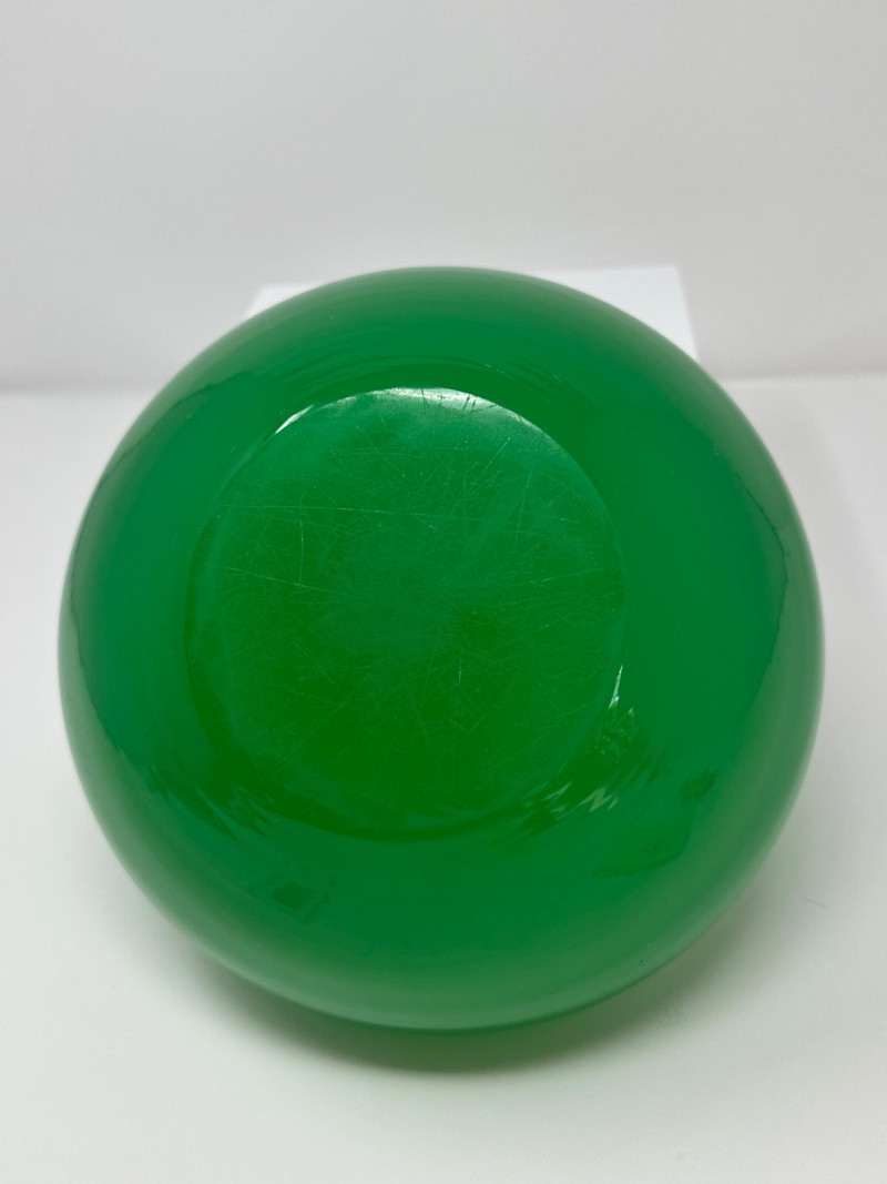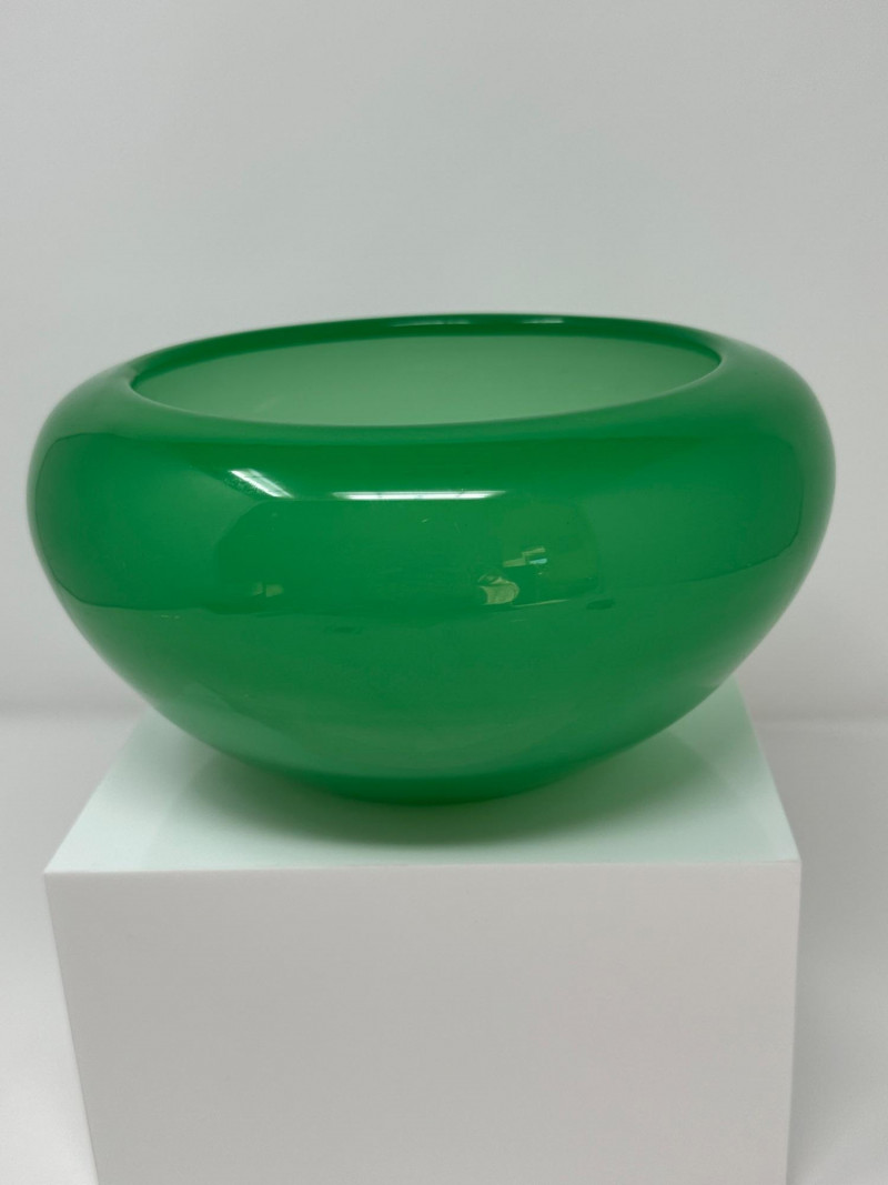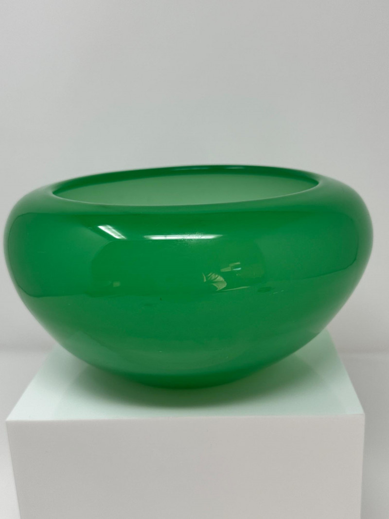 A luminous Steuben art glass bowl in rich jade green, dating to circa 1930. This elegant piece features a rounded, low-profile form with a wide open mouth and subtly tapered base, showcasing Steuben’s signature clarity and depth of color. The surface gleams with a high-gloss finish, and the minimalist silhouette highlights the refined craftsmanship of Frederick Carder’s era.