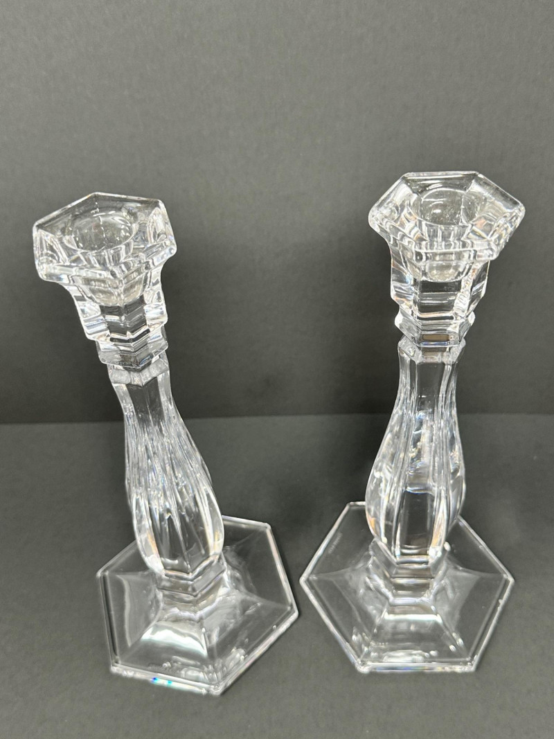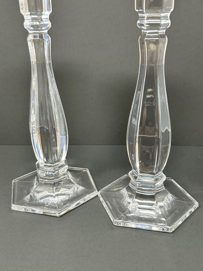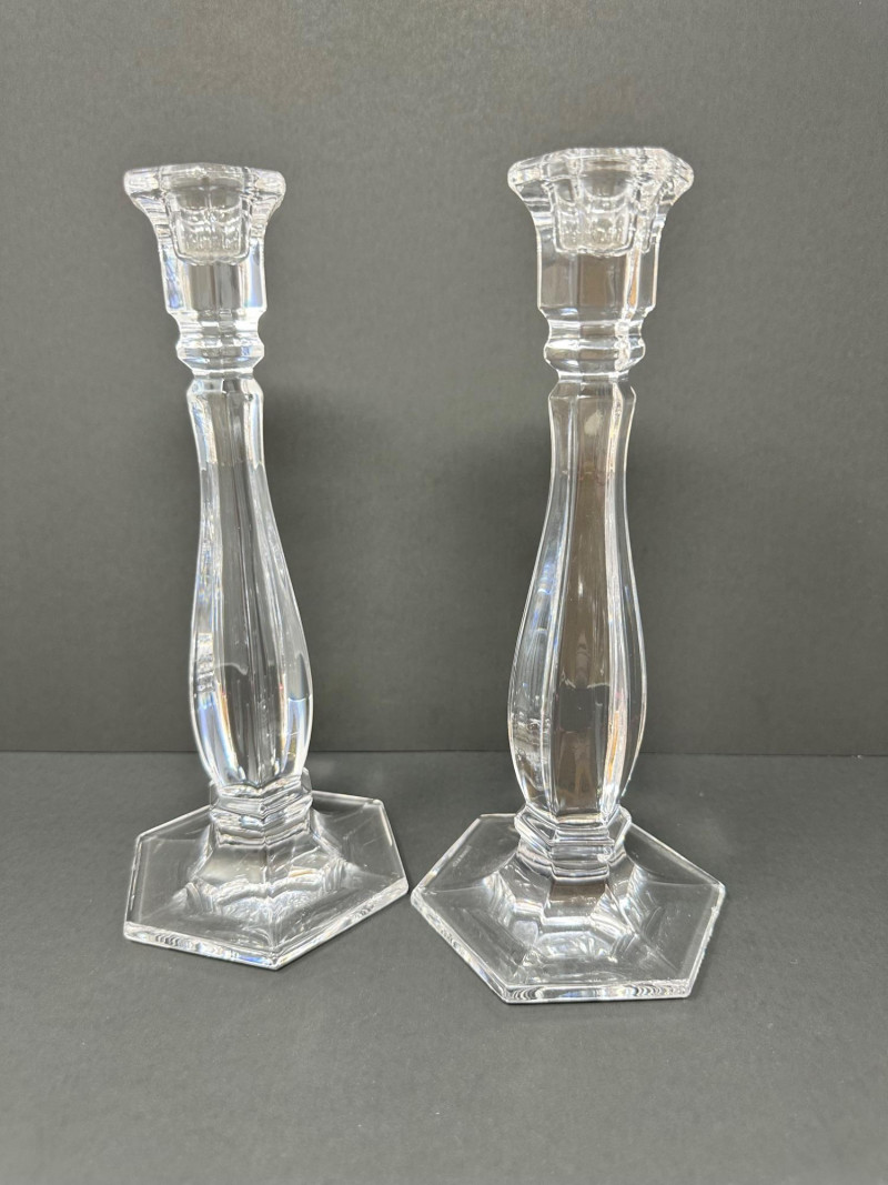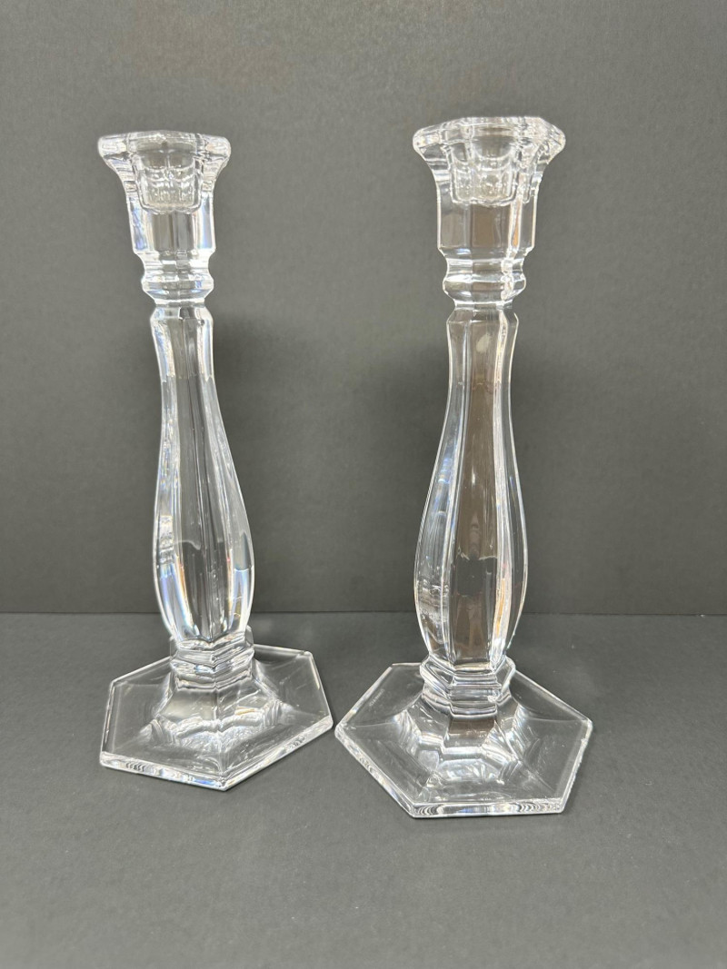 A refined matching pair in clear, high‑quality Tiffany crystal. Each features a hexagonal base, sharply faceted stem, and flared candle cup that catches light beautifully. Classic Tiffany weight and clarity. No chips or cracks noted.