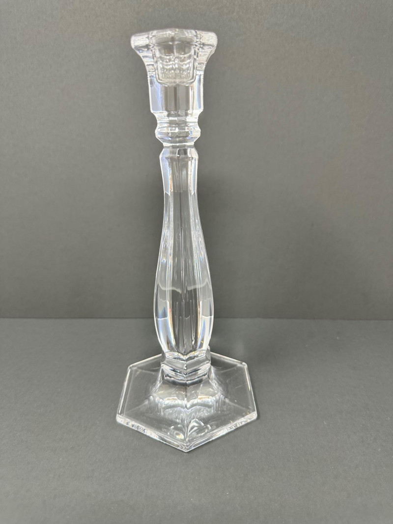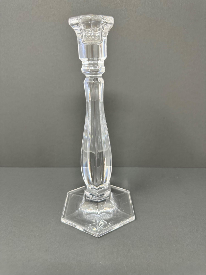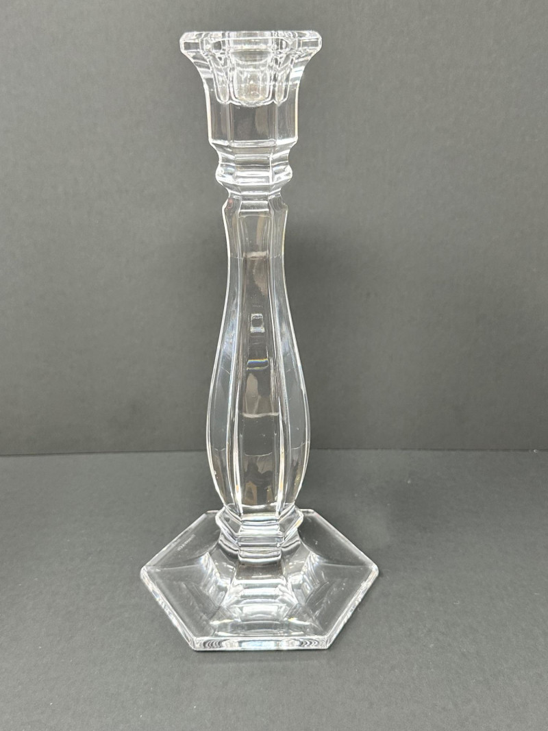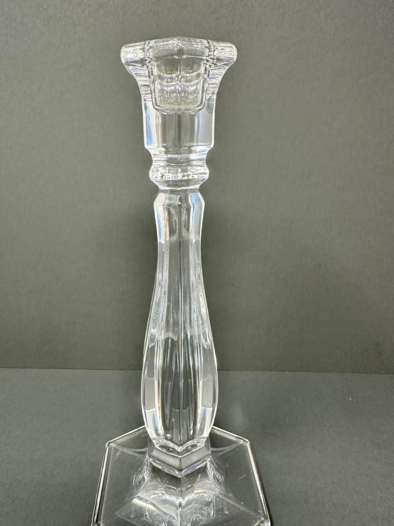 A refined matching pair in clear, high‑quality Tiffany crystal. Each features a hexagonal base, sharply faceted stem, and flared candle cup that catches light beautifully. Classic Tiffany weight and clarity. No chips or cracks noted.