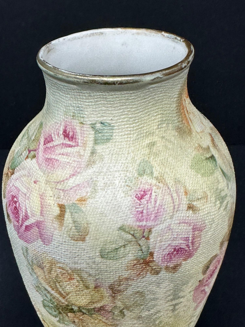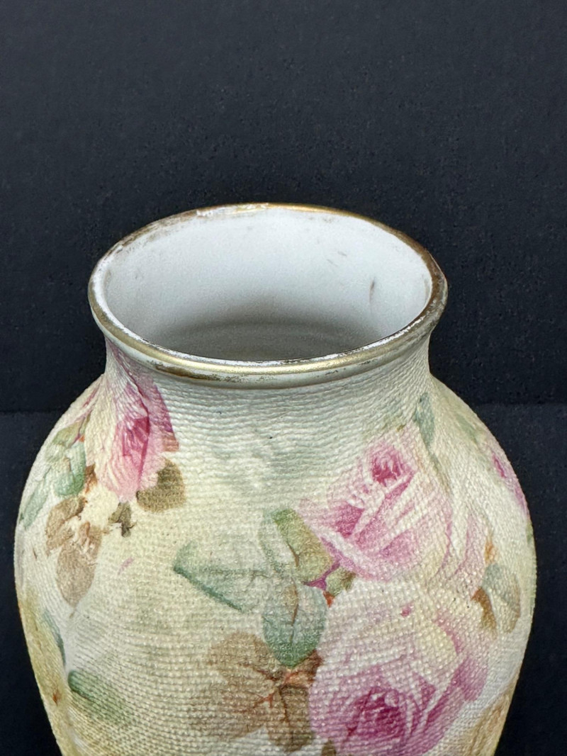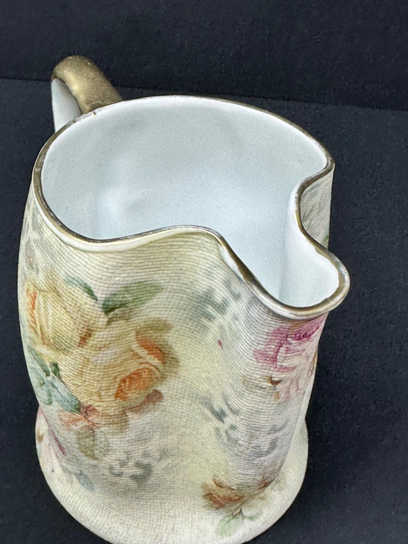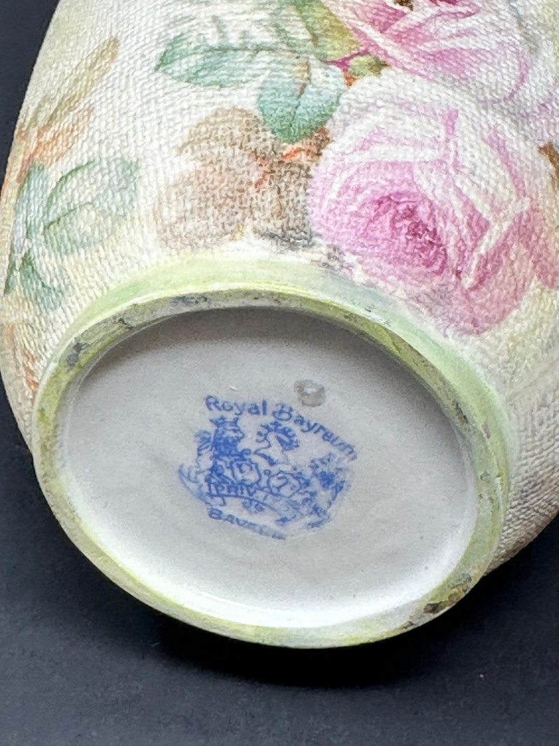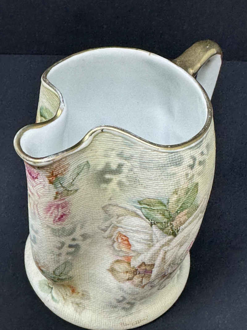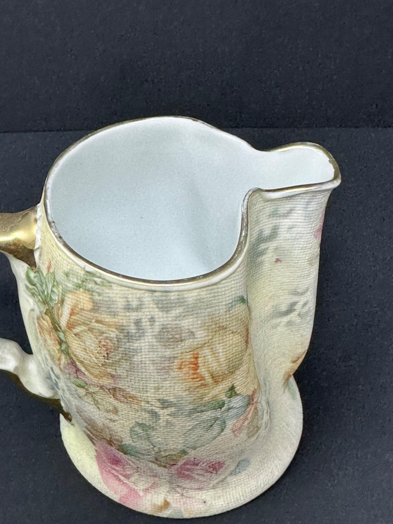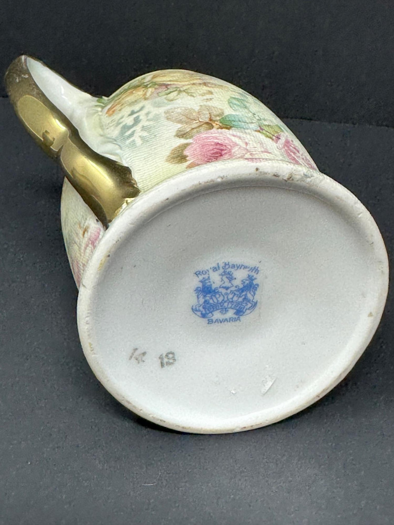 A charming pair of Royal Bayreuth porcelain pieces featuring a small vase and a matching creamer, each adorned with soft pastel roses and leafy accents. The creamer includes a graceful spout and handle, while the vase offers a rounded form with a narrow neck. Both pieces are finished with a textured glaze that mimics fabric or crackle, enhancing their vintage appeal. Crafted in Bavaria in the early 20th century, these delicate forms reflect Royal Bayreuth’s tradition of romantic floral design and fine porcelain artistry. Please note-some wear around rim on gold paint. subtle Vase- 5.25 T x 3 W Creamer- 3.5 x 4 W