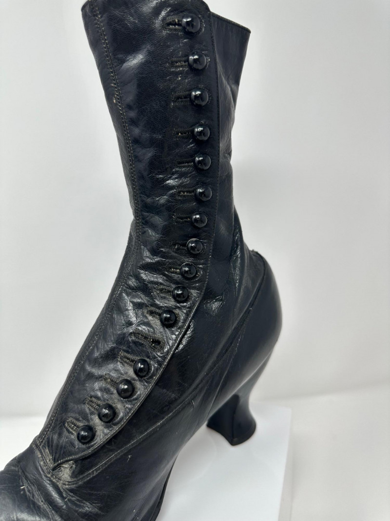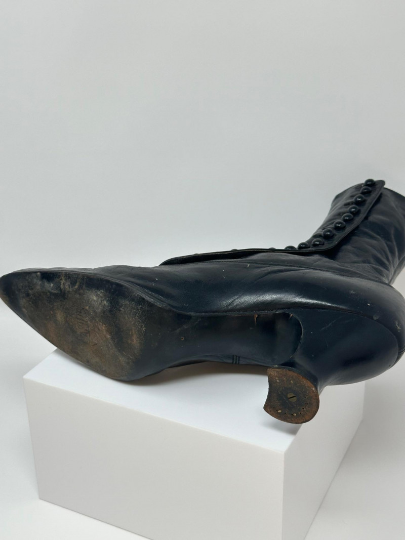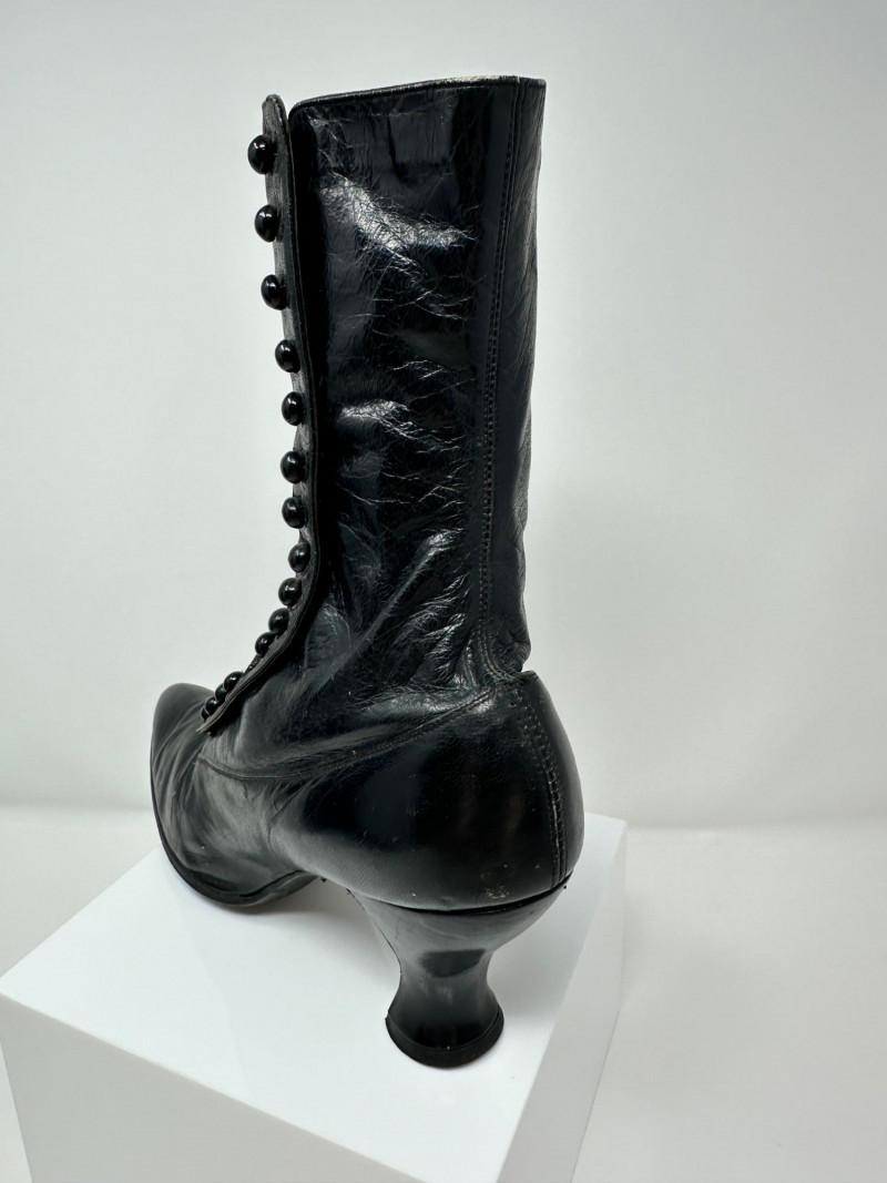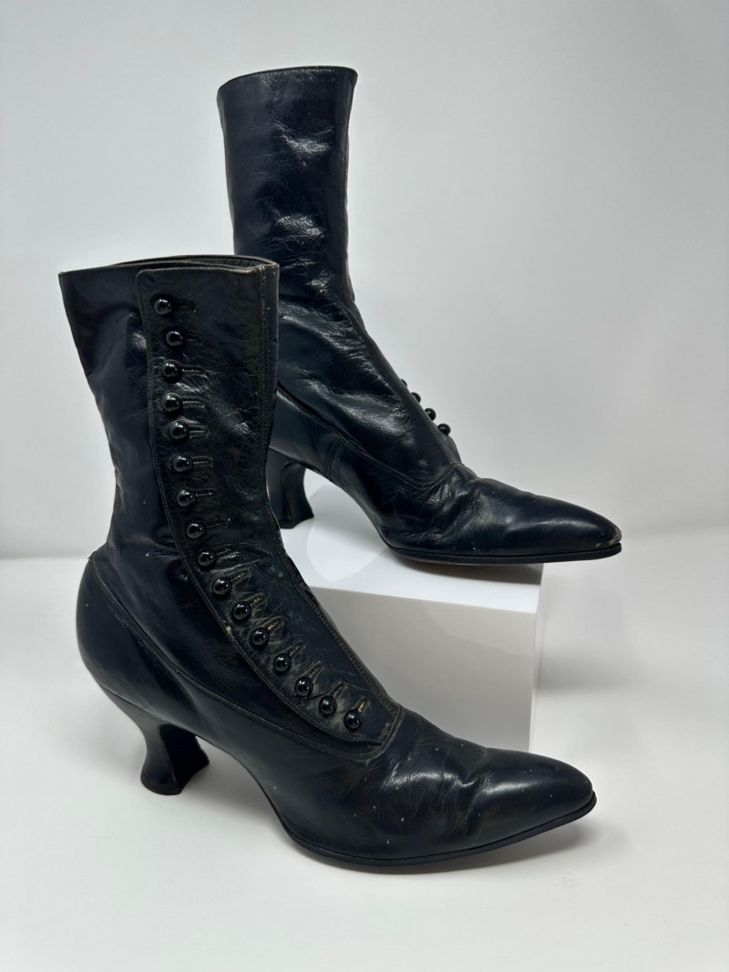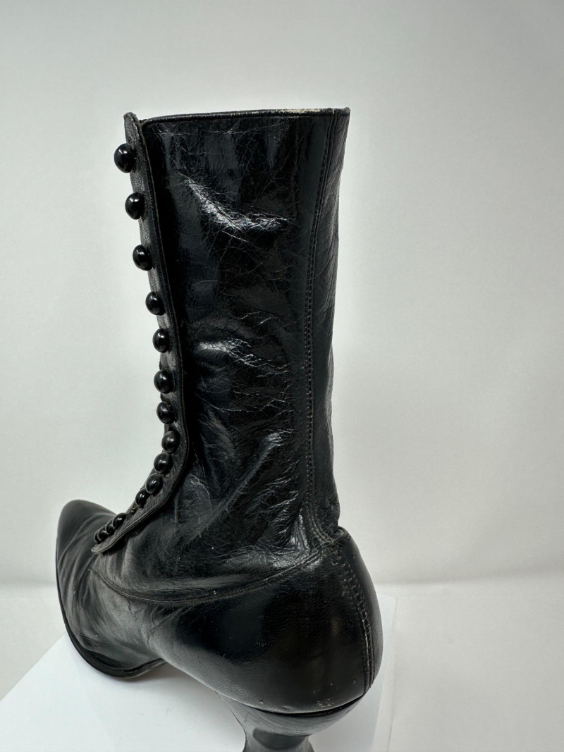 A pair of antique black leather button-up boots dating to the late Victorian or early Edwardian era, featuring a high ankle silhouette and modest heel. Crafted with a row of functional side buttons, these boots reflect the refined style and craftsmanship of turn-of-the-century women's footwear. Please note-one button appears to be missing. The length of the boot measures 10"