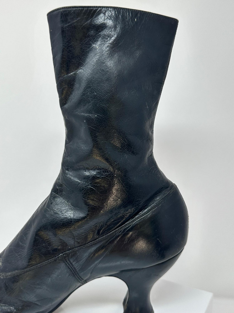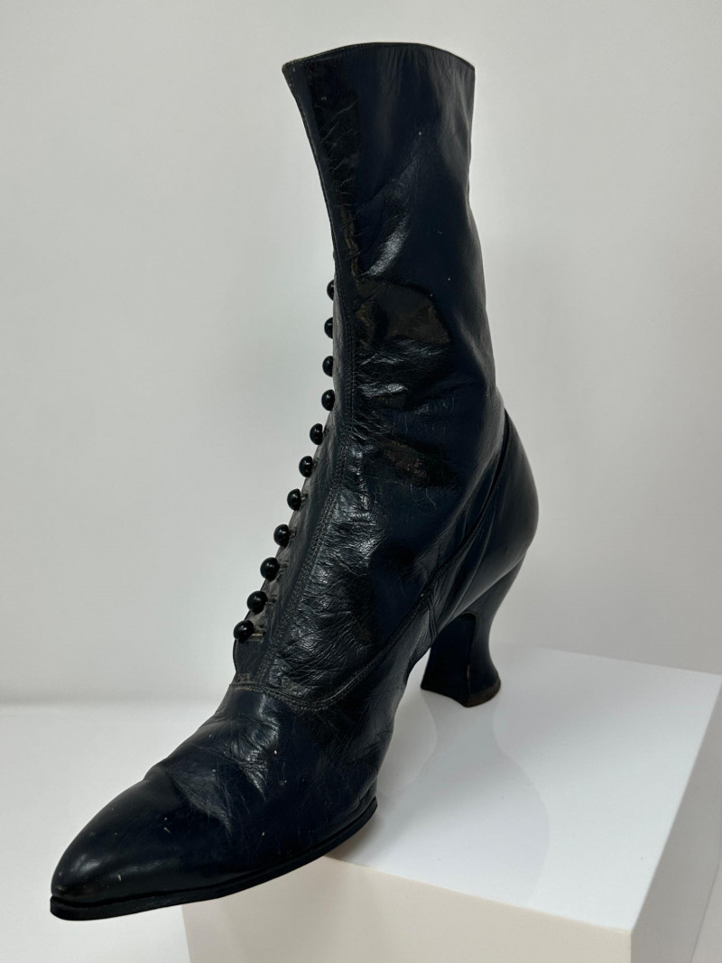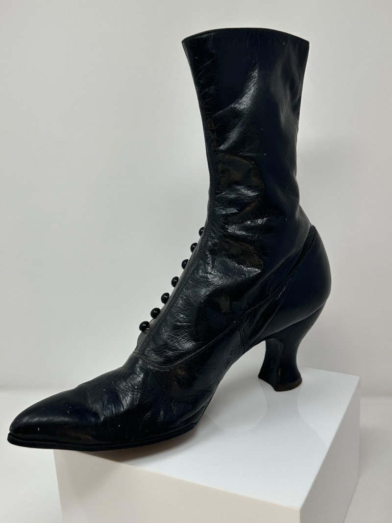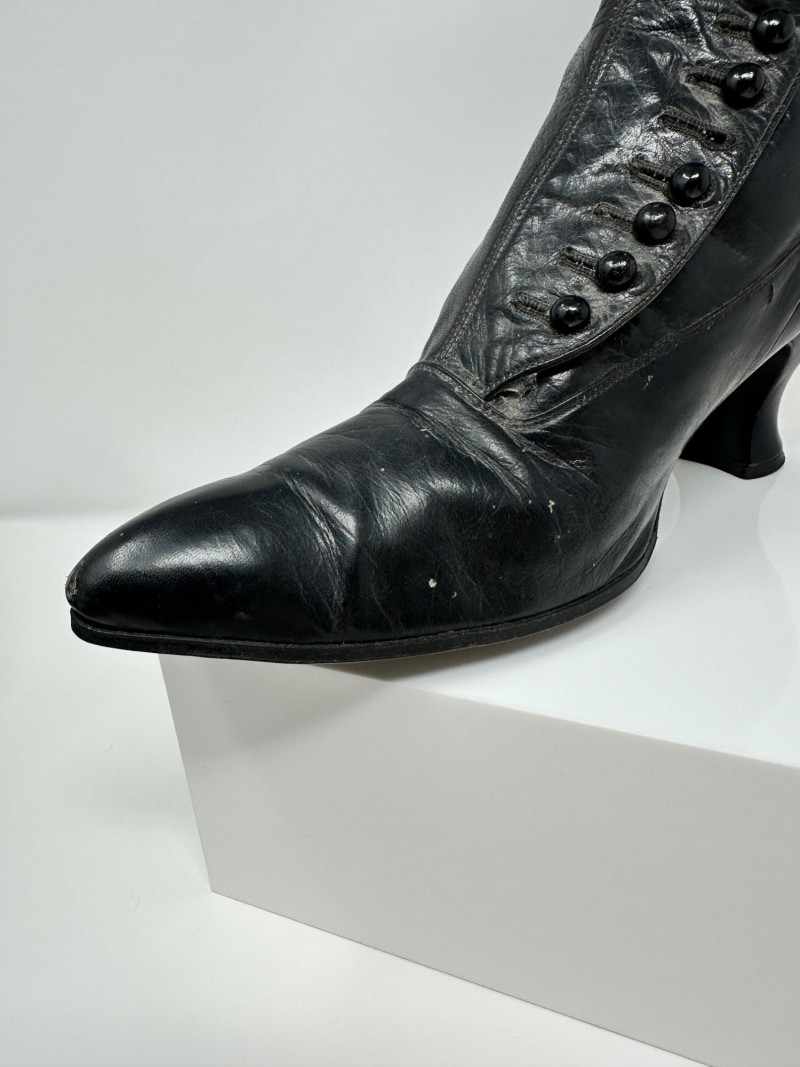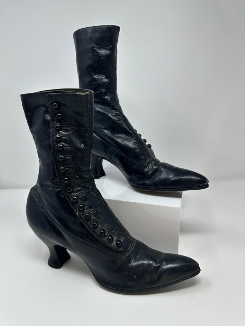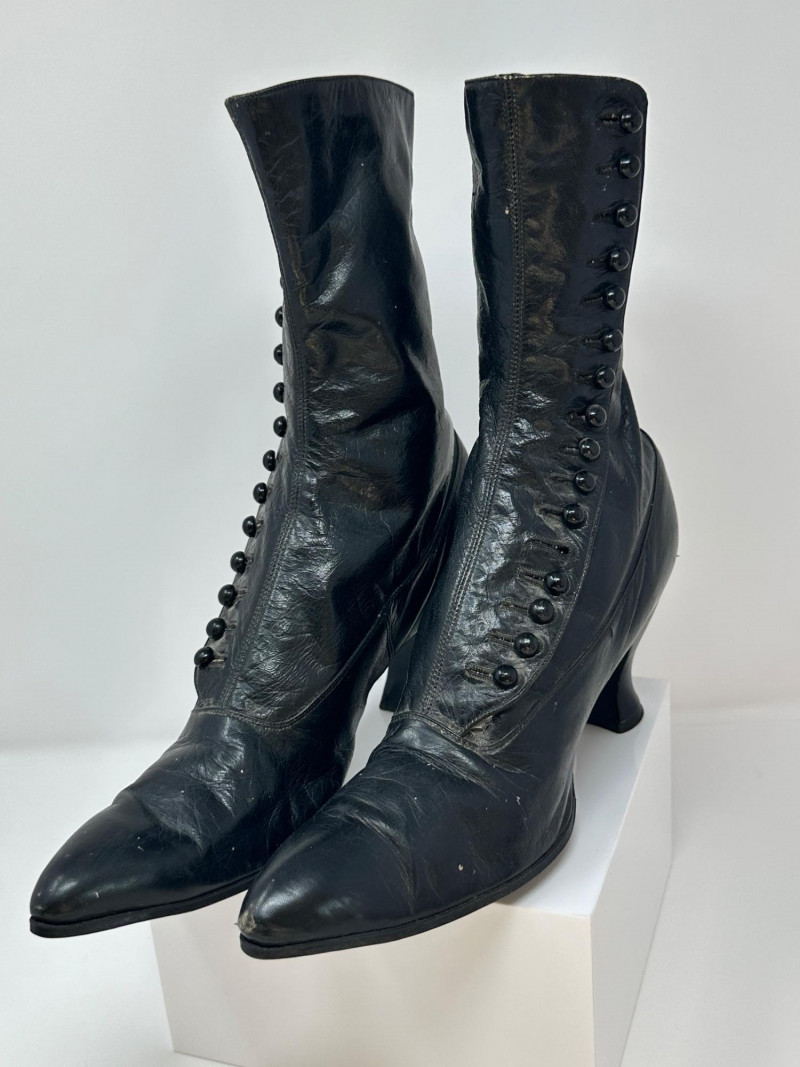 A pair of antique black leather button-up boots dating to the late Victorian or early Edwardian era, featuring a high ankle silhouette and modest heel. Crafted with a row of functional side buttons, these boots reflect the refined style and craftsmanship of turn-of-the-century women's footwear. Please note-one button appears to be missing. The length of the boot measures 10"