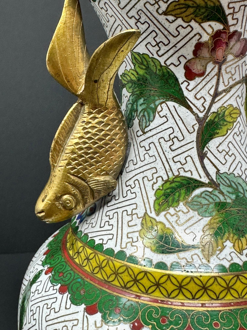 A richly decorated Chinese cloisonné bronze vase dating to circa 1900, featuring a striking blend of geometric and floral motifs. The body showcases a maze-like black pattern over a white ground, adorned with vibrant enamel blossoms in red, blue, yellow, and green. Twin gilt fish-form handles emerge from the neck, adding sculptural elegance and symbolic charm. Accents of gold at the rim and base, along with decorative bands in green and red, complete the design. A fine example of late Qing dynasty cloisonné artistry.