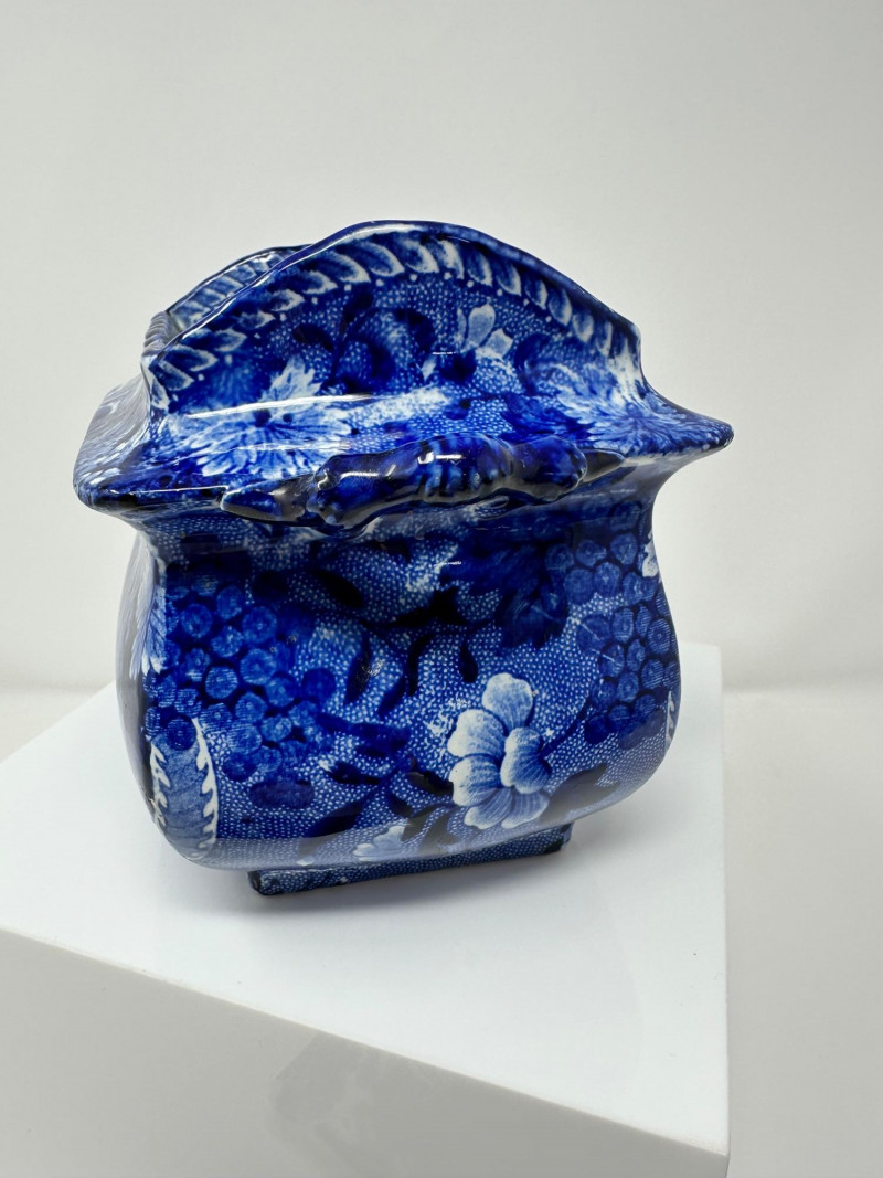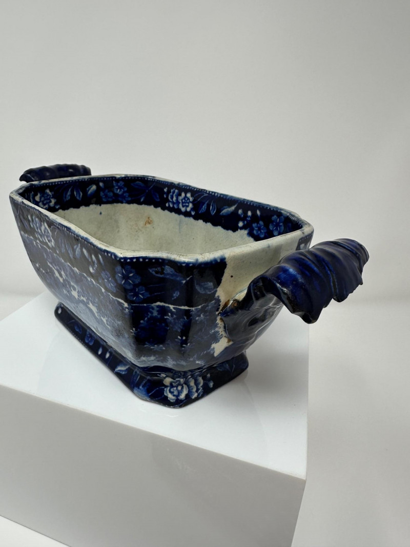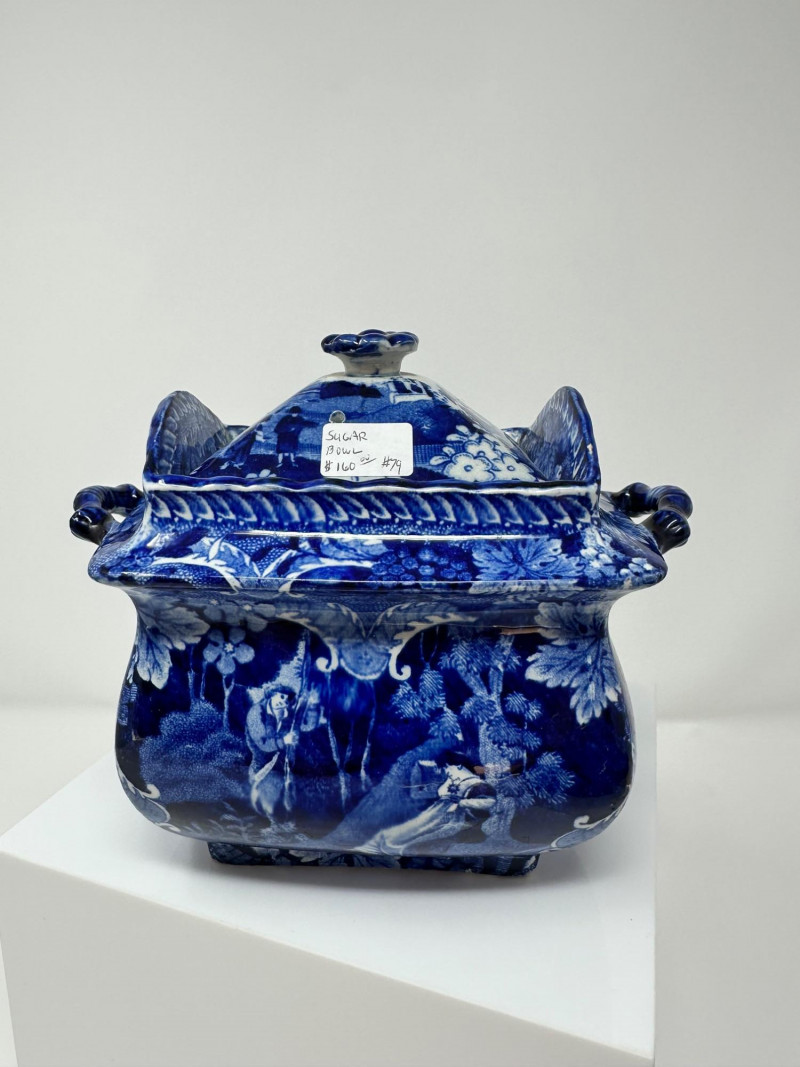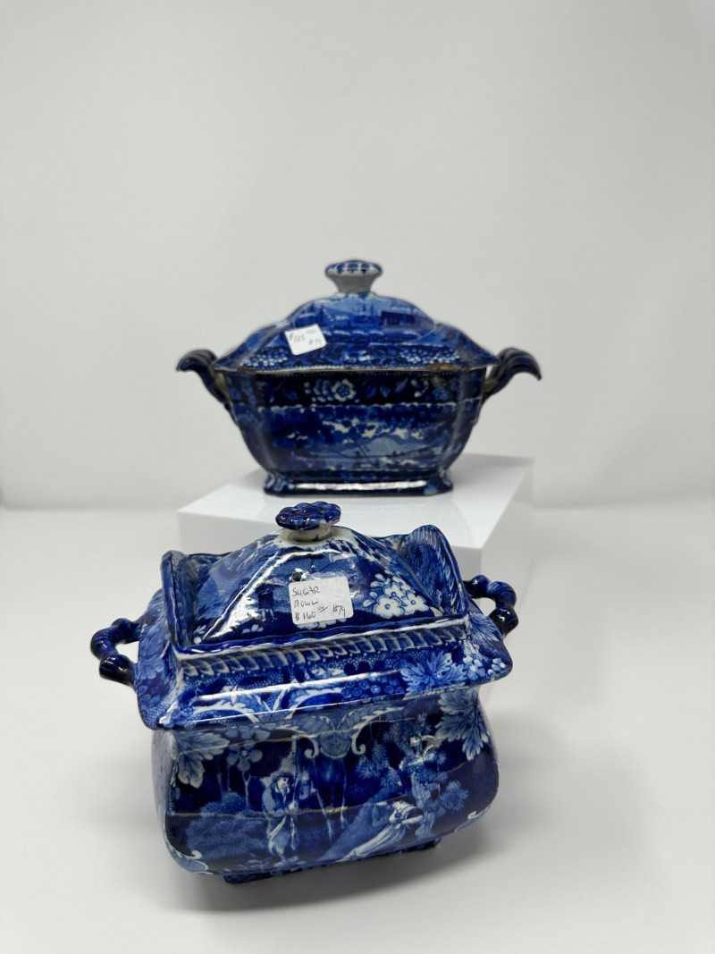 A refined pair of Staffordshire flow blue serving pieces, including a lidded sugar bowl and a covered gravy boat, each adorned with rich cobalt blue transferware designs. The sugar bowl features a squared body with ornate handles and a domed lid, while the gravy boat presents a rounded form with matching lid and integrated handle. Both pieces showcase romantic floral and scenic motifs softened by the signature “flow” effect, a hallmark of 19th-century English pottery. These elegant tablewares reflect the artistry of Staffordshire’s Victorian-era production and remain highly collectible for lovers of antique ceramics and blue-and-white ware.