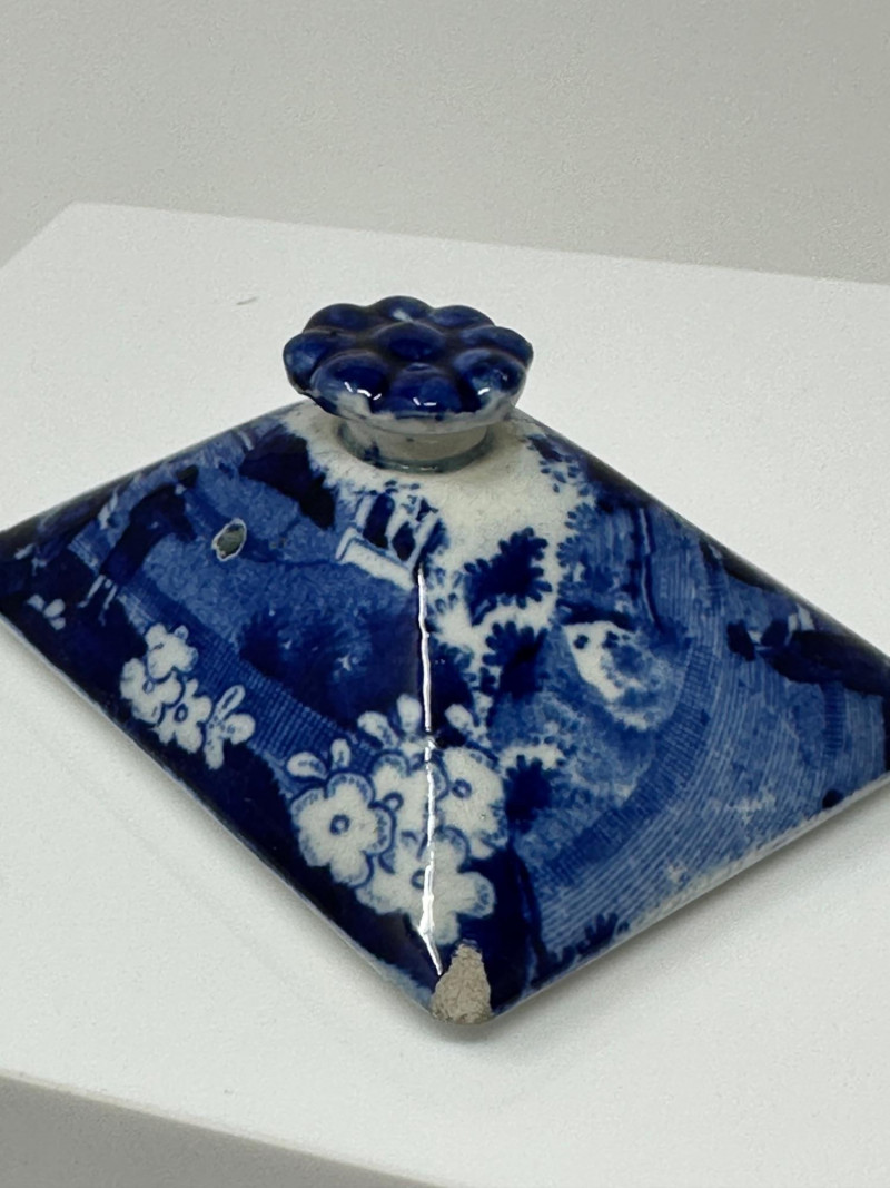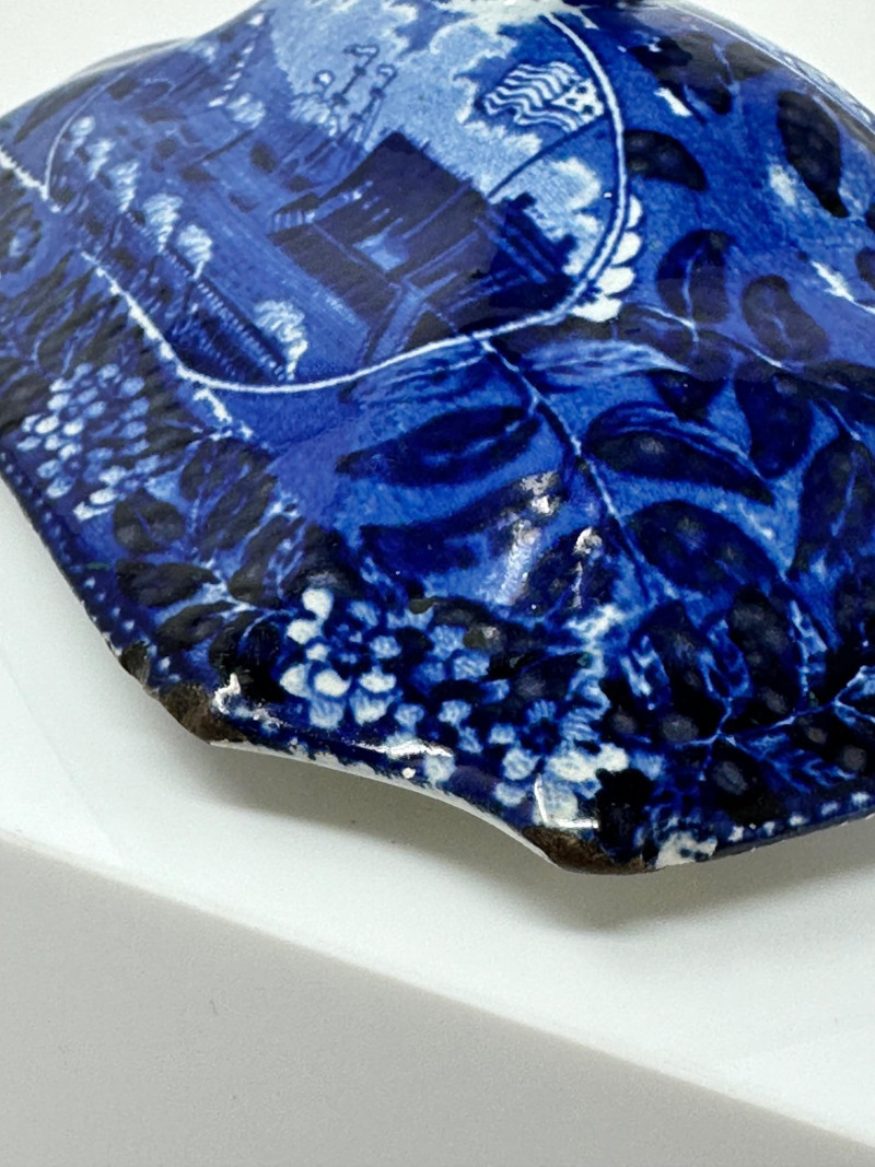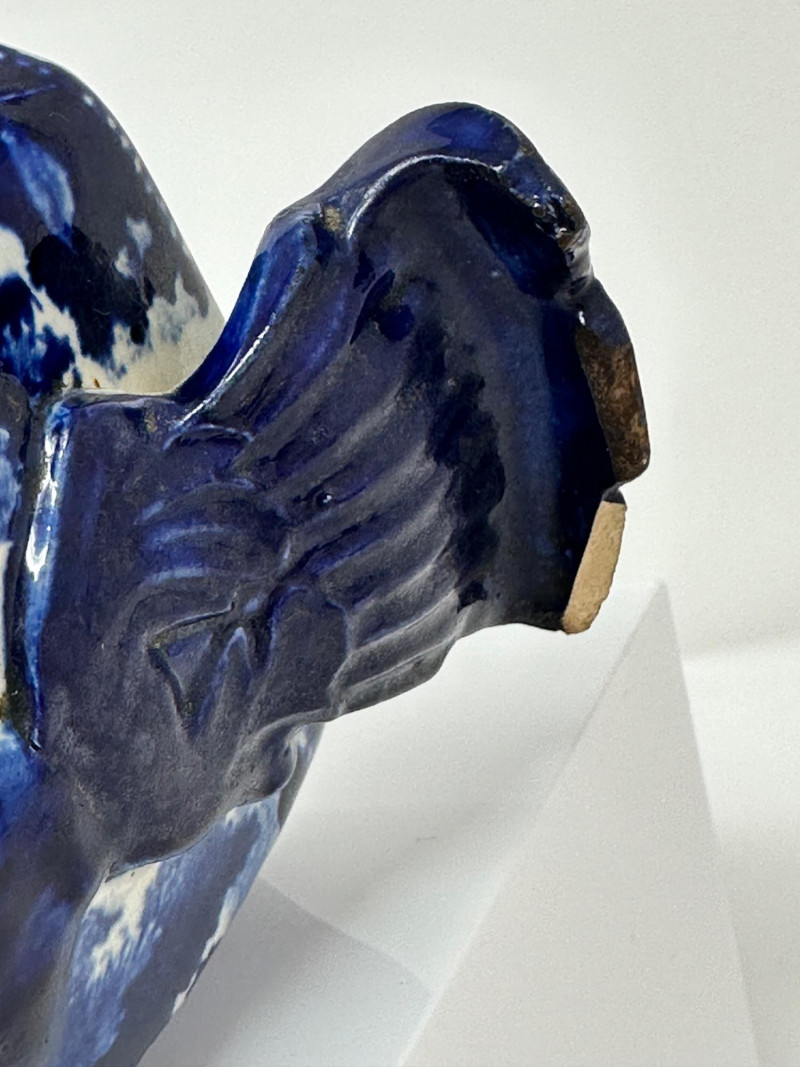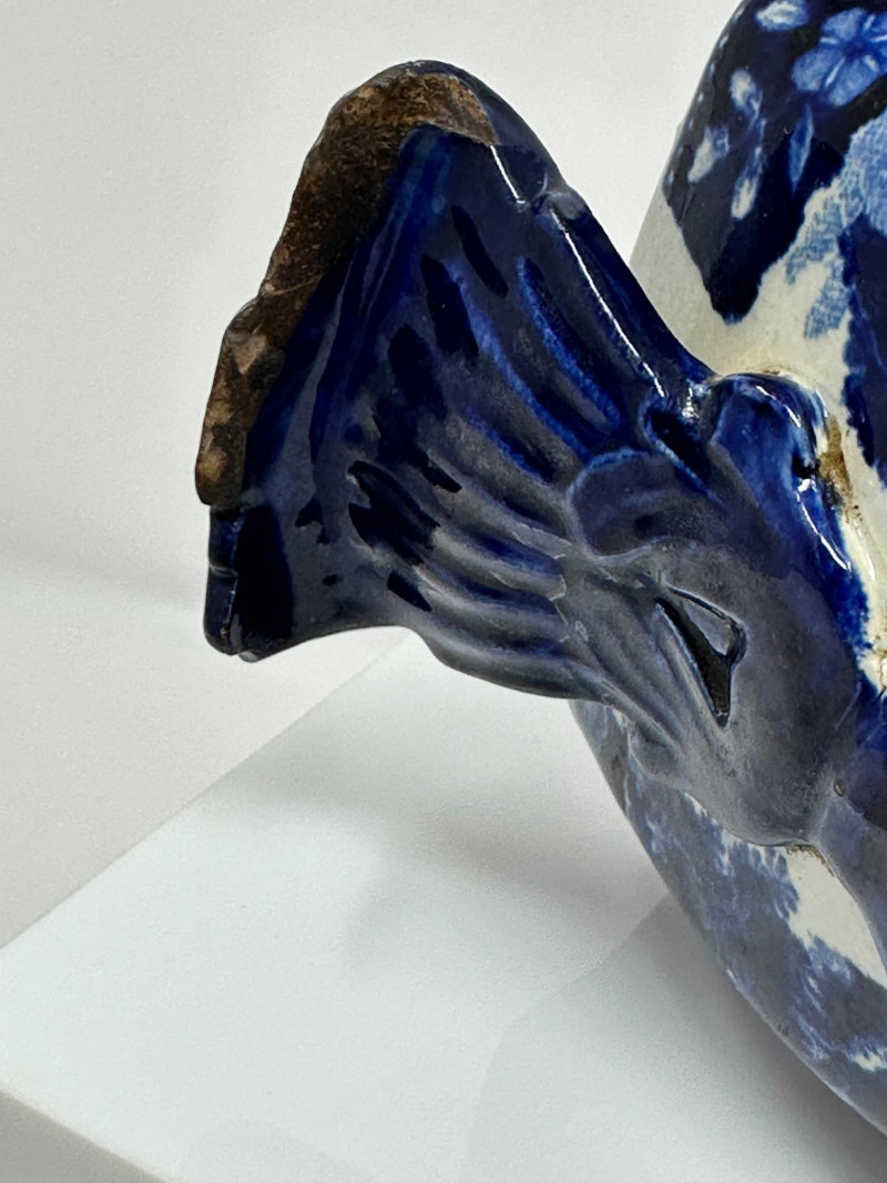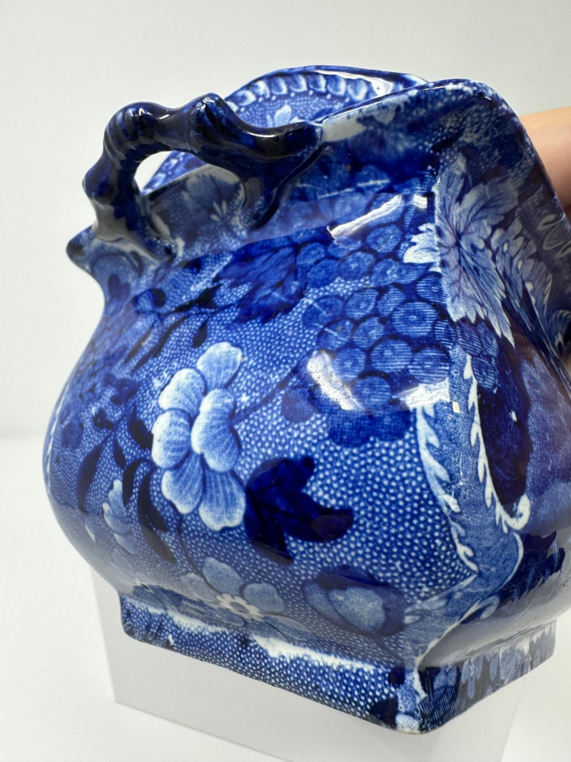 A refined pair of Staffordshire flow blue serving pieces, including a lidded sugar bowl and a covered gravy boat, each adorned with rich cobalt blue transferware designs. The sugar bowl features a squared body with ornate handles and a domed lid, while the gravy boat presents a rounded form with matching lid and integrated handle. Both pieces showcase romantic floral and scenic motifs softened by the signature “flow” effect, a hallmark of 19th-century English pottery. These elegant tablewares reflect the artistry of Staffordshire’s Victorian-era production and remain highly collectible for lovers of antique ceramics and blue-and-white ware.