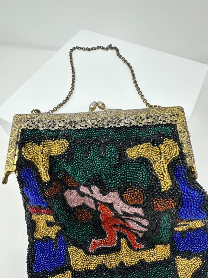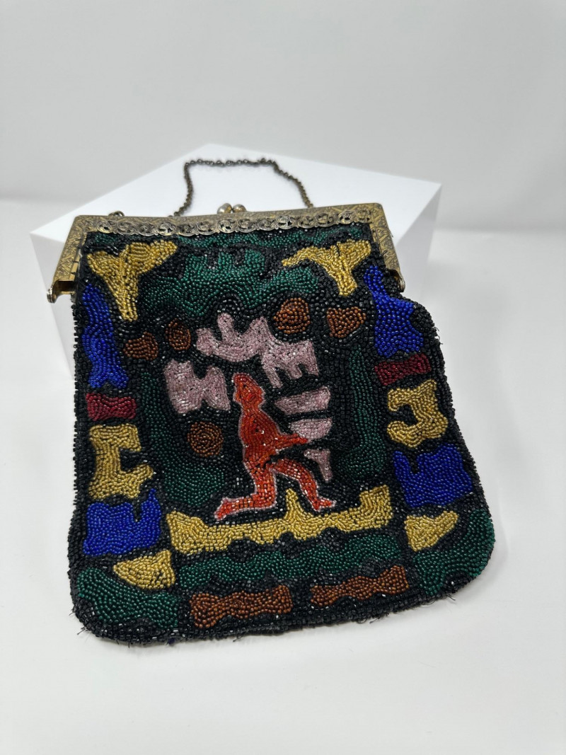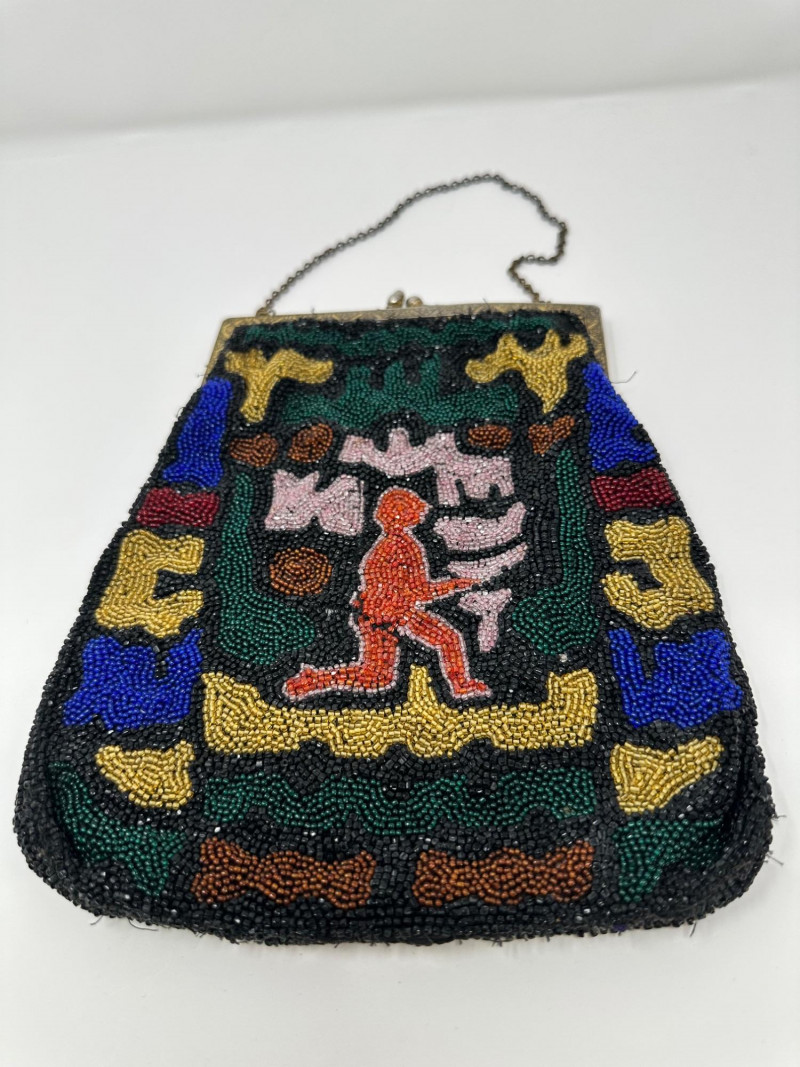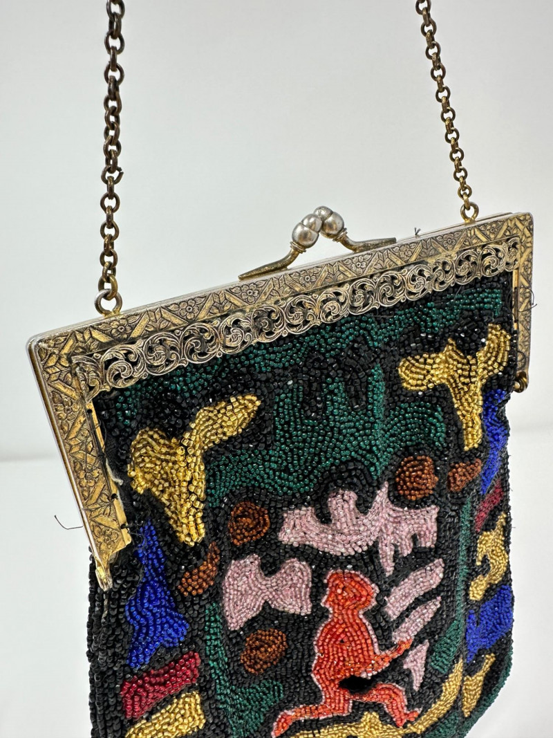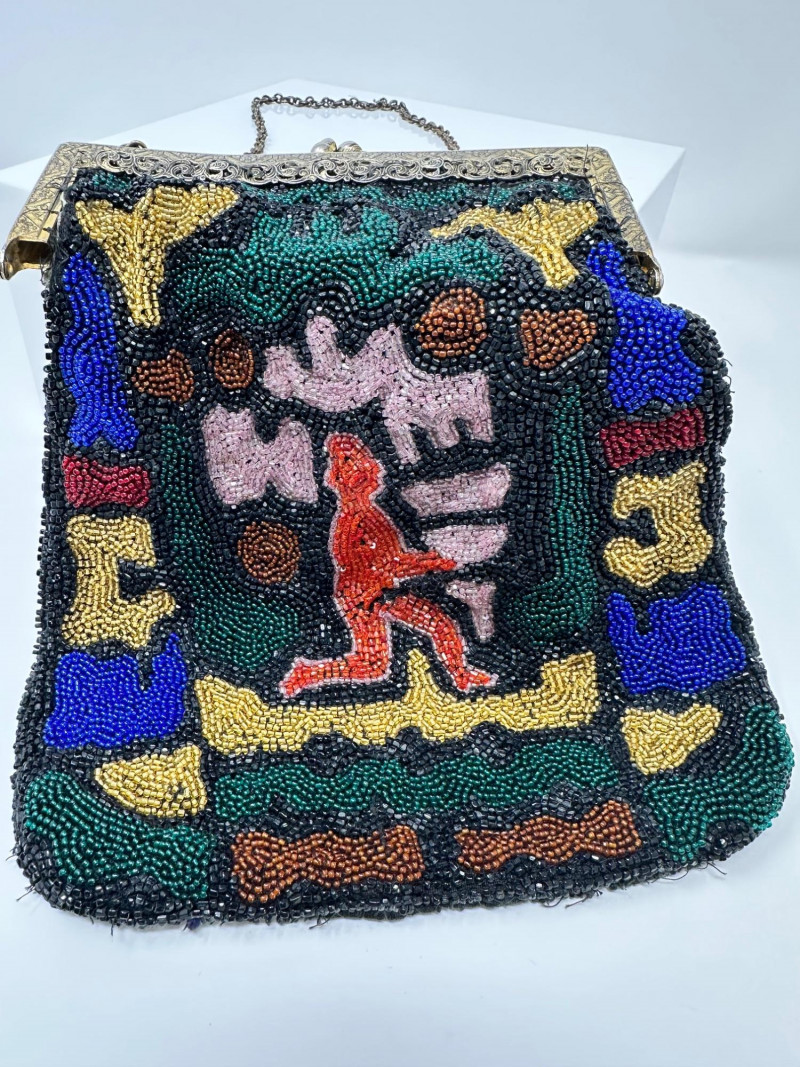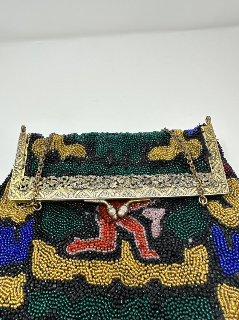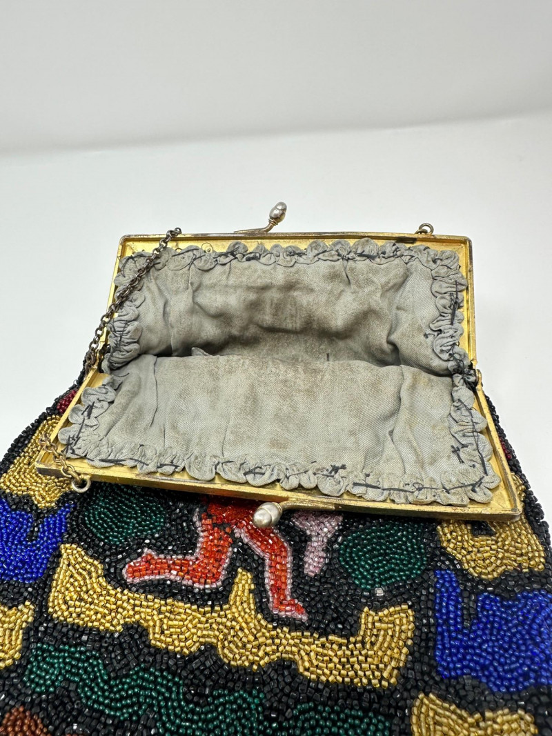 Description: A vibrant early 20th‑century glass beaded evening purse featuring an expressive Art Deco–era figural design rendered in richly colored beads. The central red figure appears in dynamic motion, surrounded by bold geometric and abstract patterns in pink, green, yellow, blue, and black. The beadwork is densely hand‑applied, creating a striking textured surface. The purse is finished with an ornate metal frame and clasp, decorated with engraved scrollwork and fitted with a matching chain handle. Please note- small hole in middle of one side of purse, see pictures.
