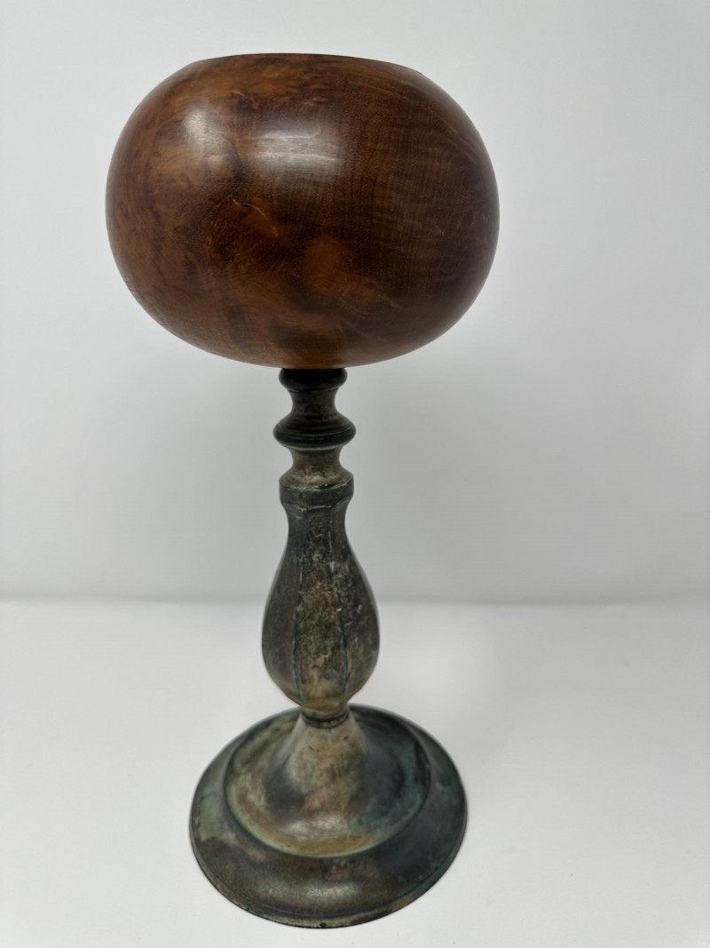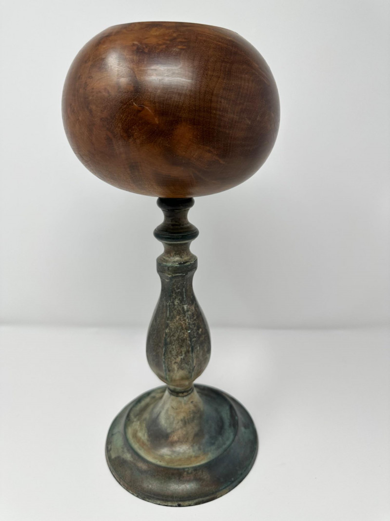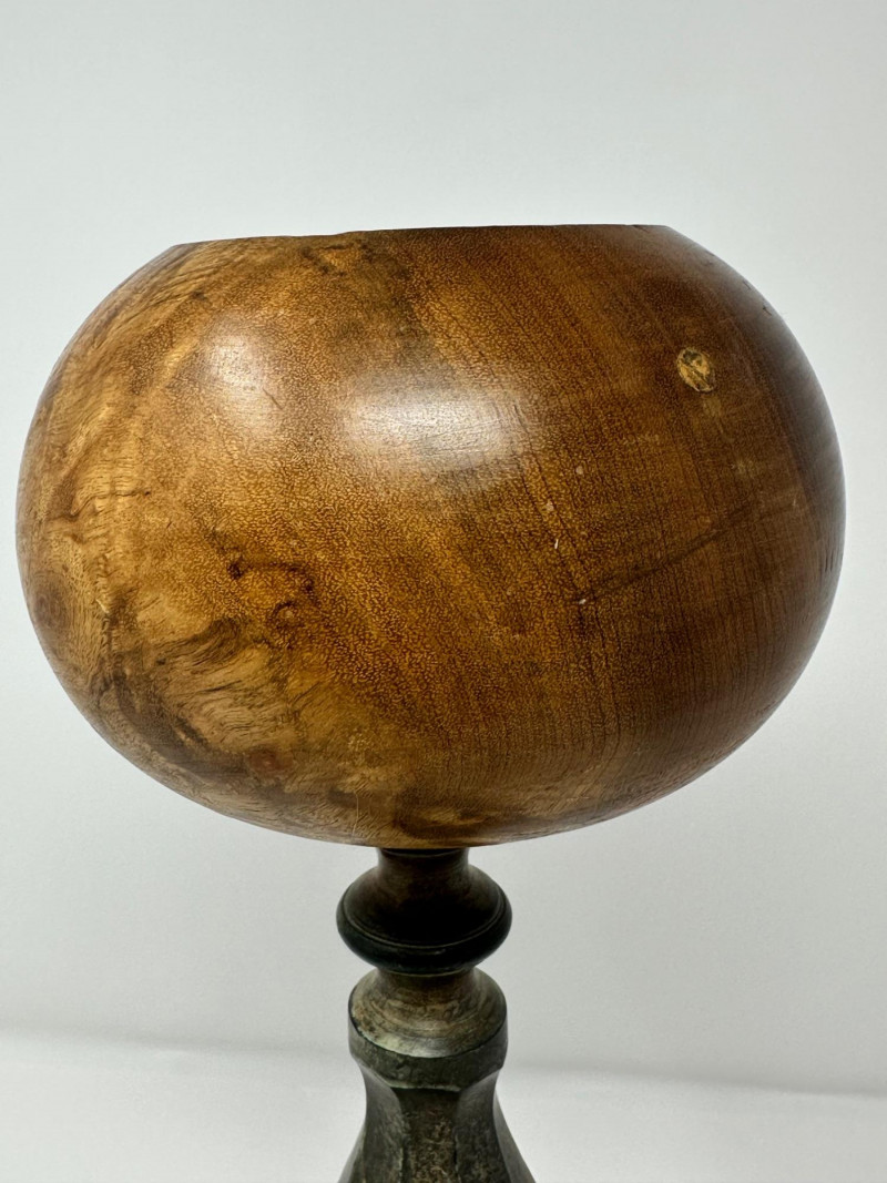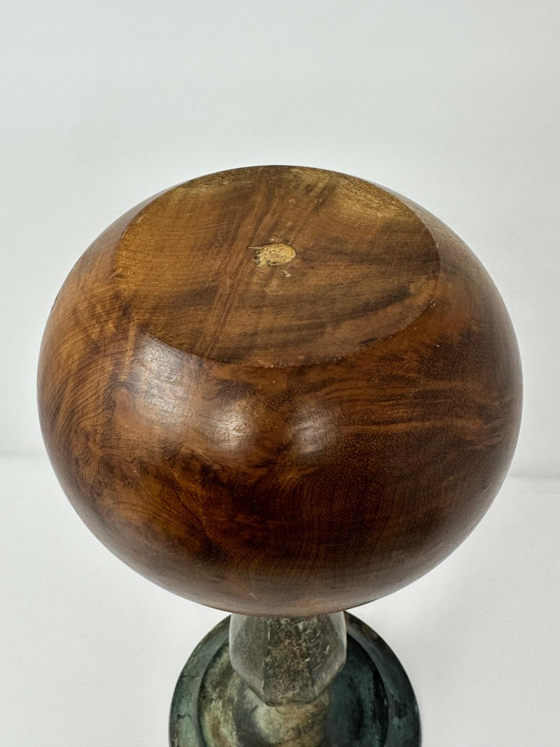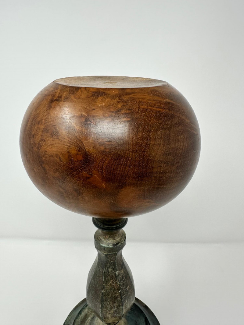 An antique hat stand featuring a turned wooden top with rich visible grain, set on a patinated metal stem and circular base. The warm, polished wood contrasts beautifully with the aged metal, giving the piece a rustic, old-world character. Likely used to rest and shape hats in a millinery or dressing room, its goblet-like form is both sculptural and functional. Description