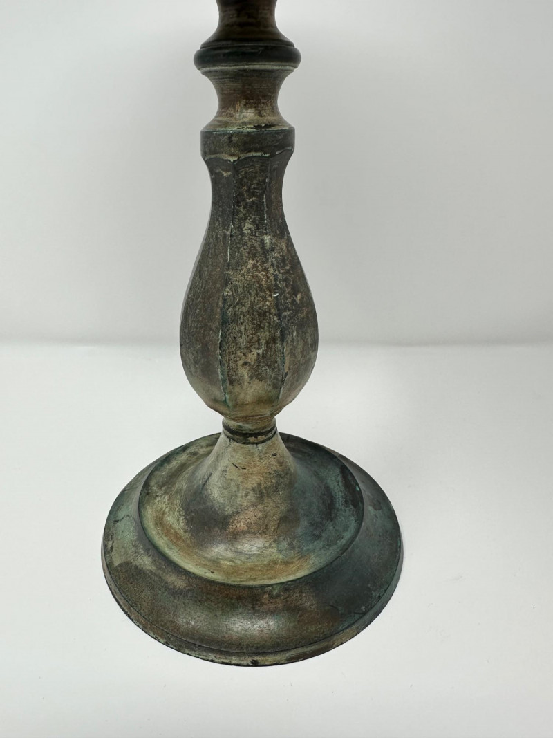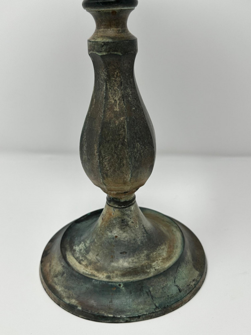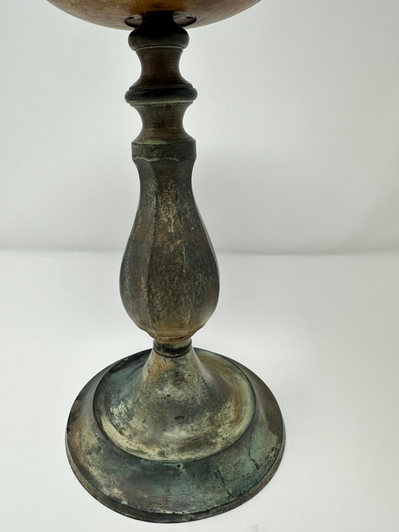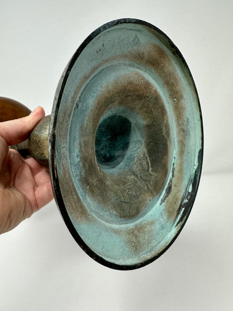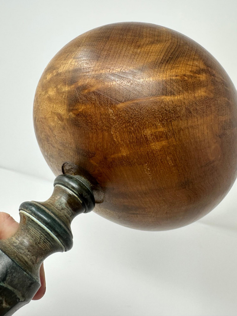 An antique hat stand featuring a turned wooden top with rich visible grain, set on a patinated metal stem and circular base. The warm, polished wood contrasts beautifully with the aged metal, giving the piece a rustic, old-world character. Likely used to rest and shape hats in a millinery or dressing room, its goblet-like form is both sculptural and functional. Description