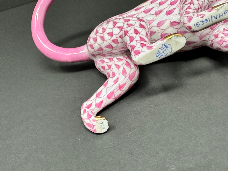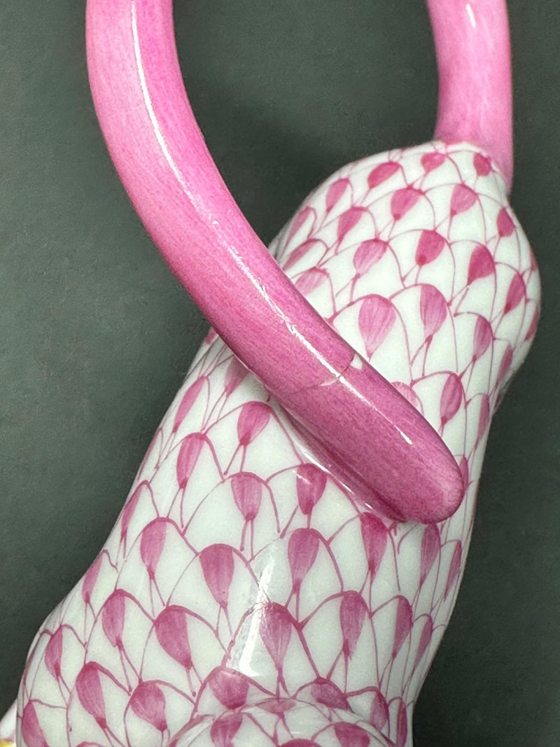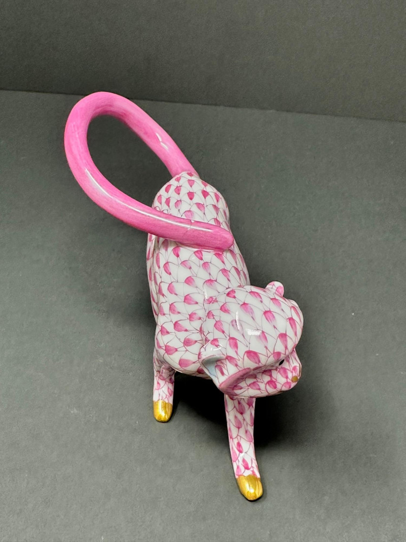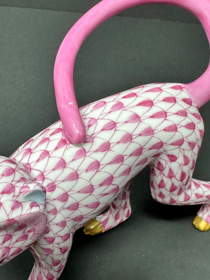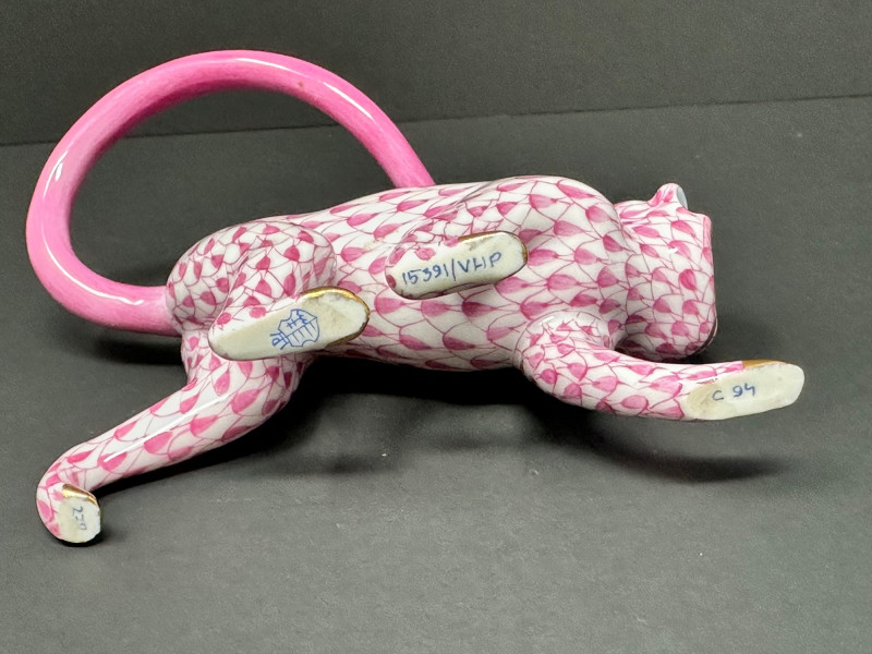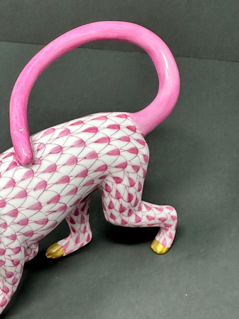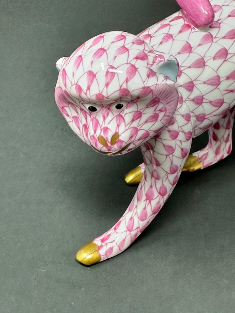 Charming and collectible Herend porcelain monkey in the signature pink fishnet design with hand-painted gold accents. Features a curved pink tail and expressive pose. ******Please note-tail was repaired, see photos. *****