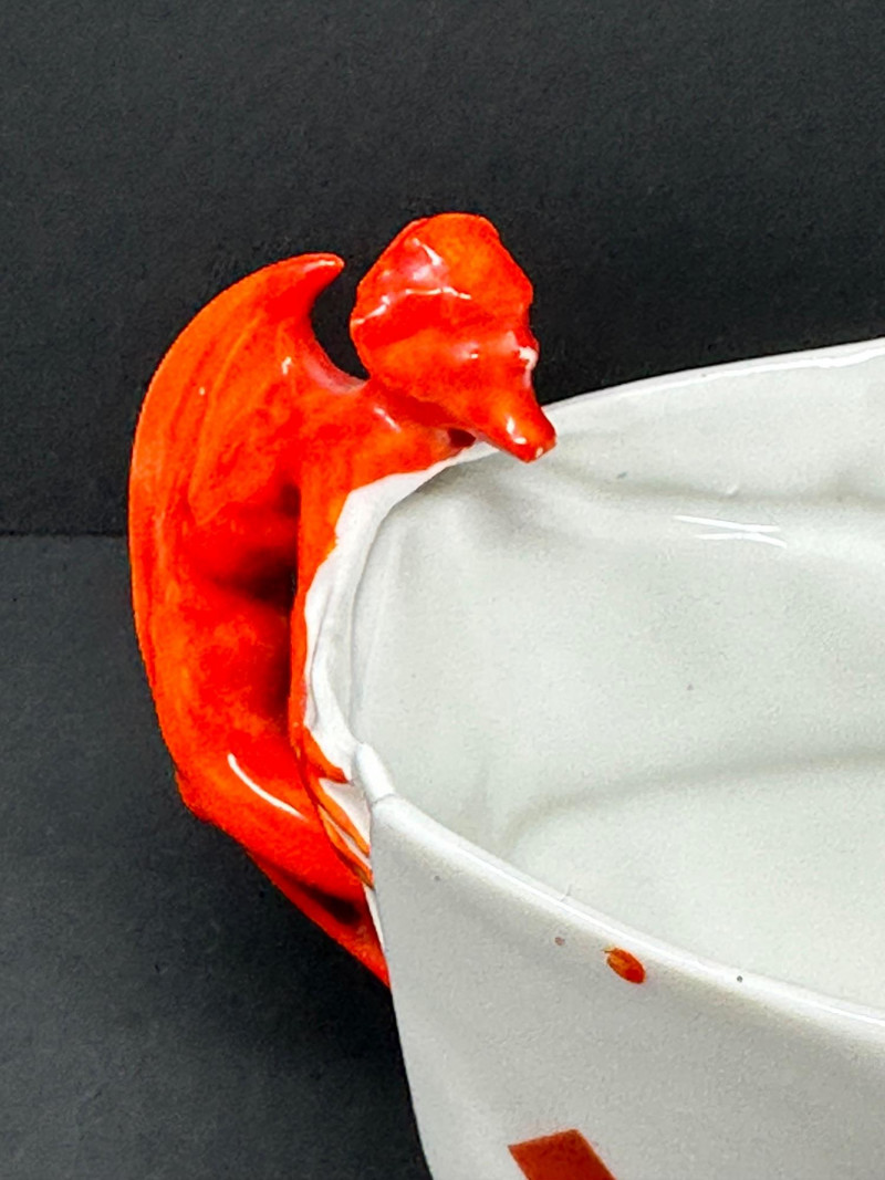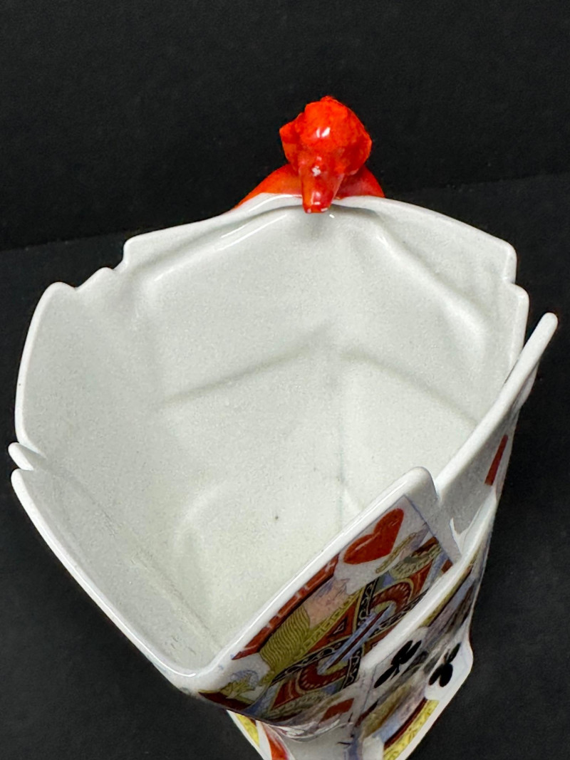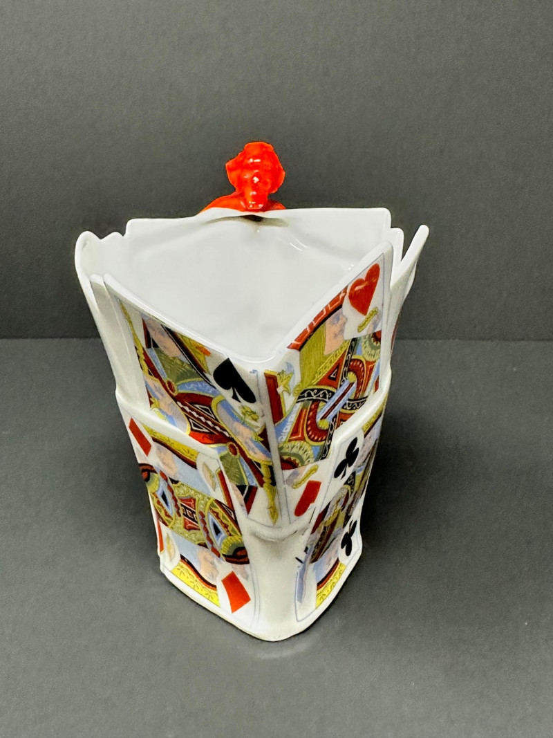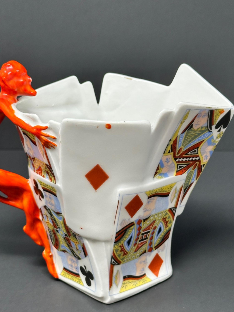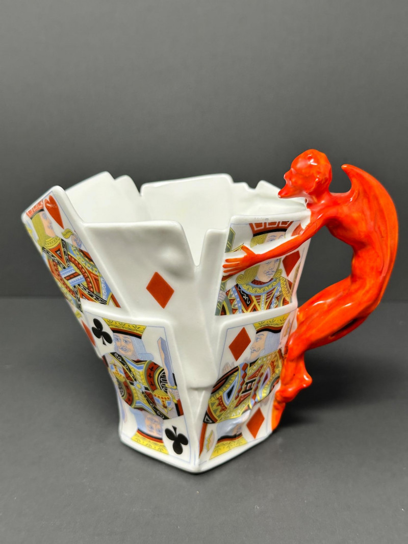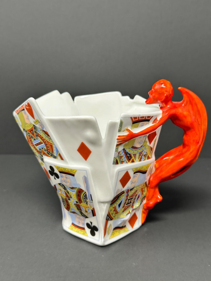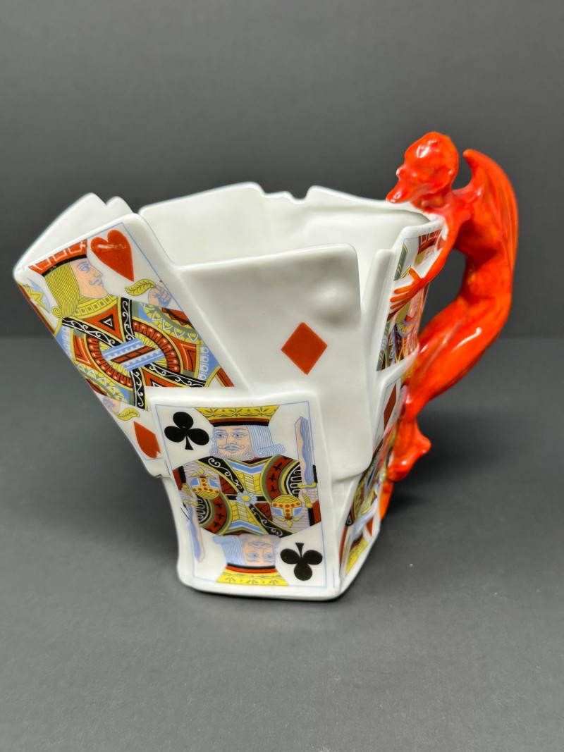 A rare and visually striking figural creamer by Royal Bayreuth, featuring a sculpted stack of playing cards adorned with vivid Kings and Queens from multiple suits. The jagged rim mimics overlapping cards, while the handle is formed by a bright red devil figure clinging dramatically to the side — a signature motif of Royal Bayreuth’s whimsical and collectible porcelain.