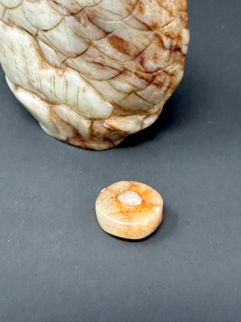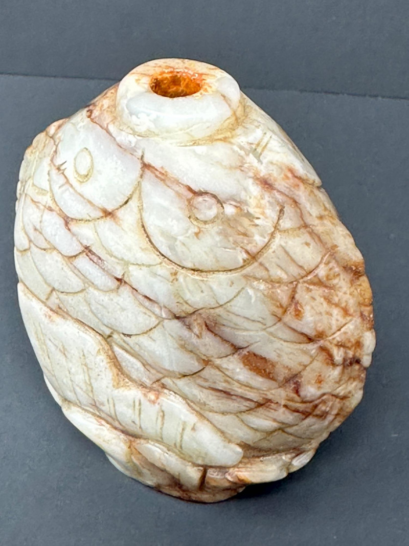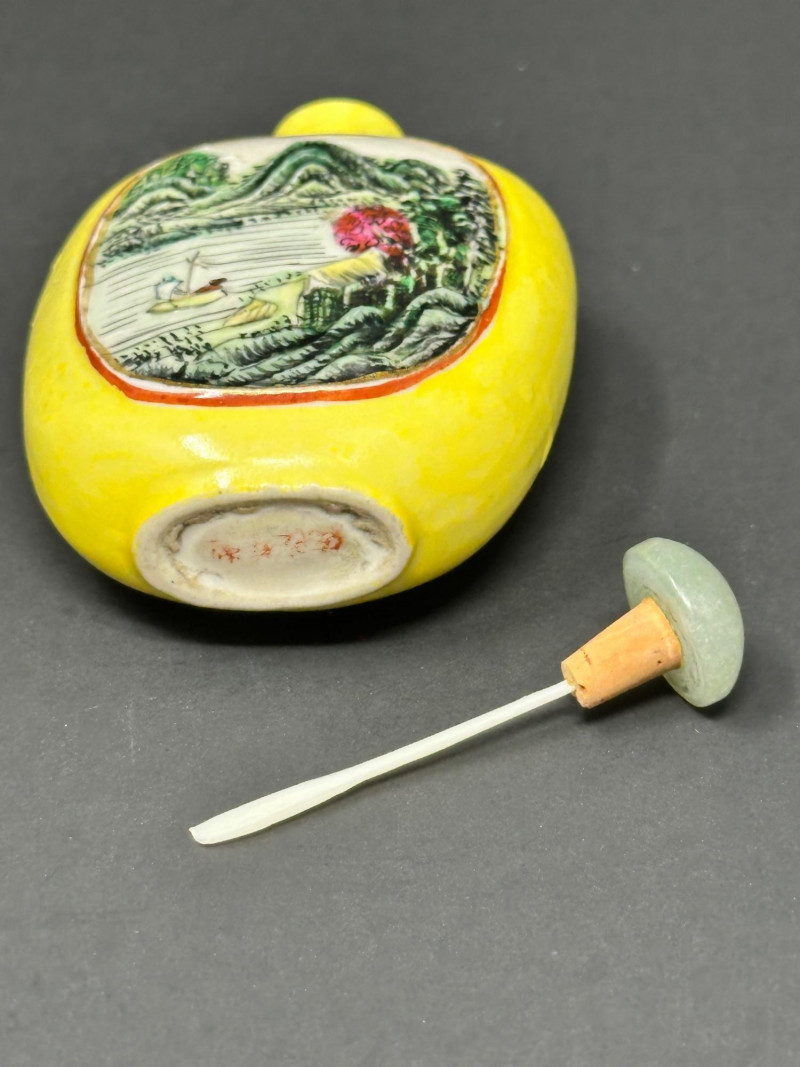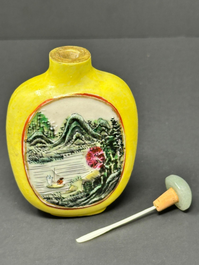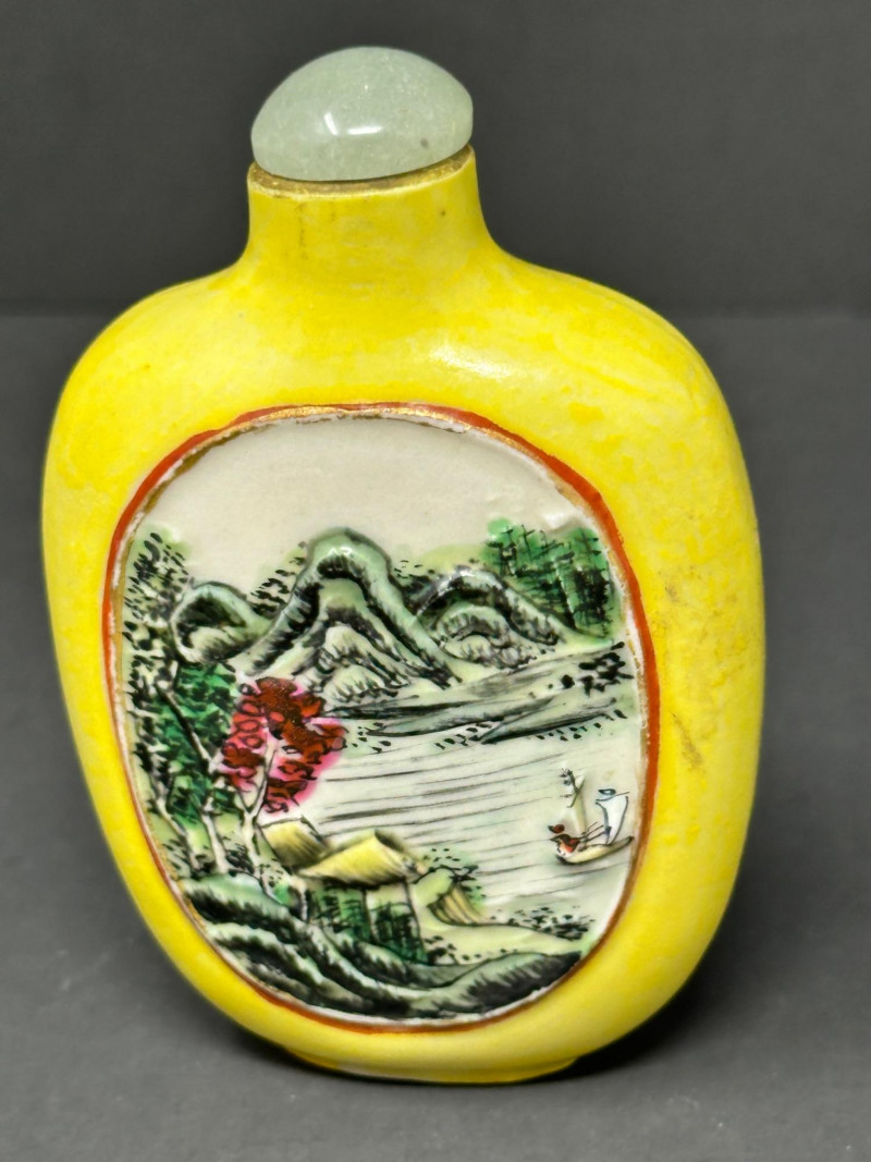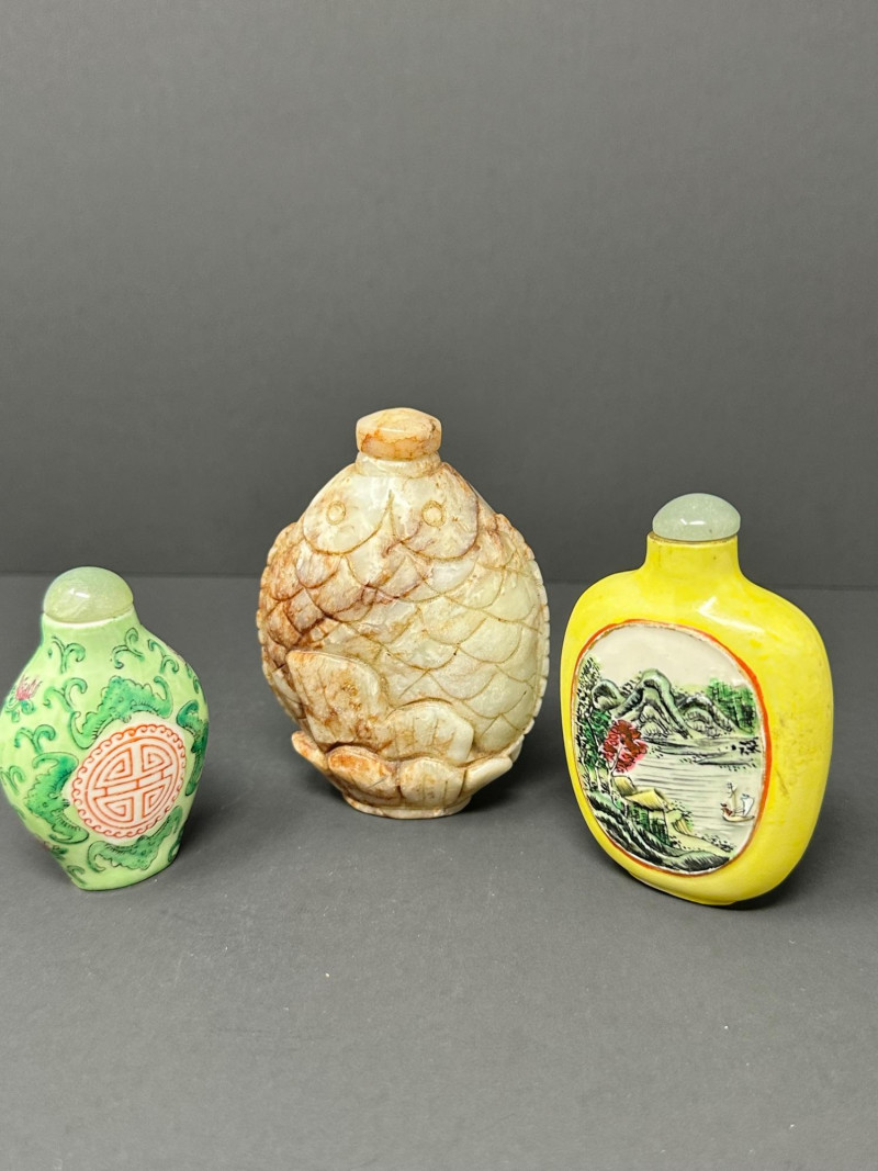A charming group of three Chinese snuff bottles, each showcasing a different traditional decorative style: Bottle 1 (Left): Porcelain bottle with a green glaze and raised swirling motifs, accented by a red geometric medallion. Bold color contrast and sculptural surface detail give it strong visual presence. 3"Tall Bottle 2 (Center): Hand‑carved stone snuff bottle in the form of a stylized fish. The textured, scale‑like surface and organic shaping highlight the artisan’s carving skill. Warm natural tones add to its tactile appeal. 4" Tall Bottle 3 (Right): Yellow porcelain snuff bottle featuring a finely painted riverside scene with a reclining figure, trees, and water. Classic imagery associated with Chinese landscape painting. 3.5" Tall
