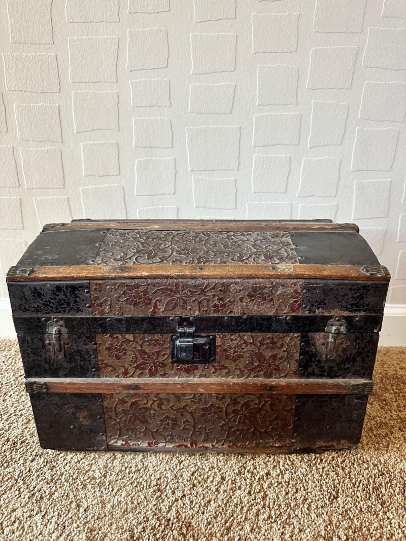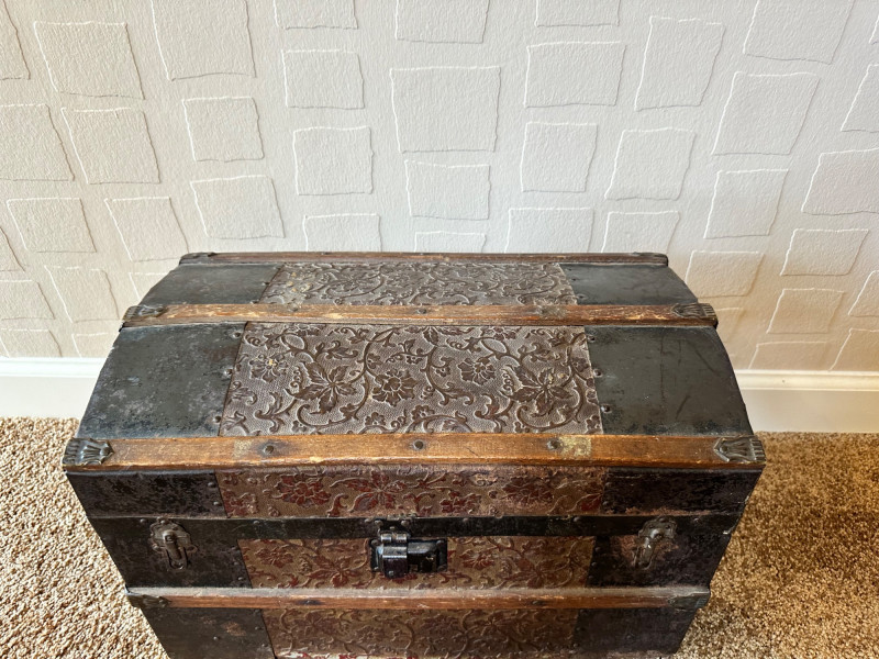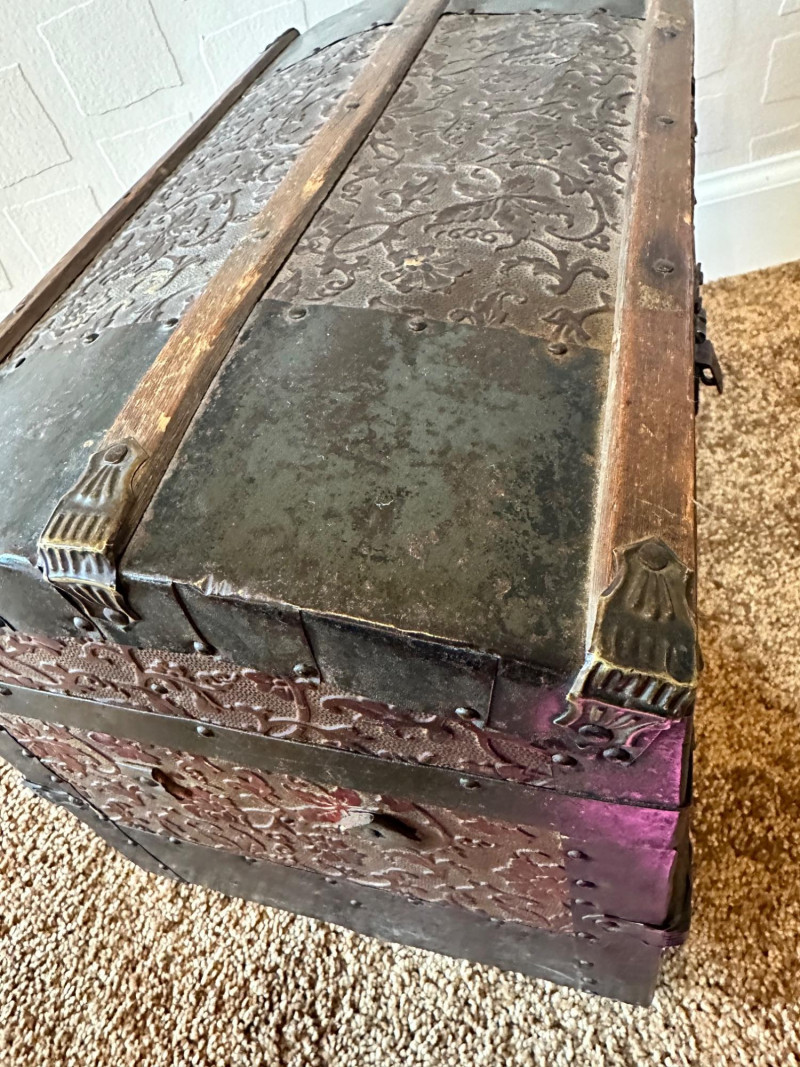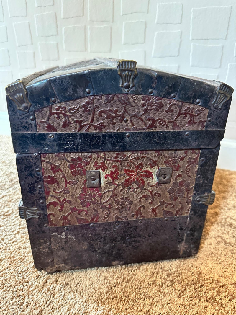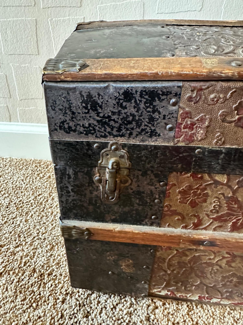 Lot # 27 - Antique Small Steamer Trunk – Embossed Floral Panels & Metal Hardware