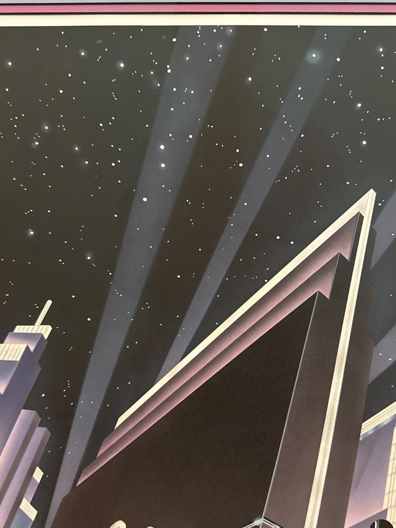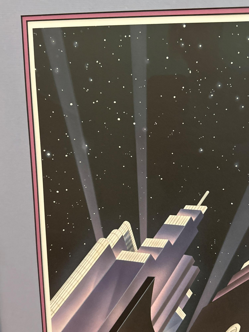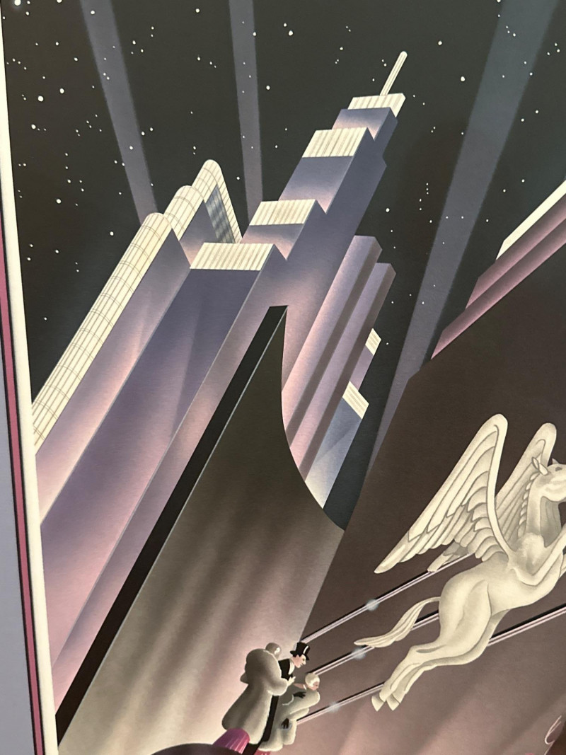 A dramatic Art Deco–inspired print by artist Robert Hopp, pencil signed in the lower right margin. The composition features a winged Pegasus ascending through a fantastical architectural landscape, guided by formally dressed figures. Towering geometric buildings, sweeping staircases, and radiant beams of light evoke a sense of grandeur and celestial movement, set against a starry night sky.