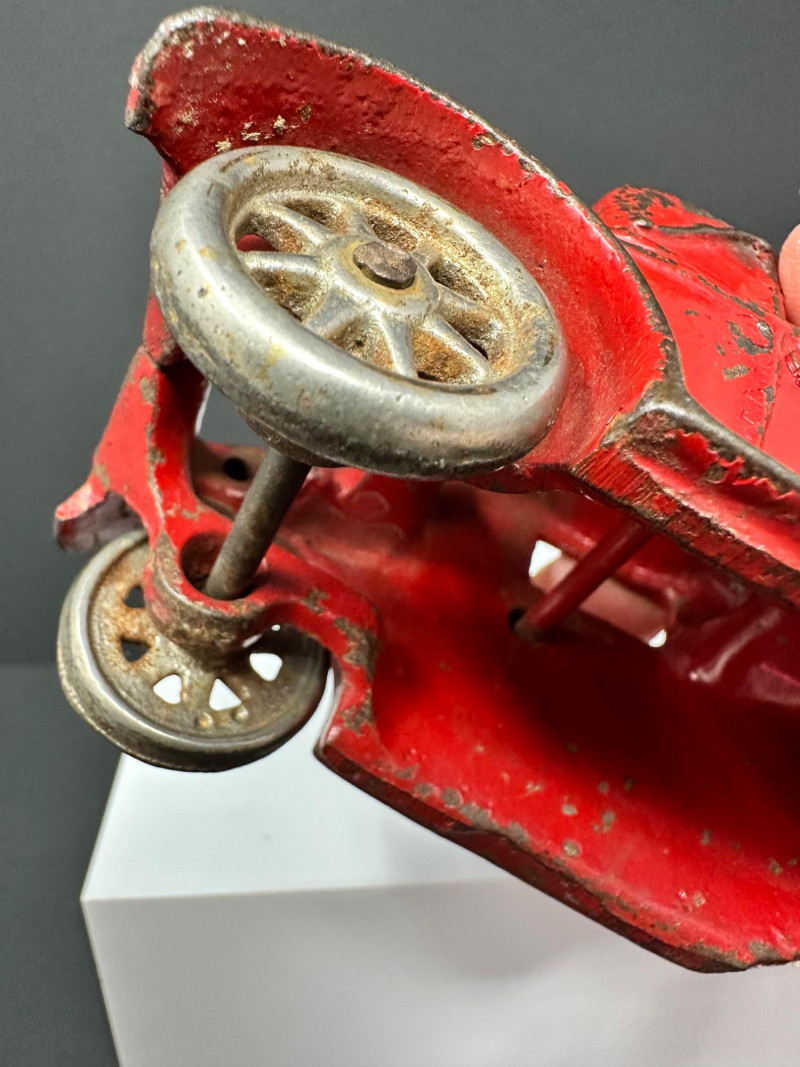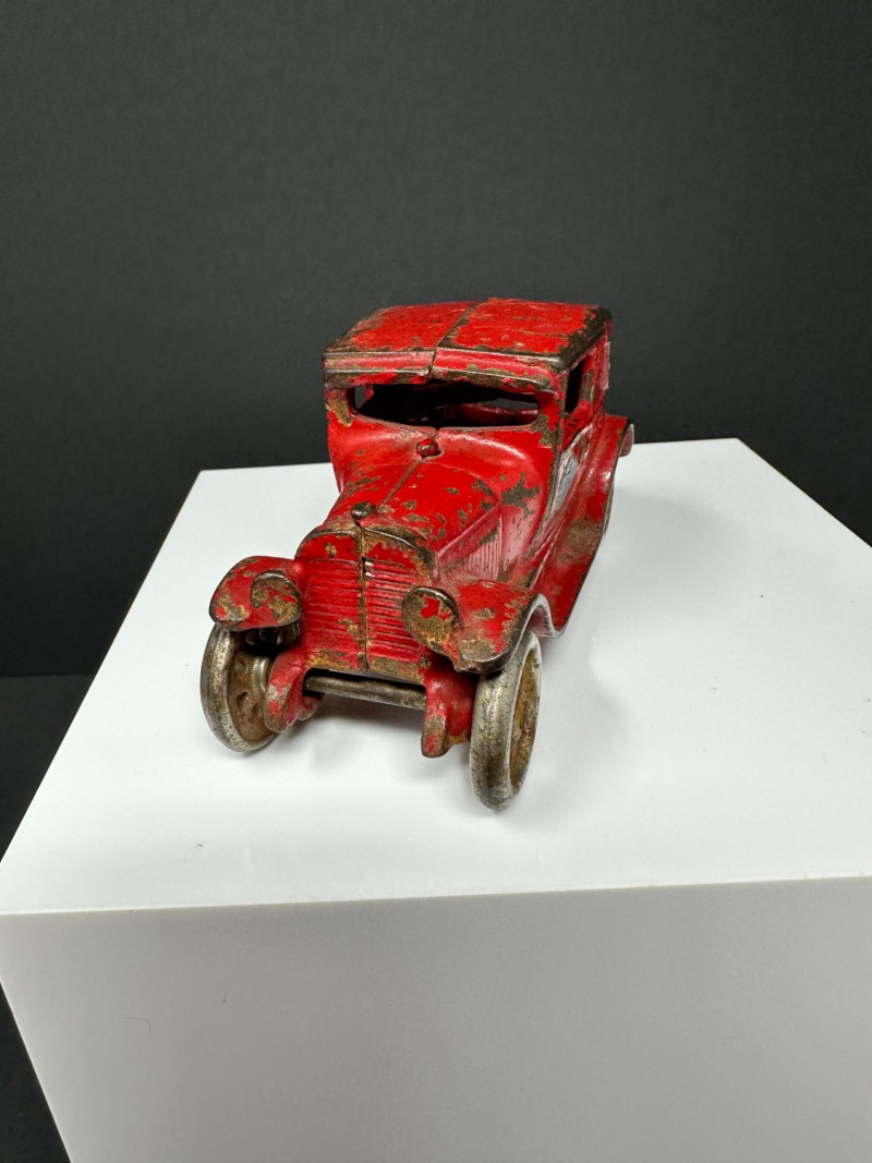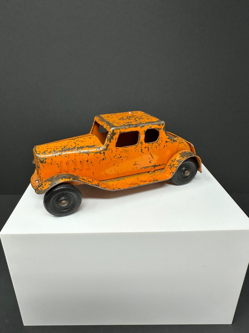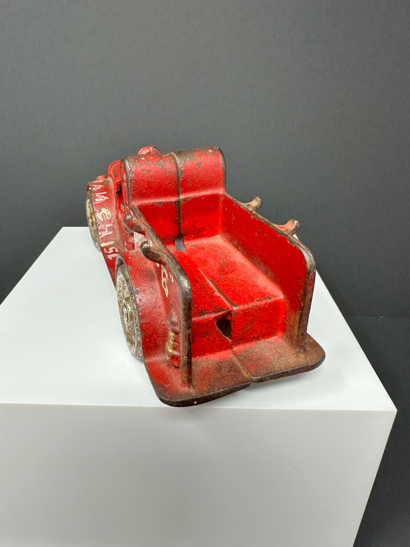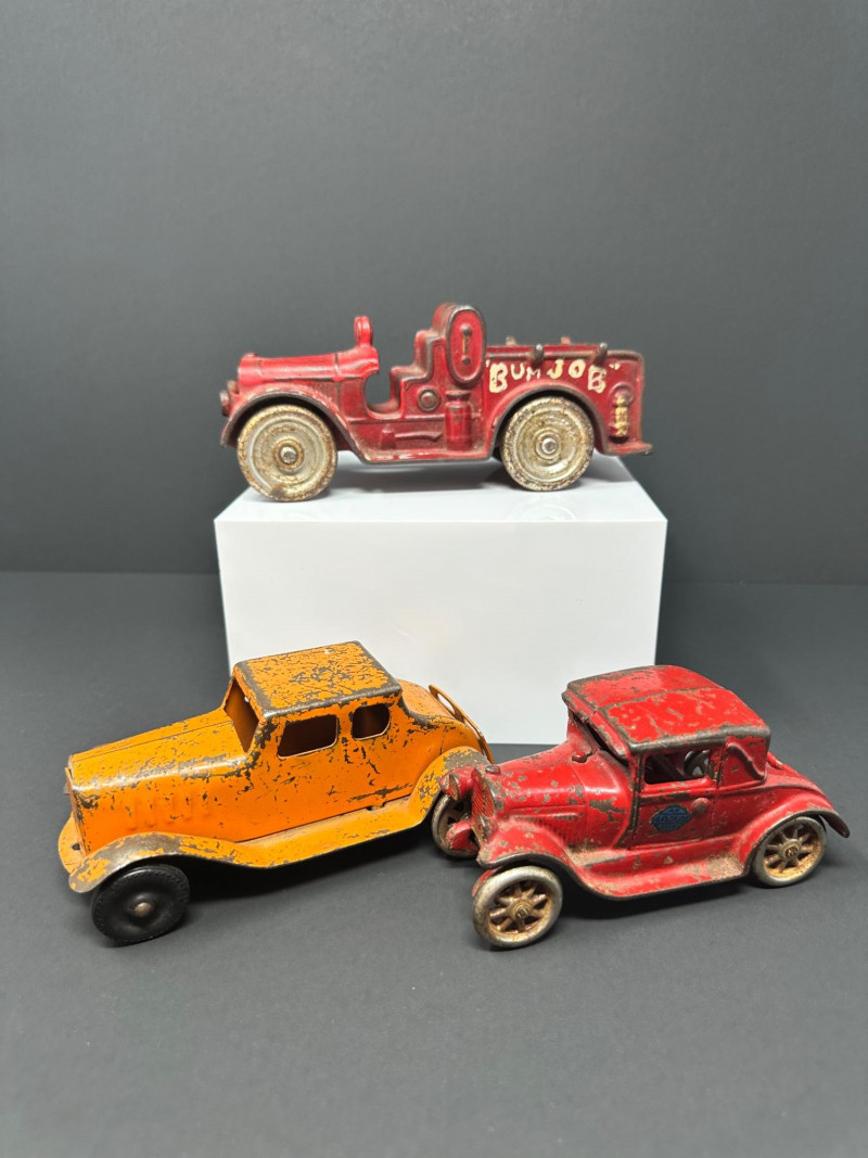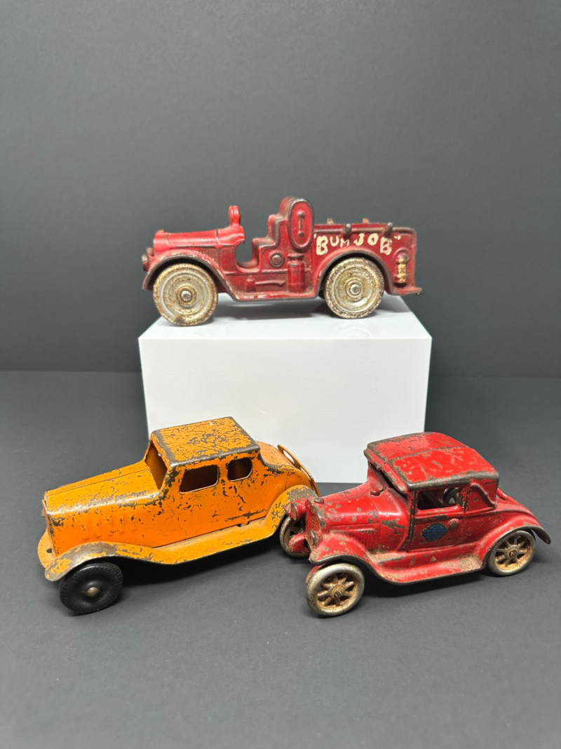 A trio of vintage toy vehicles showcasing early 20th-century craftsmanship and nostalgic charm: Cast Iron Firetruck: A red cast iron firetruck with classic open-cab styling and molded details, reflecting the rugged durability of early American toy manufacturing. 7 x 2 Cast Iron Coupe: A red cast iron car with roofed body and stylized wheels, likely modeled after a 1920s–30s coupe. Solid and weighty, with aged surface wear consistent with play and display. 5" Pressed Metal Roadster: An orange metal roadster with a sleeker profile and lighter construction. Features include a rounded body and visible signs of use, adding to its vintage character.
