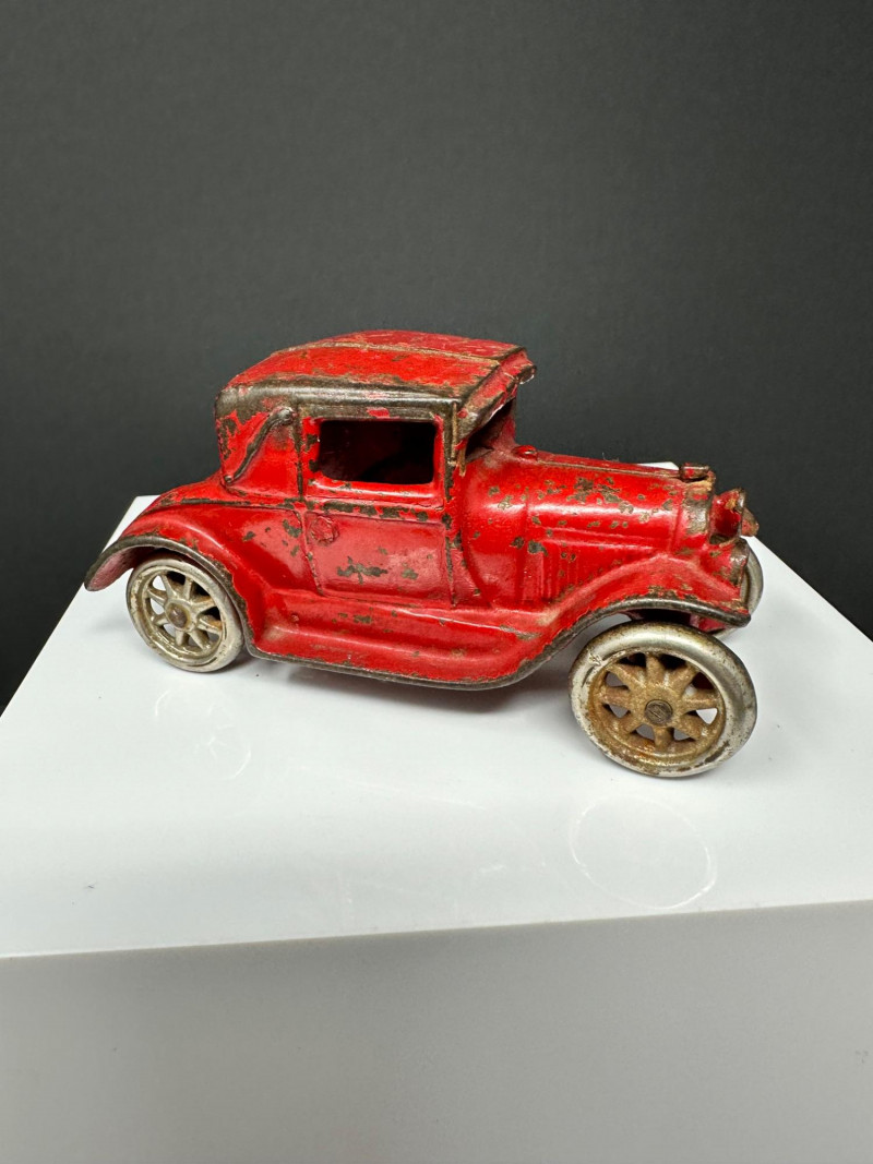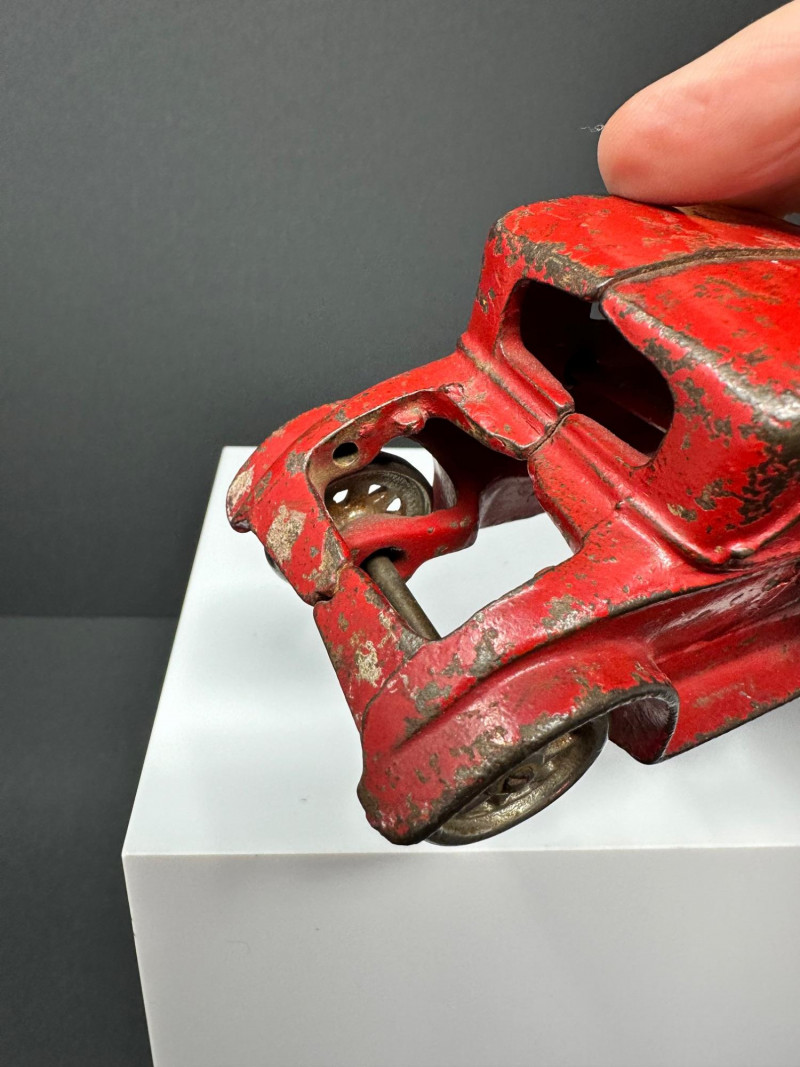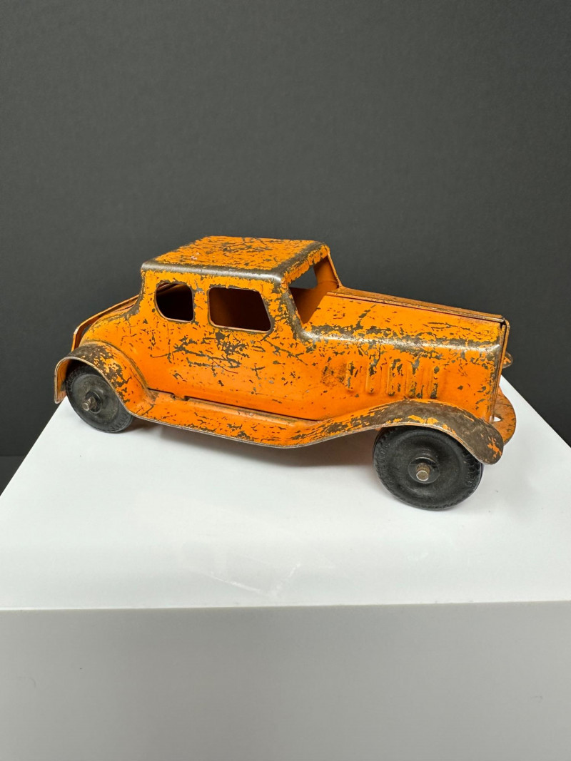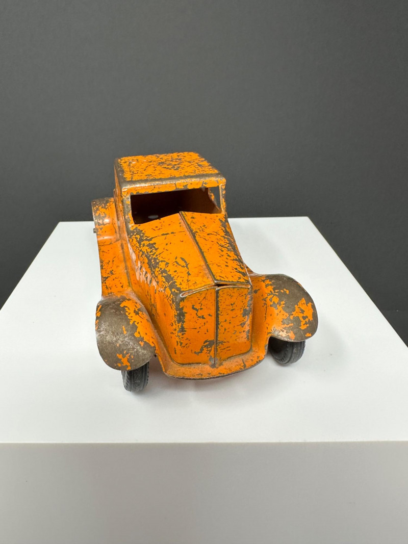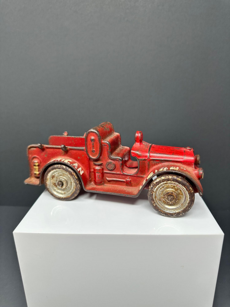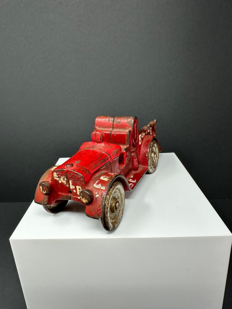 A trio of vintage toy vehicles showcasing early 20th-century craftsmanship and nostalgic charm: Cast Iron Firetruck: A red cast iron firetruck with classic open-cab styling and molded details, reflecting the rugged durability of early American toy manufacturing. 7 x 2 Cast Iron Coupe: A red cast iron car with roofed body and stylized wheels, likely modeled after a 1920s–30s coupe. Solid and weighty, with aged surface wear consistent with play and display. 5" Pressed Metal Roadster: An orange metal roadster with a sleeker profile and lighter construction. Features include a rounded body and visible signs of use, adding to its vintage character.