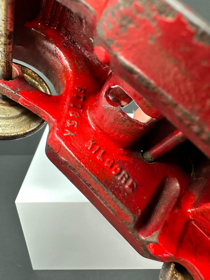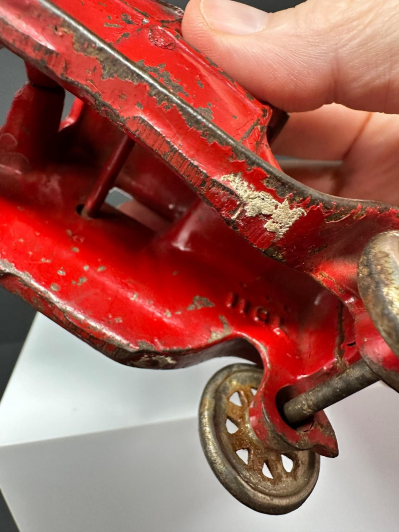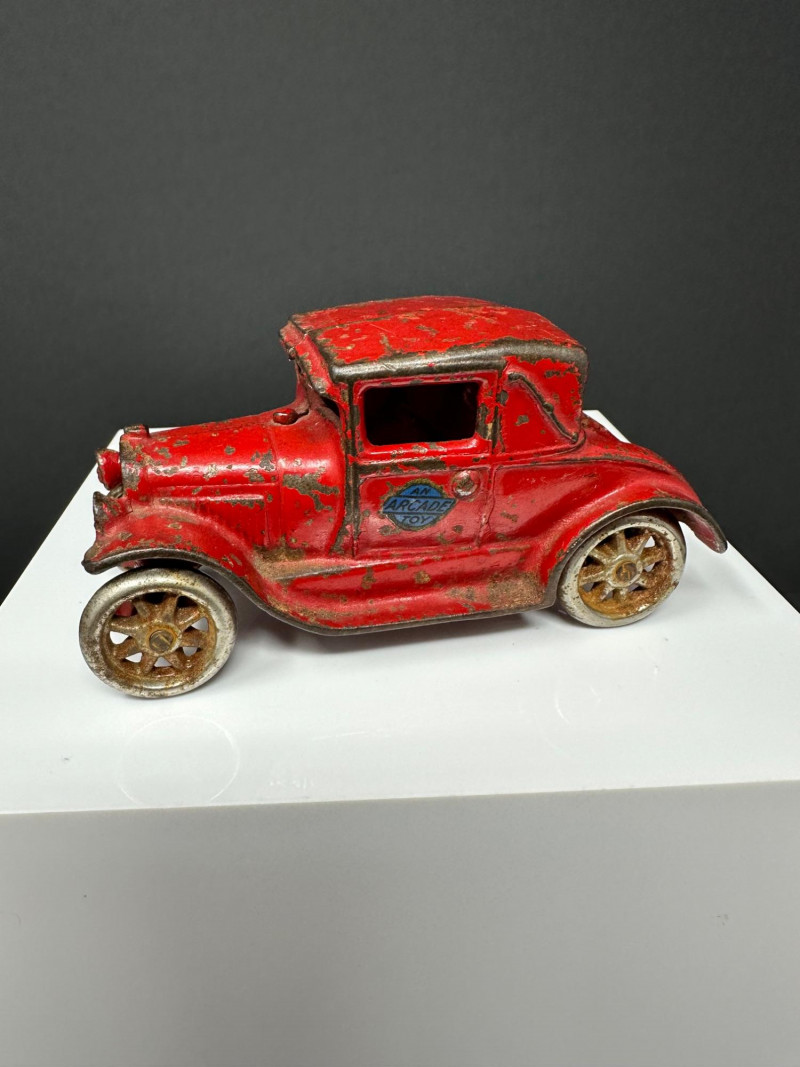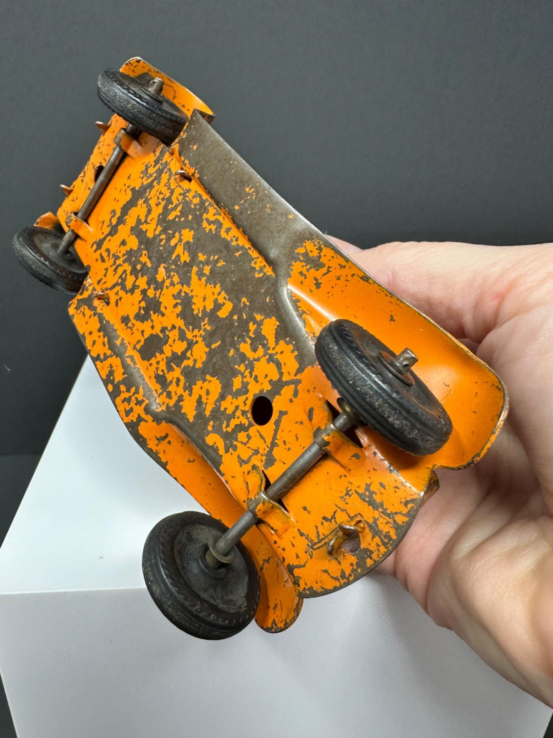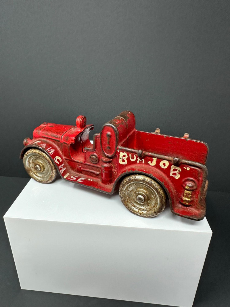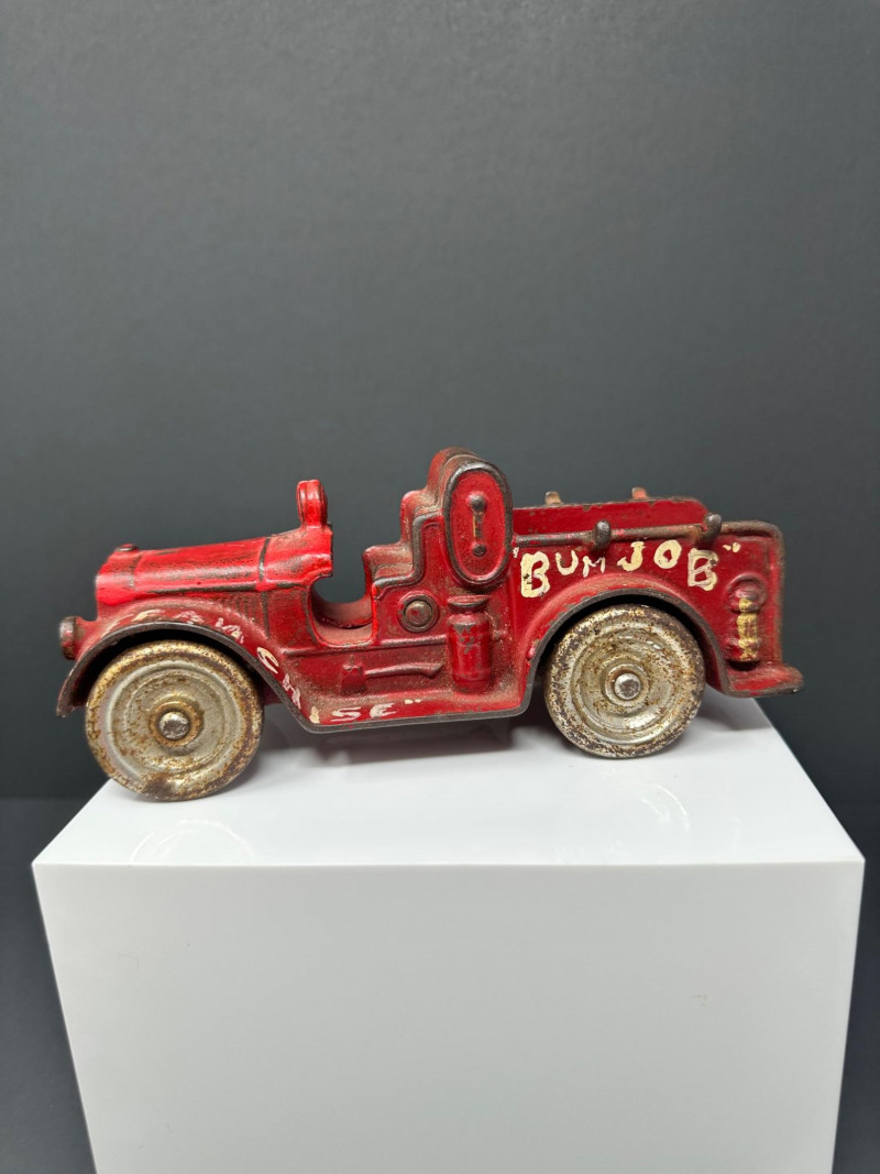 A trio of vintage toy vehicles showcasing early 20th-century craftsmanship and nostalgic charm: Cast Iron Firetruck: A red cast iron firetruck with classic open-cab styling and molded details, reflecting the rugged durability of early American toy manufacturing. 7 x 2 Cast Iron Coupe: A red cast iron car with roofed body and stylized wheels, likely modeled after a 1920s–30s coupe. Solid and weighty, with aged surface wear consistent with play and display. 5" Pressed Metal Roadster: An orange metal roadster with a sleeker profile and lighter construction. Features include a rounded body and visible signs of use, adding to its vintage character.
