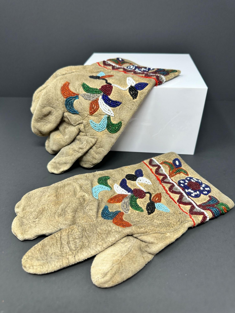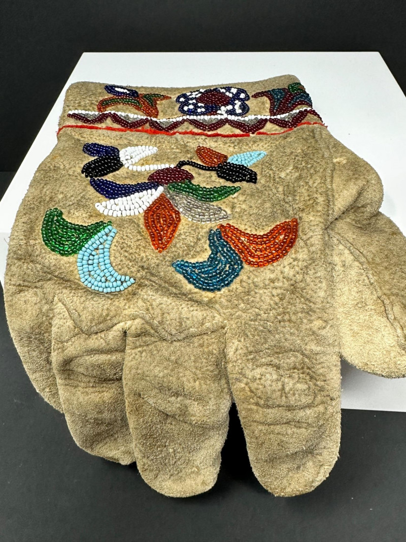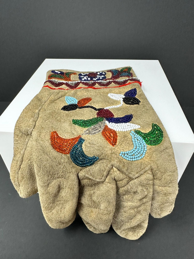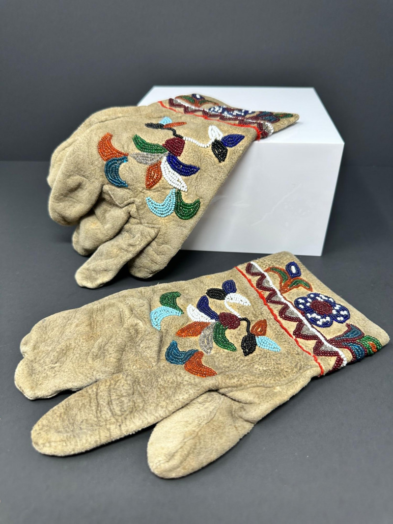 A beautifully preserved pair of antique Sioux woman’s gloves, hand-stitched from soft beige leather and adorned with vibrant glass beadwork. The floral and abstract motifs are rendered in rich hues of red, blue, green, orange, white, and black, showcasing traditional Plains artistry and symbolic design. Each glove features symmetrical beaded panels with fine detailing, reflecting both cultural heritage and exceptional craftsmanship. Likely dating to the early 20th century, these gloves were made for ceremonial or dress use and remain a striking example of Native American textile and beadwork traditions. Ideal for collectors of indigenous art, ethnographic textiles, or historic regalia.