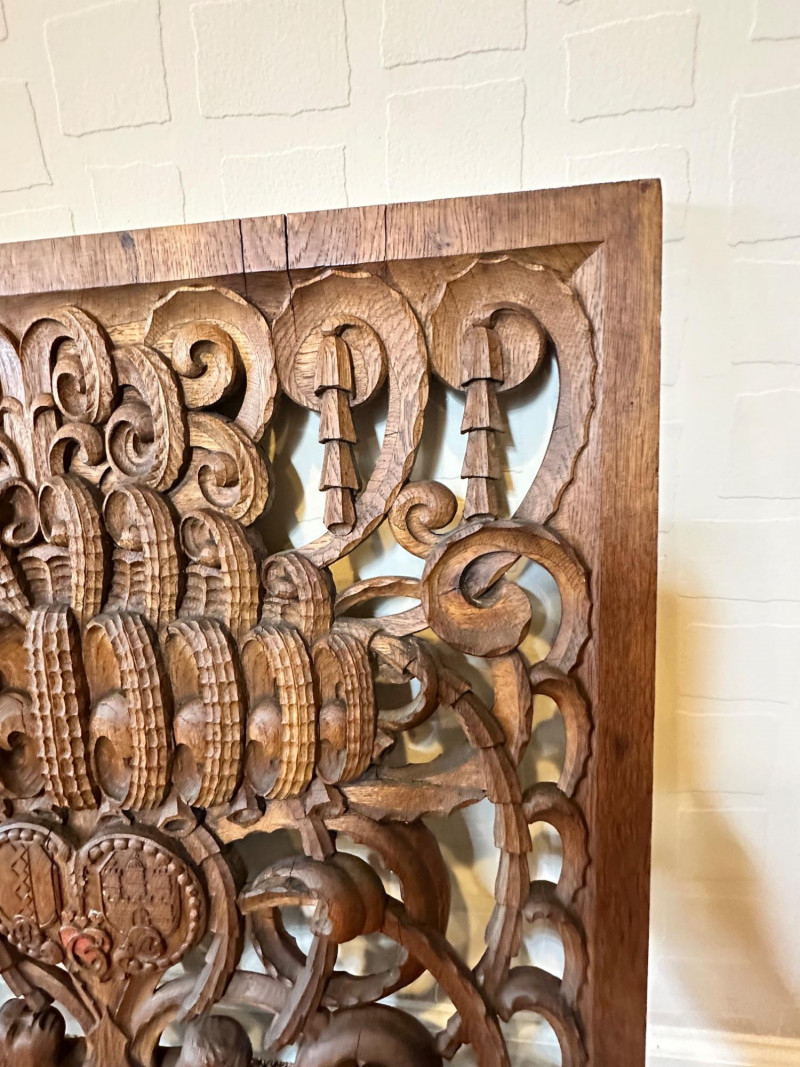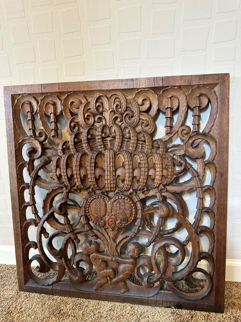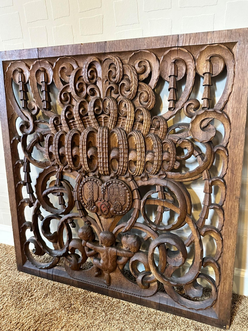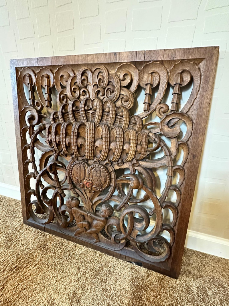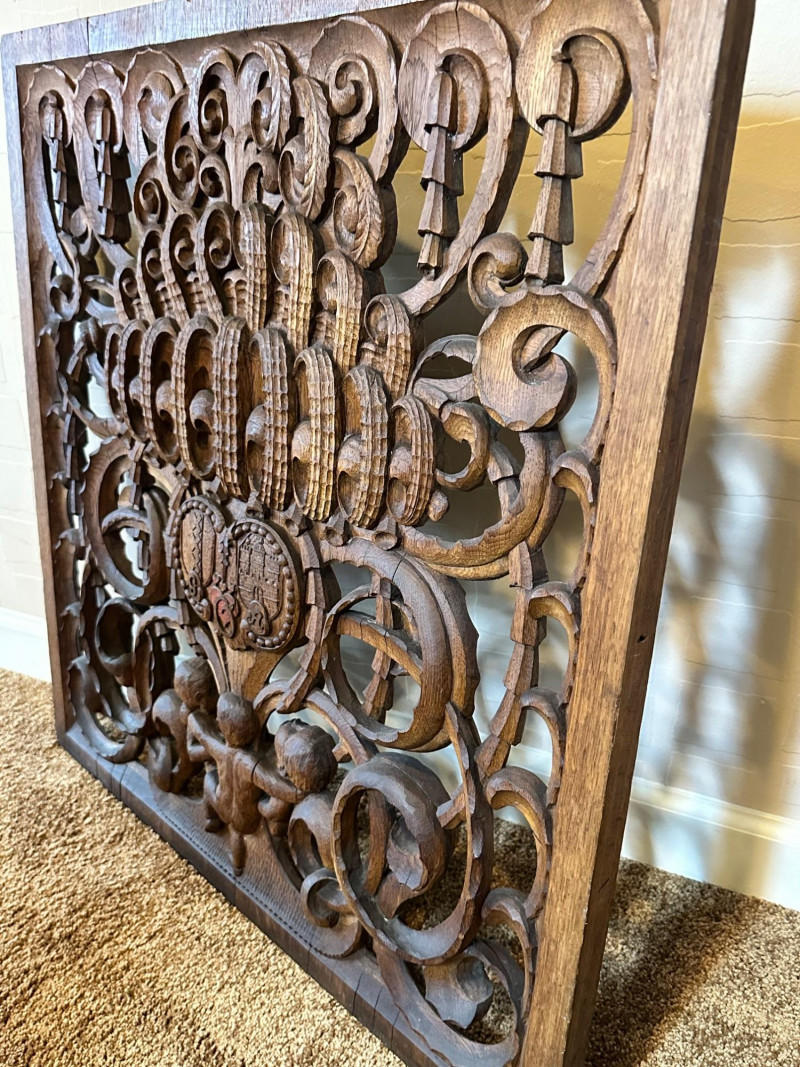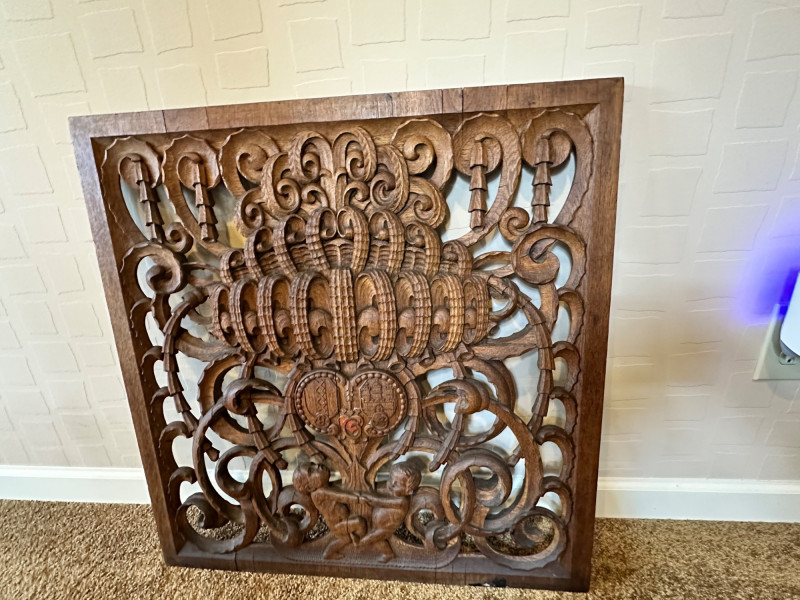 Lot # 41 - Hand-Carved Solid Wood Panel – Crown, Heart & Figures Motif