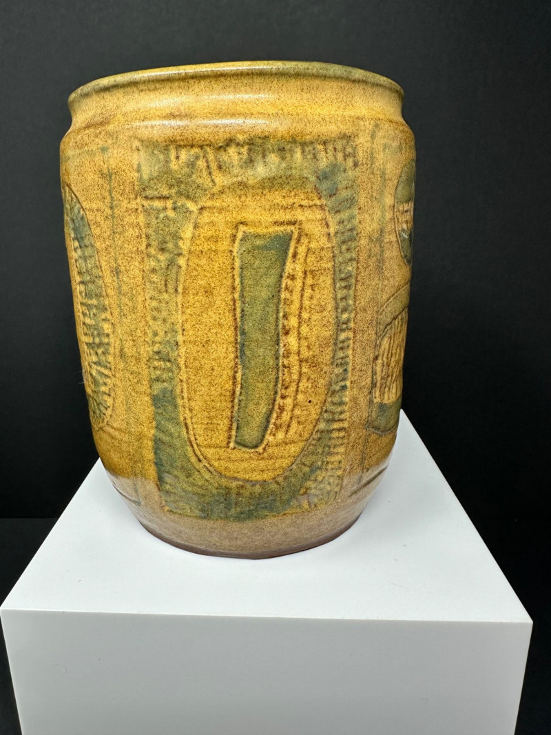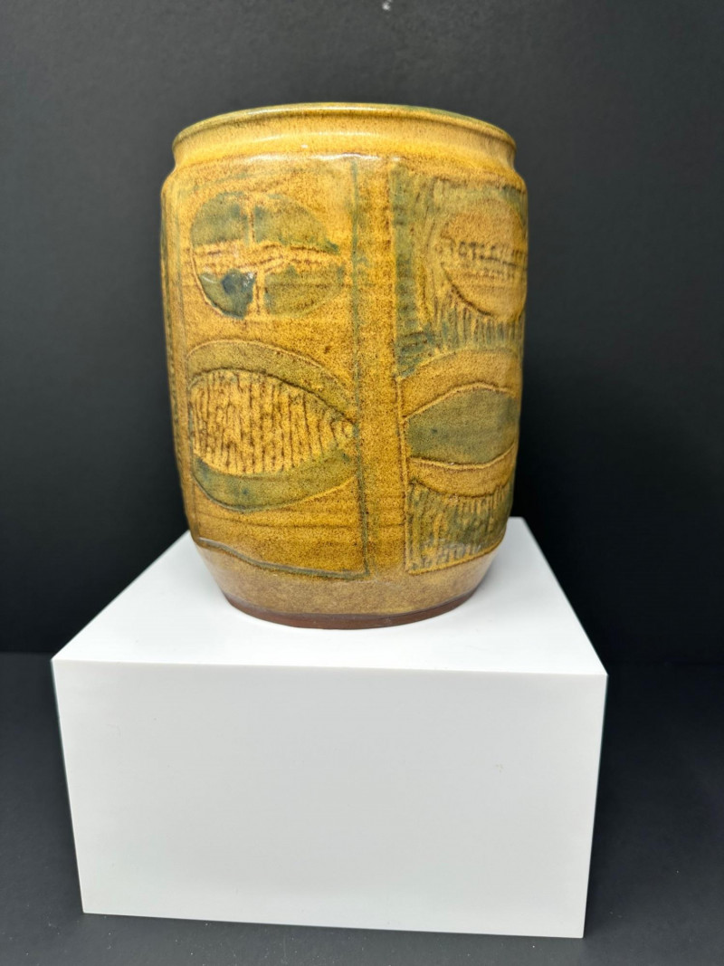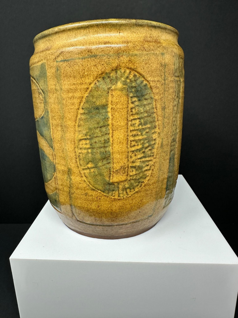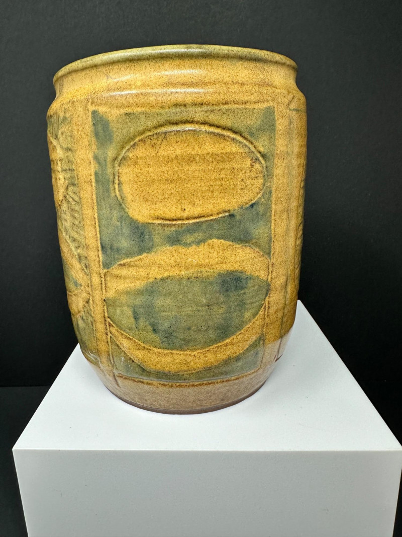 A hand-thrown stoneware pottery vessel with cylindrical form and abstract incised decoration. The surface features carved oval and circular motifs, some with linear textures and faint inscriptions, lending a layered, tactile quality. Glazed in a warm yellow-brown base with greenish accents, the finish evokes natural earth tones and subtle variegation.Description: