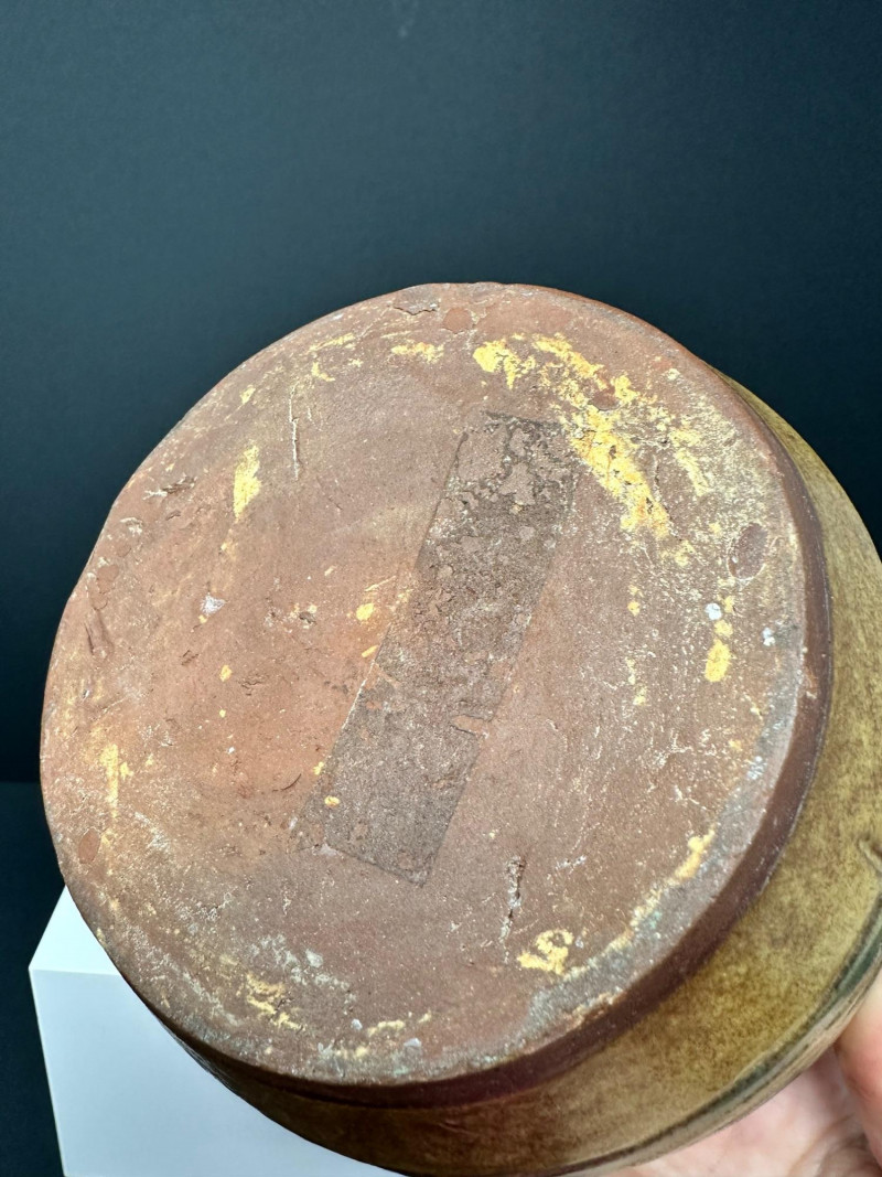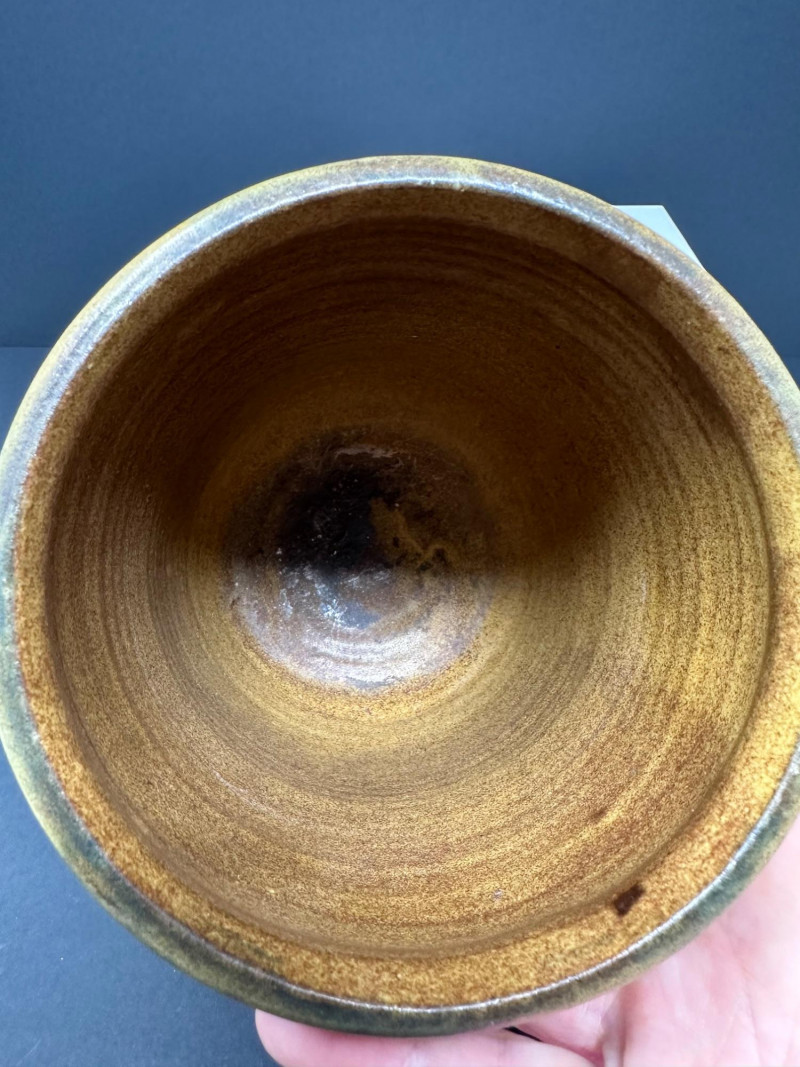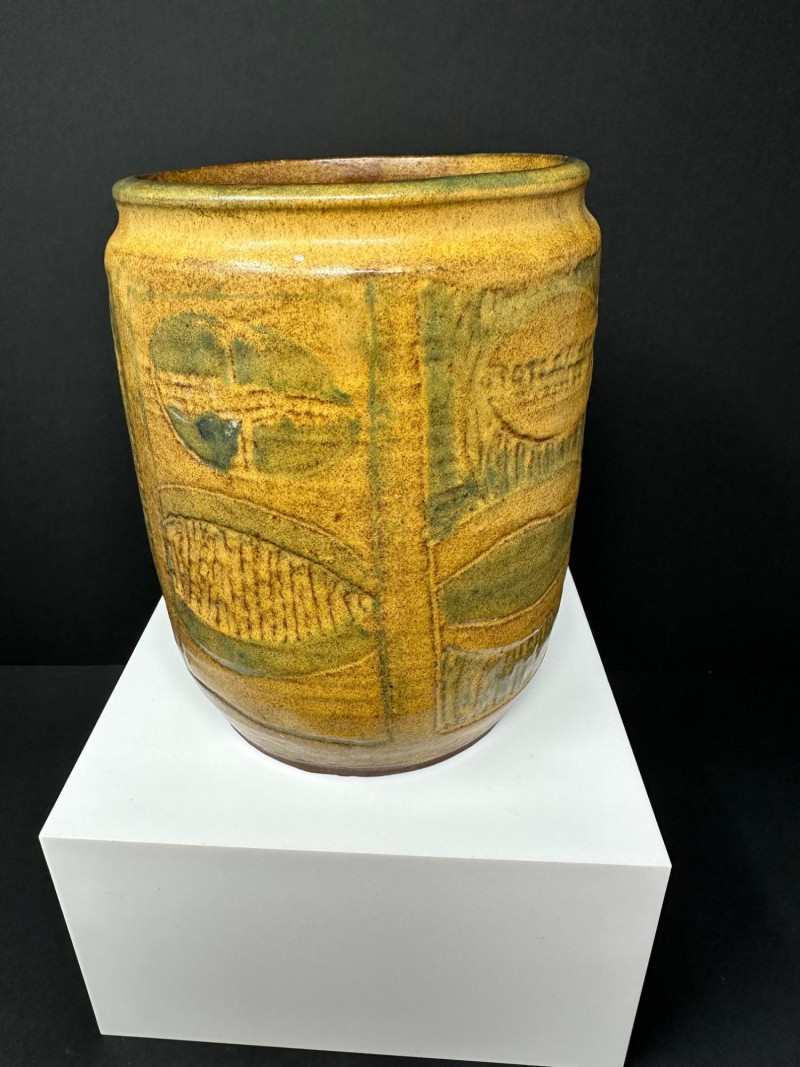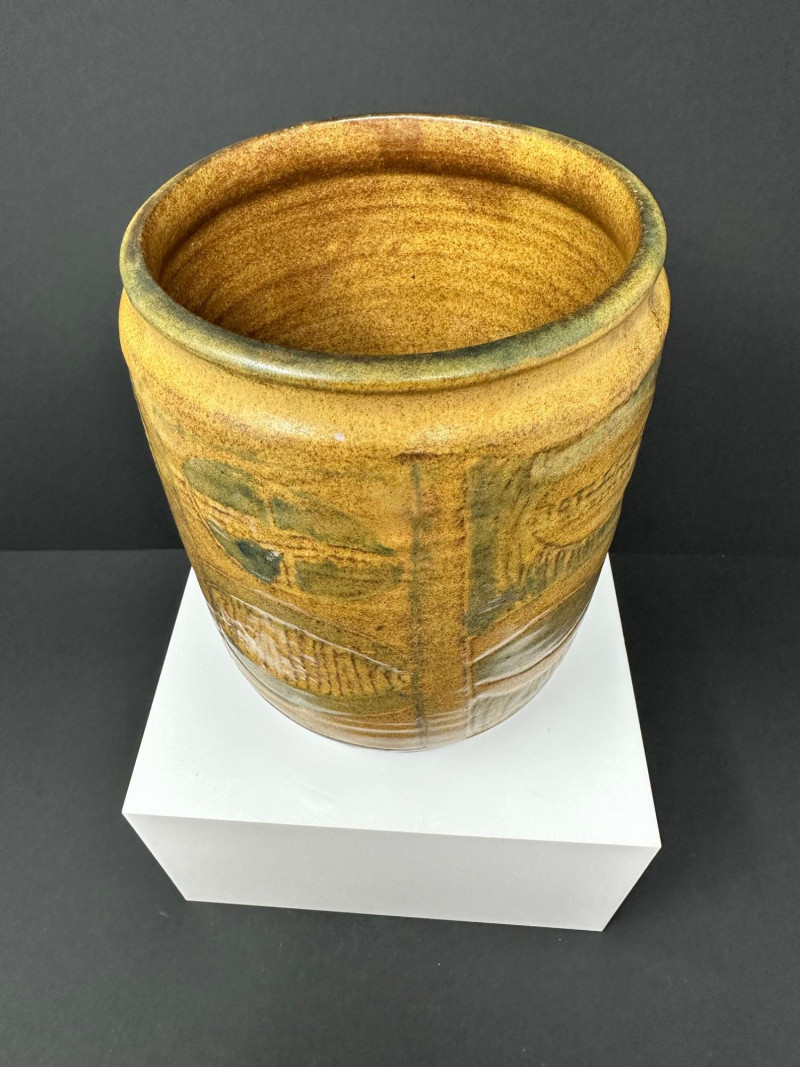A hand-thrown stoneware pottery vessel with cylindrical form and abstract incised decoration. The surface features carved oval and circular motifs, some with linear textures and faint inscriptions, lending a layered, tactile quality. Glazed in a warm yellow-brown base with greenish accents, the finish evokes natural earth tones and subtle variegation.Description:
